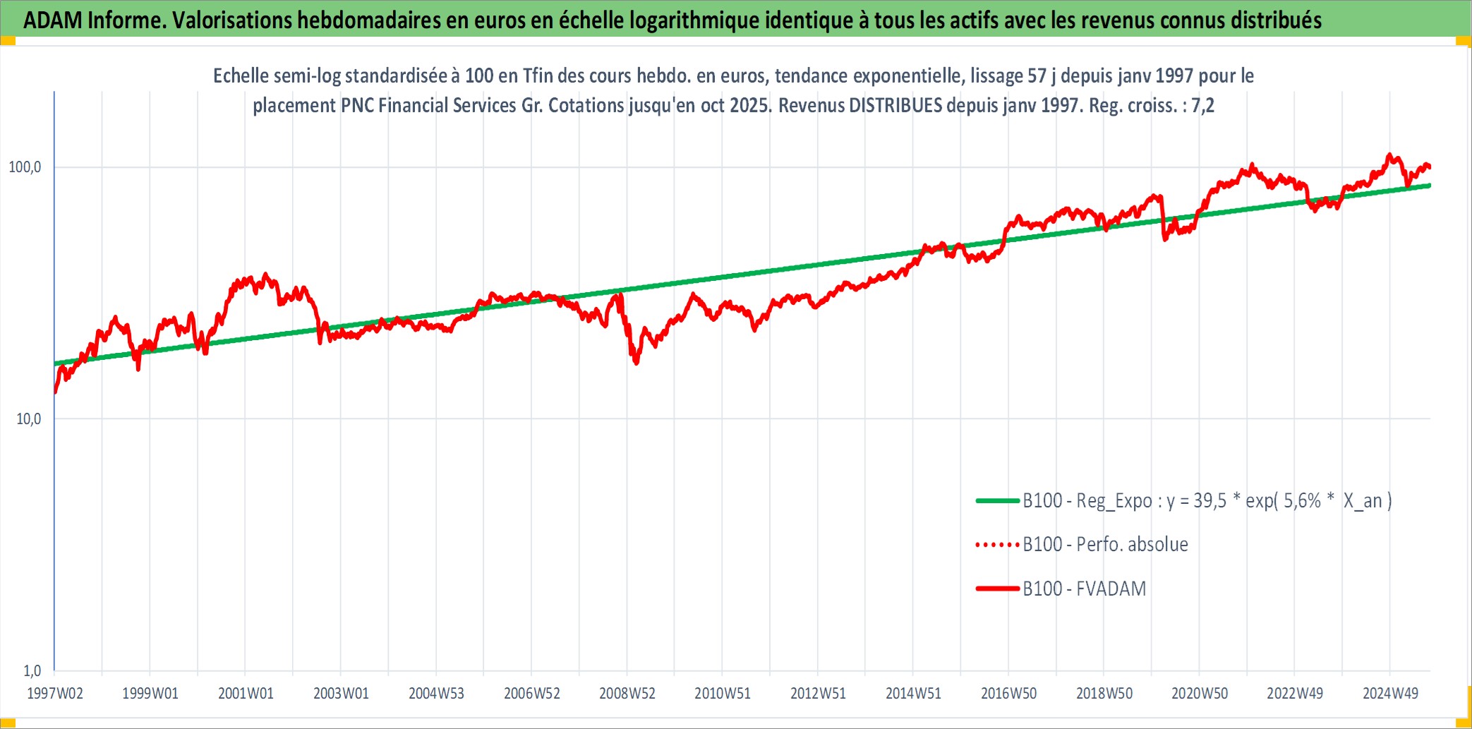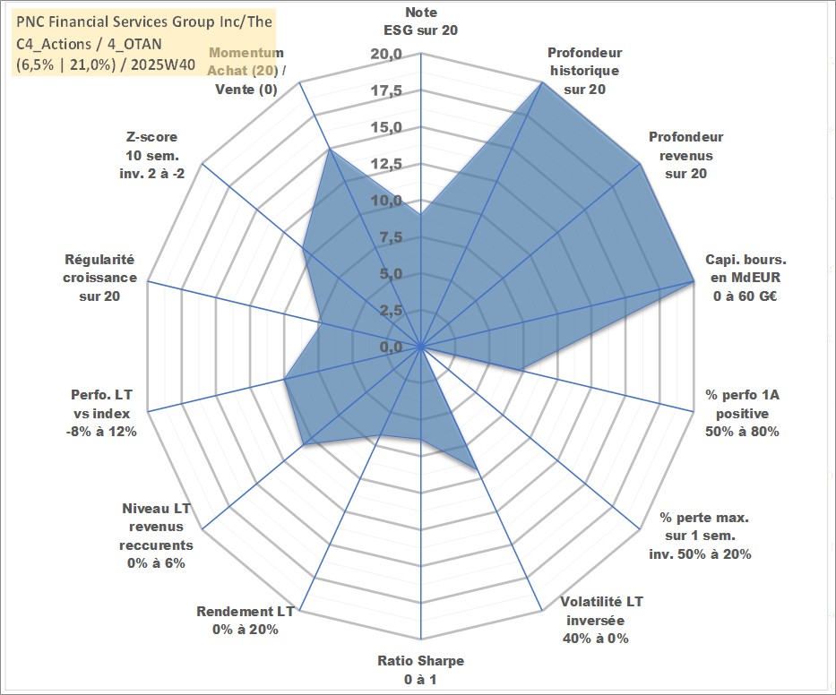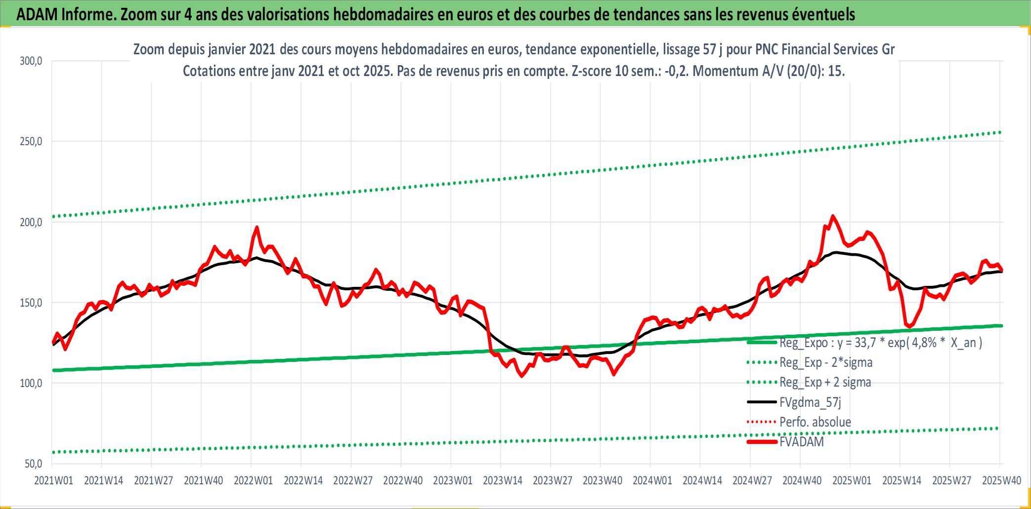 Site dédié aux investisseursPage dédiée sur site financeAnalyse des valorisations hebdomadaires de l'action PNC Financial Services Group Inc/The. Cet actif est cote en USD. Les valorisations sont en contrevaleur EURO et couvrent les semaines 1997W01 a 2025W40. Les revenus de cet actif financier sont pris en compte depuis la semaine 1997W02. La note globale ESG de cet actif est estimee a 9.0 (apres rebasage entre 0 et 20).