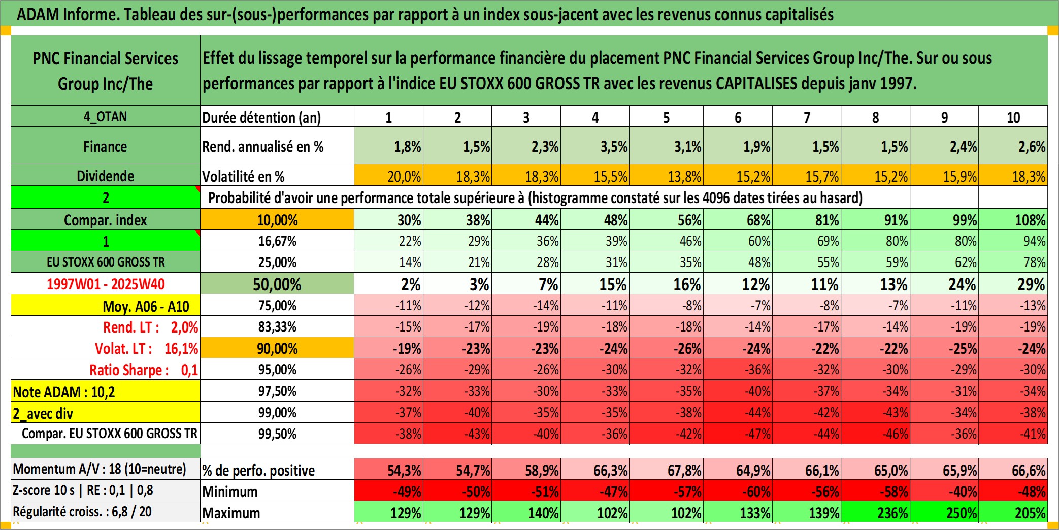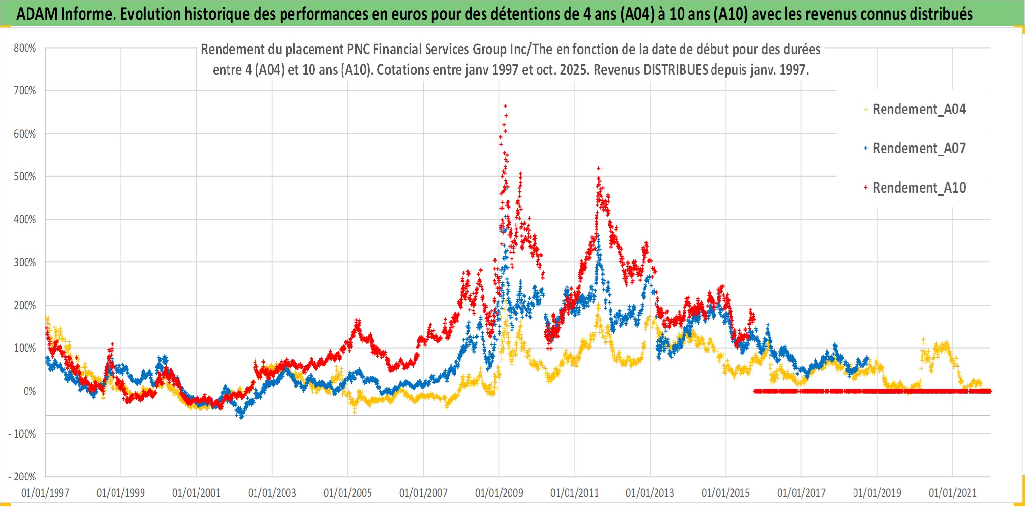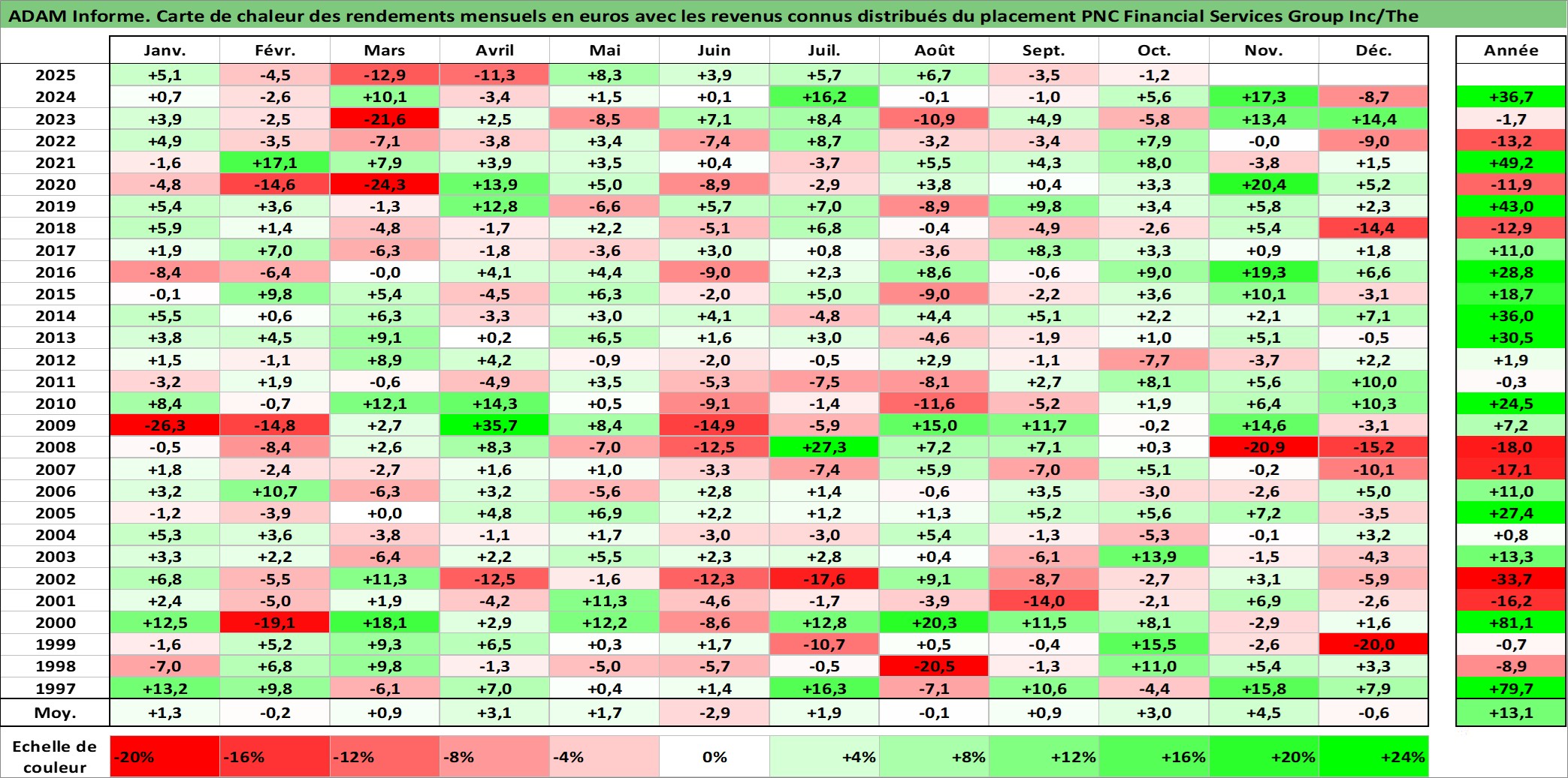 Site dédié aux investisseursPage dédiée sur site financeAnalyse des valorisations hebdomadaires de l'action PNC Financial Services Group Inc/The. Cet actif est cote en USD. Les valorisations sont en contrevaleur EURO et couvrent les semaines 1997W01 a 2025W40. Les revenus de cet actif financier sont pris en compte depuis la semaine 1997W02. La note globale ESG de cet actif est estimee a 9.0 (apres rebasage entre 0 et 20).