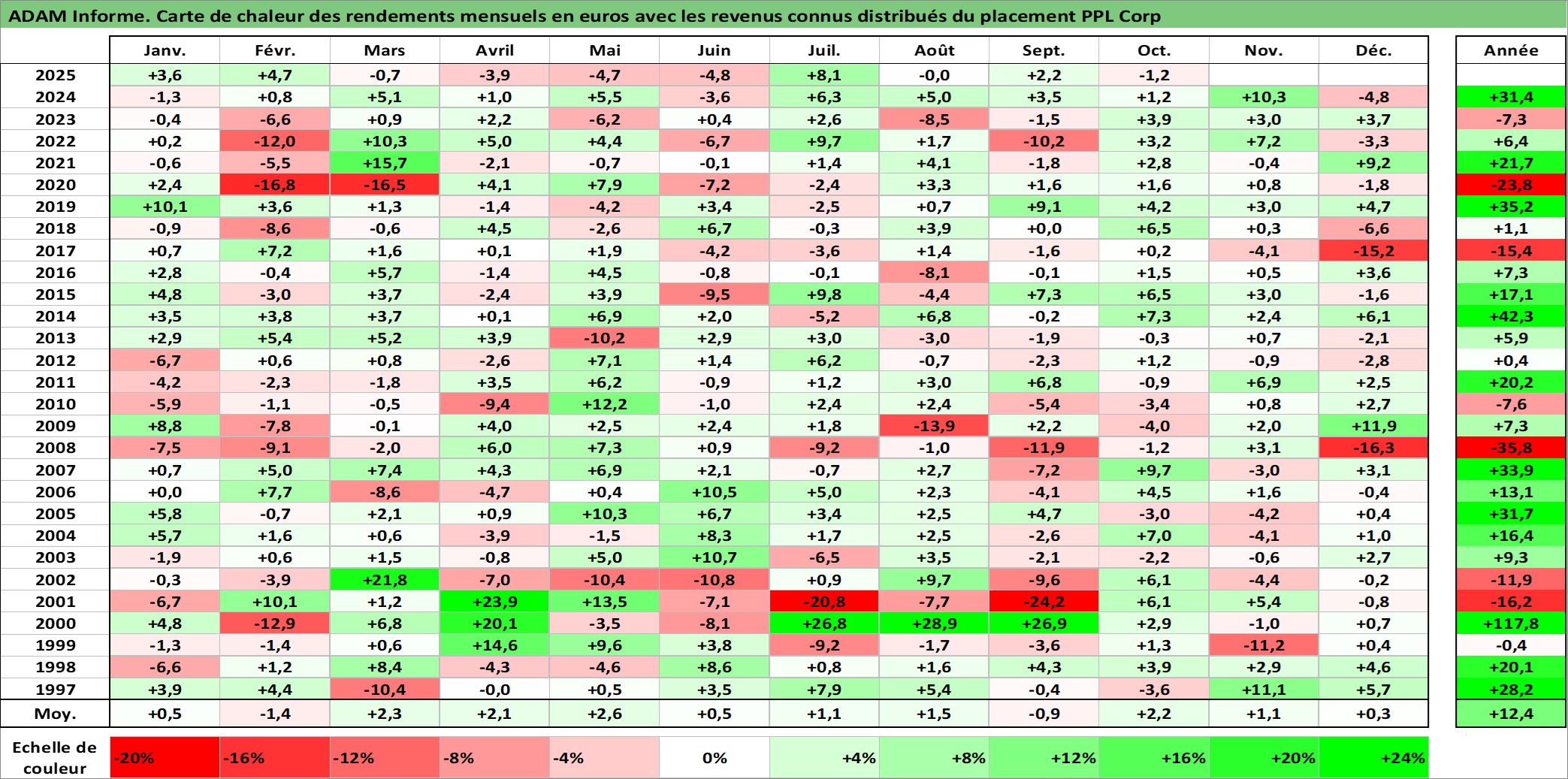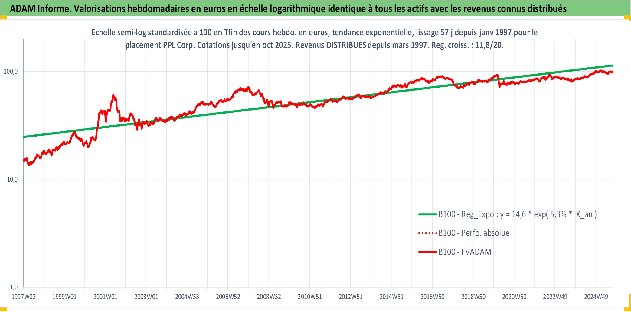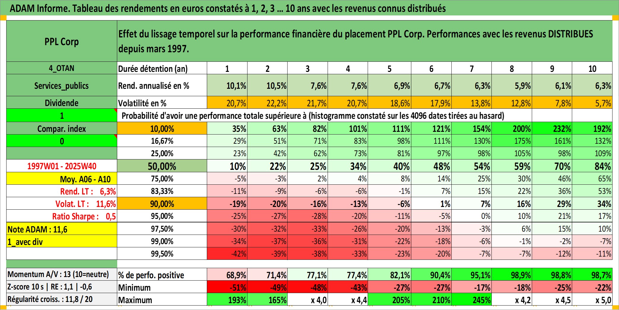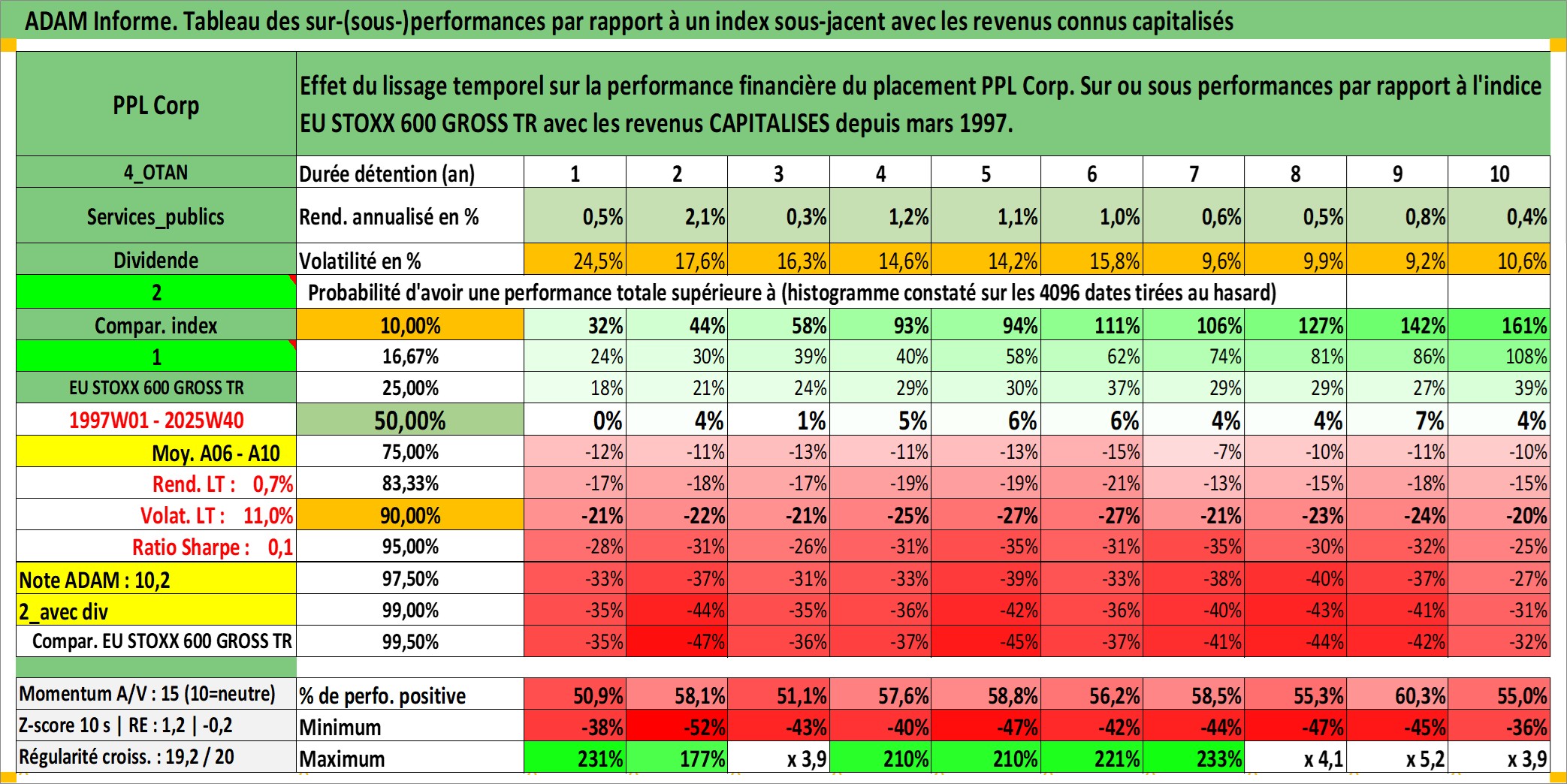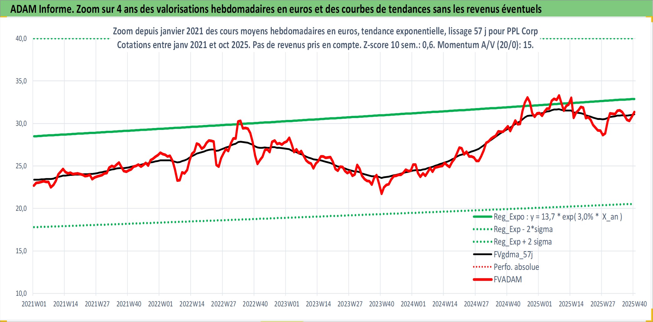 Site dédié aux investisseursPage dédiée sur site financeAnalyse des valorisations hebdomadaires de l'action PPL Corp. Cet actif est cote en USD. Les valorisations sont en contrevaleur EURO et couvrent les semaines 1997W01 a 2025W40. Les revenus de cet actif financier sont pris en compte depuis la semaine 1997W10. La note globale ESG de cet actif est estimee a 4.0 (apres rebasage entre 0 et 20).