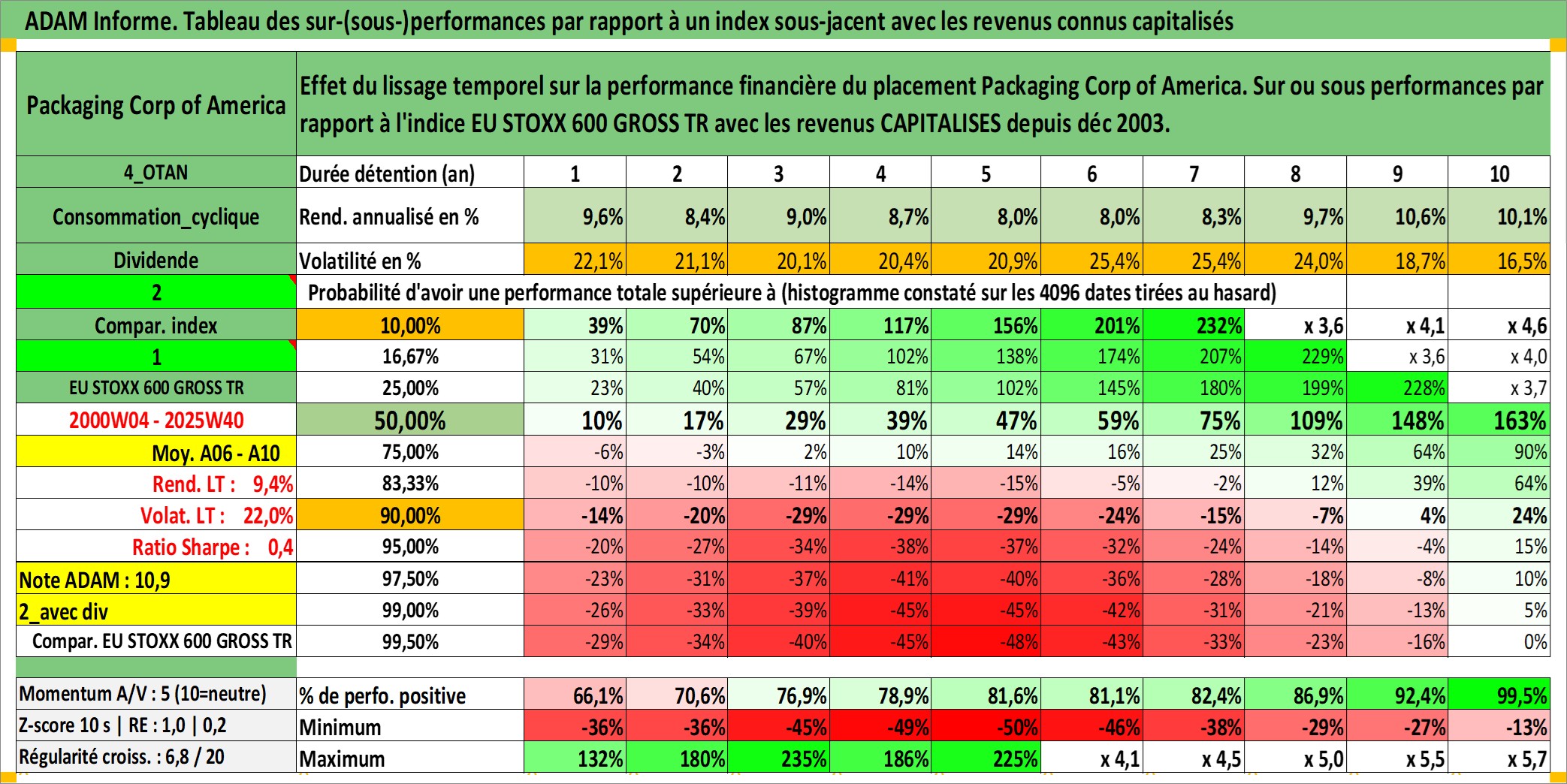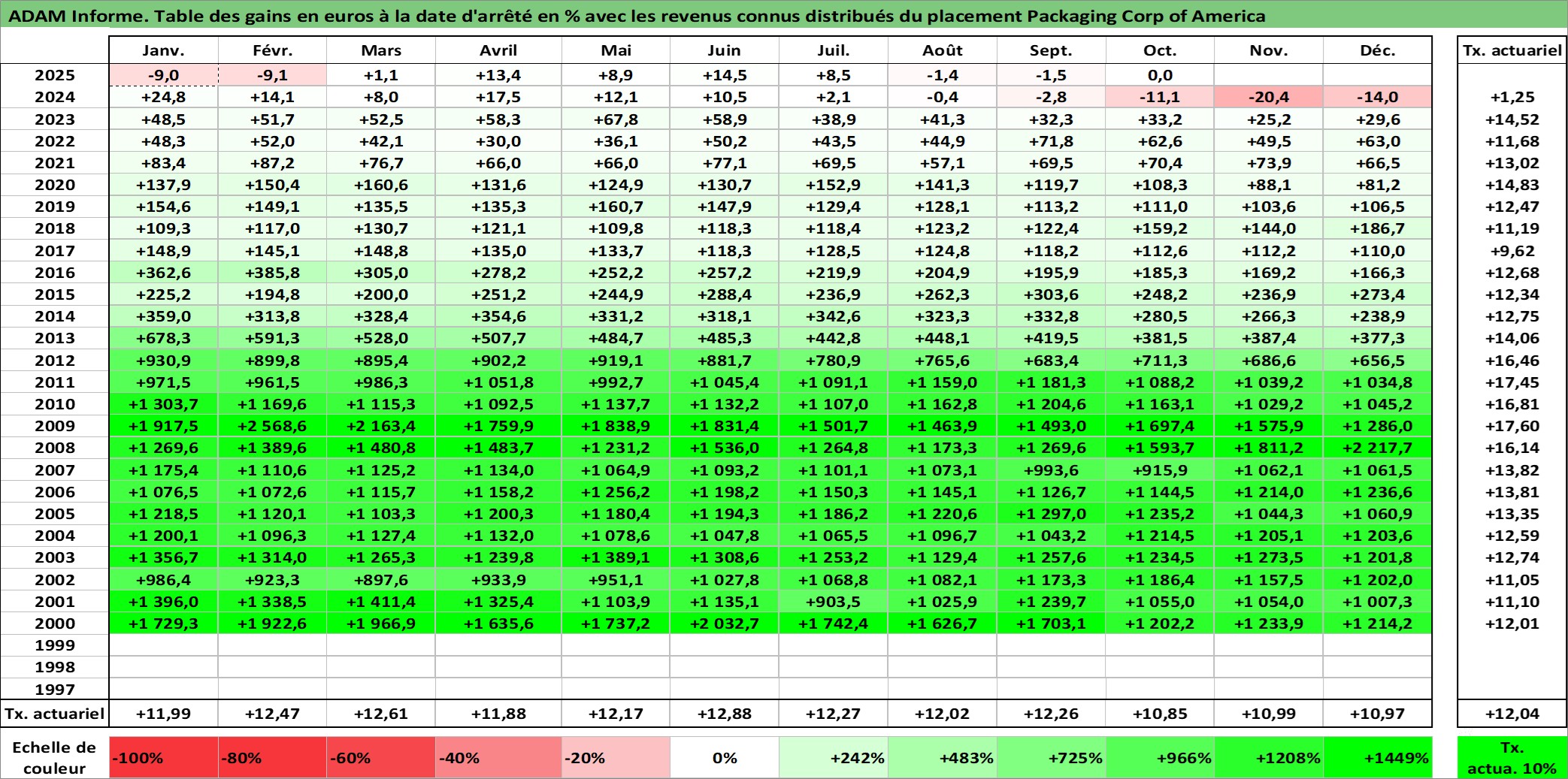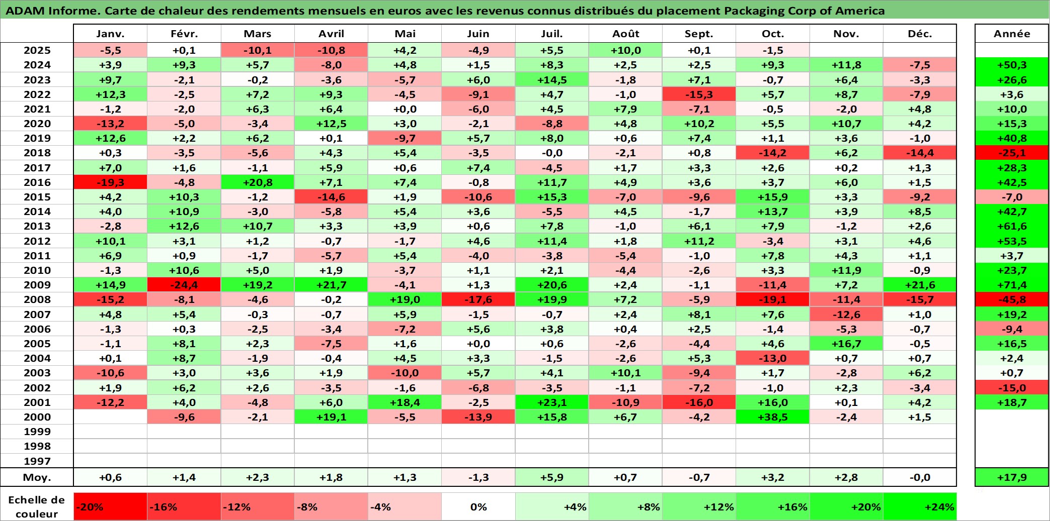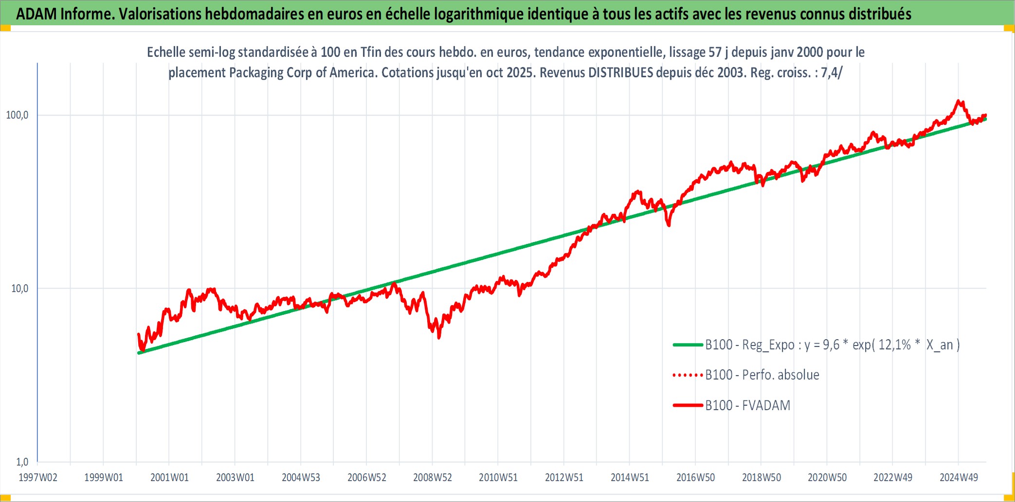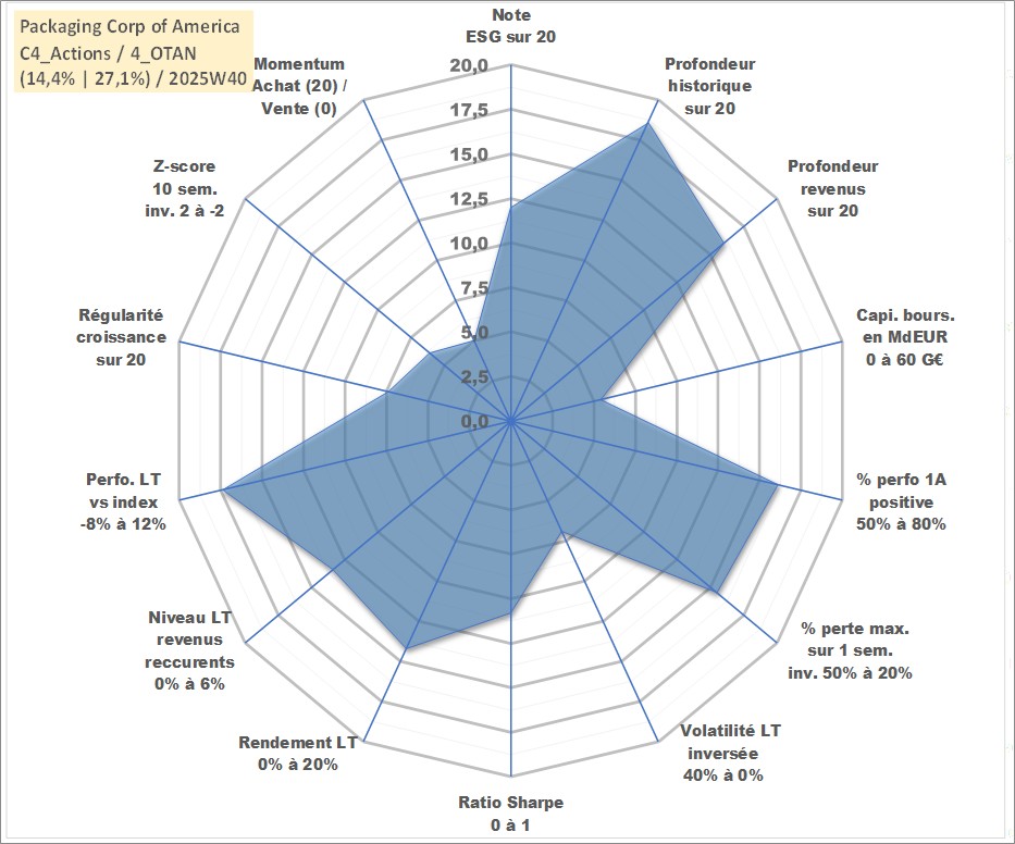 Site dédié aux investisseursPage dédiée sur site financeAnalyse des valorisations hebdomadaires de l'action Packaging Corp of America. Cet actif est cote en USD. Les valorisations sont en contrevaleur EURO et couvrent les semaines 2000W04 a 2025W40. Les revenus de cet actif financier sont pris en compte depuis la semaine 2003W50. La note globale ESG de cet actif est estimee a 12.0 (apres rebasage entre 0 et 20).
