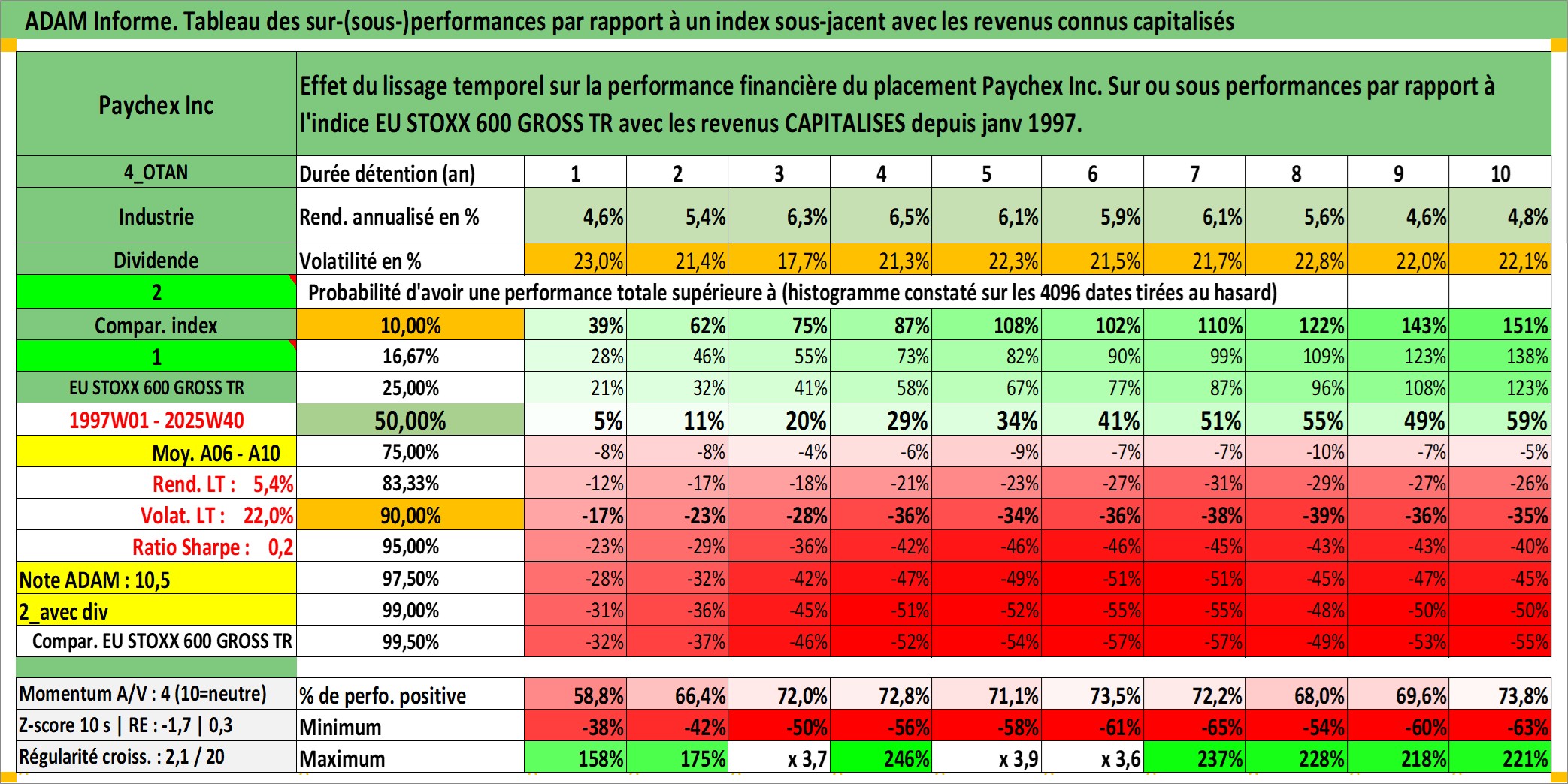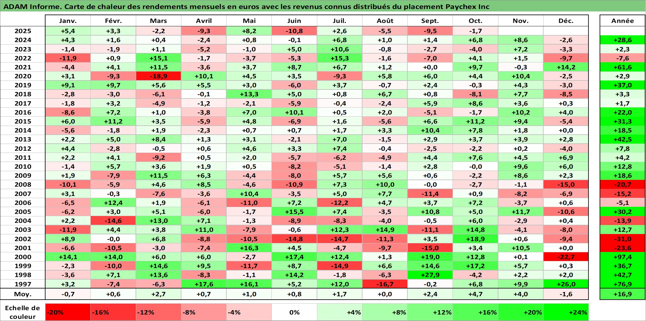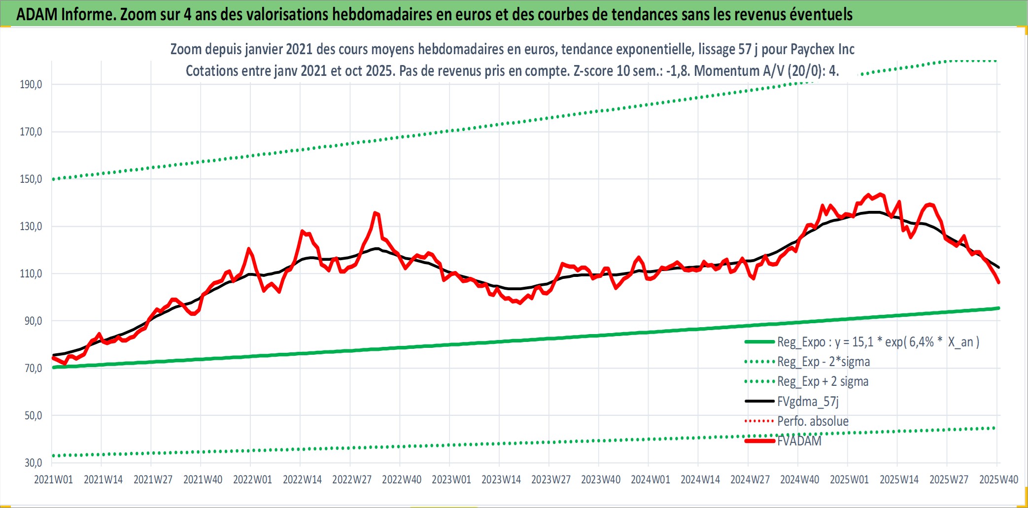 Site dédié aux investisseursPage dédiée sur site financeAnalyse des valorisations hebdomadaires de l'action Paychex Inc. Cet actif est cote en USD. Les valorisations sont en contrevaleur EURO et couvrent les semaines 1997W01 a 2025W40. Les revenus de cet actif financier sont pris en compte depuis la semaine 1997W05. La note globale ESG de cet actif est estimee a 12.0 (apres rebasage entre 0 et 20).