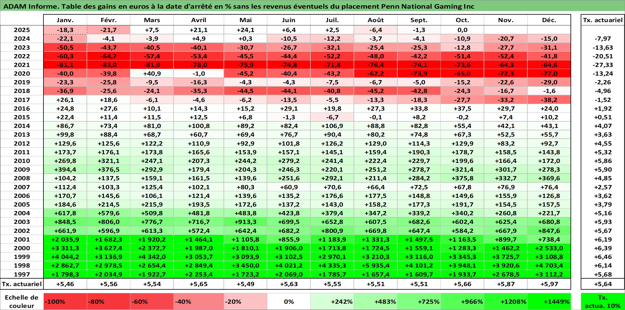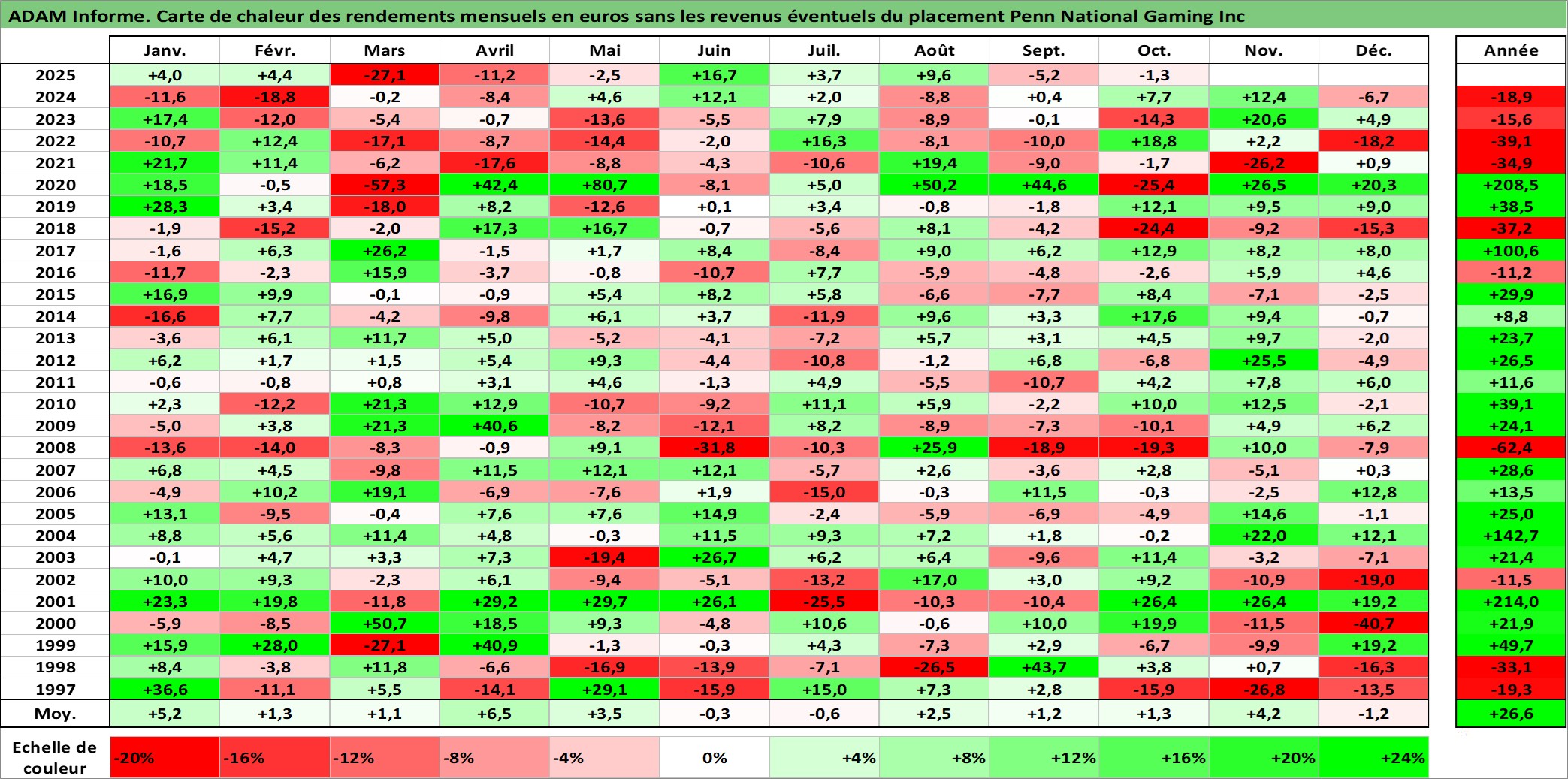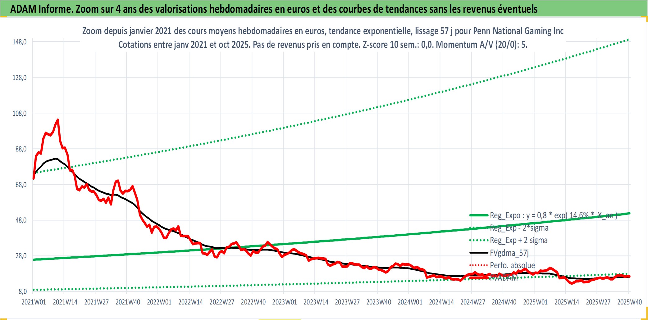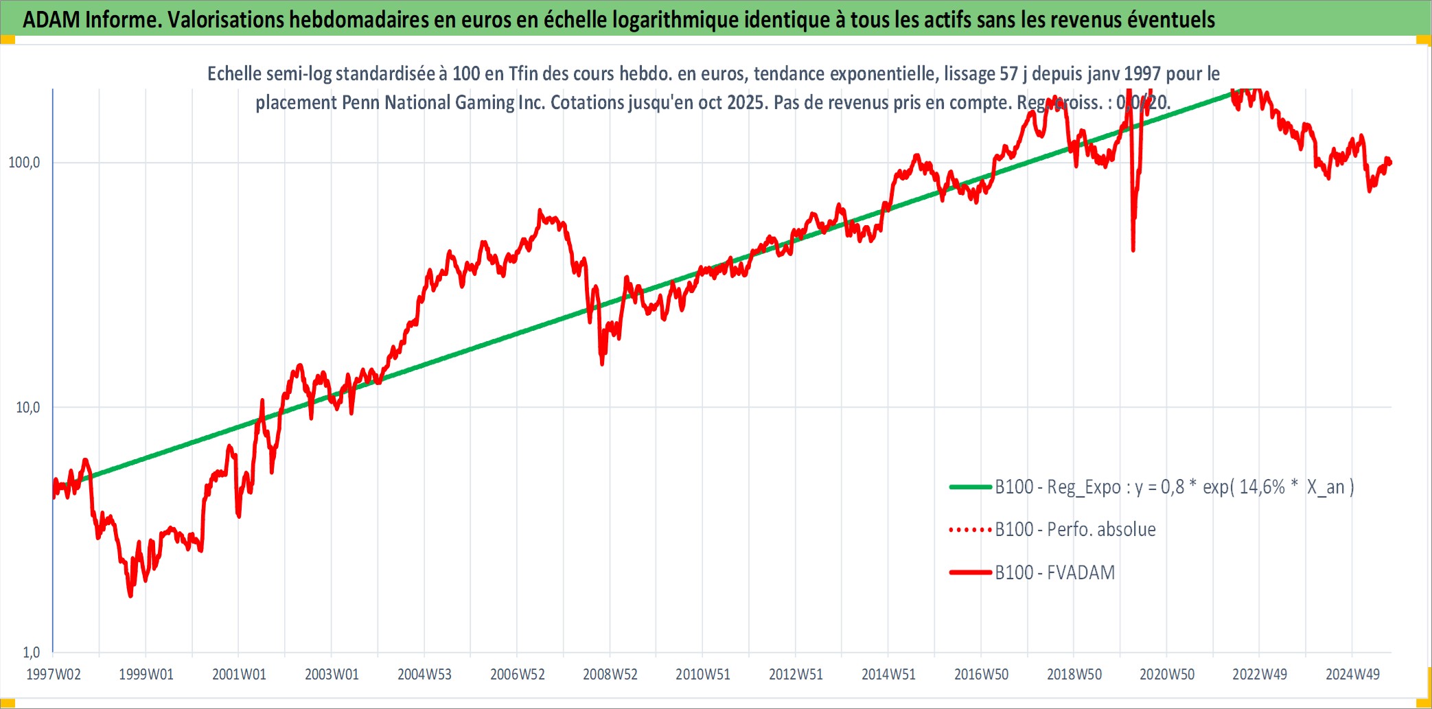 Site dédié aux investisseursPage dédiée sur site financeAnalyse des valorisations hebdomadaires de l'action Penn National Gaming Inc. Cet actif est cote en USD. Les valorisations sont en contrevaleur EURO et couvrent les semaines 1997W01 a 2025W40. Les revenus de cet actif financier ne sont pas connus car non existants ou non disponibles sur le site Yahoo Finance. La note ESG de cet actif n'est pas connue.