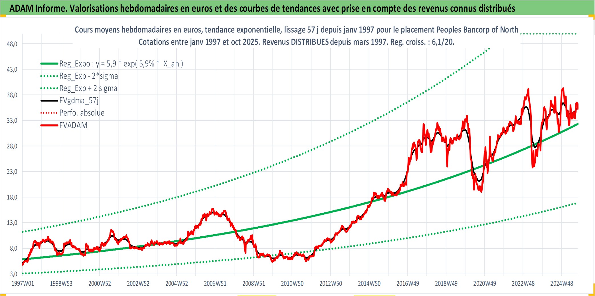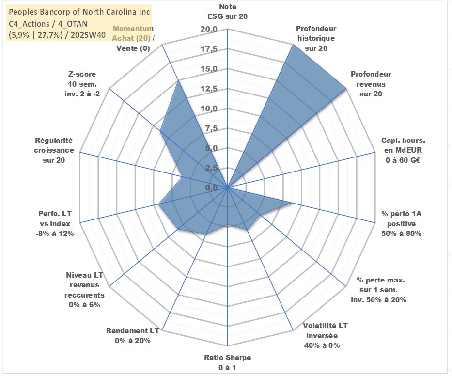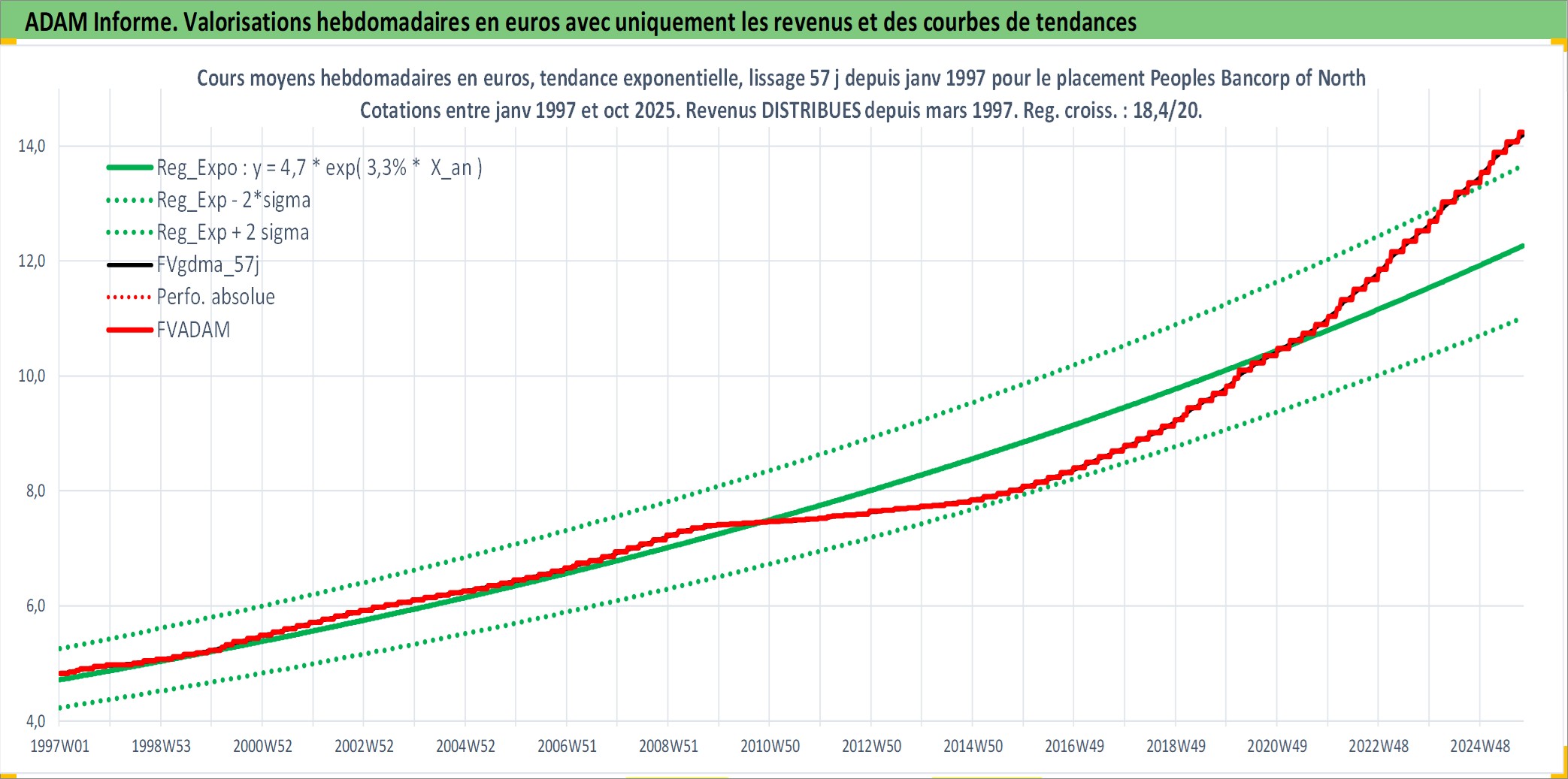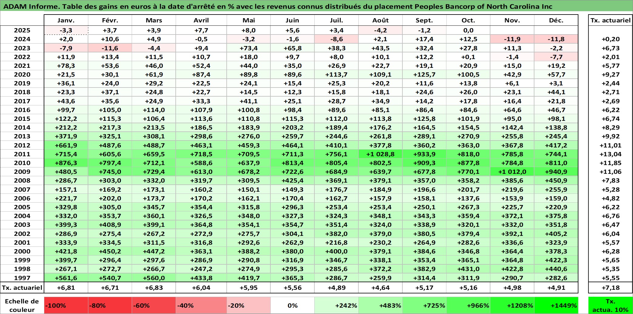 Site dédié aux investisseursPage dédiée sur site financeAnalyse des valorisations hebdomadaires de l'action Peoples Bancorp of North Carolina Inc. Cet actif est cote en USD. Les valorisations sont en contrevaleur EURO et couvrent les semaines 1997W01 a 2025W40. Les revenus de cet actif financier sont pris en compte depuis la semaine 1997W11. La note ESG de cet actif n'est pas connue.