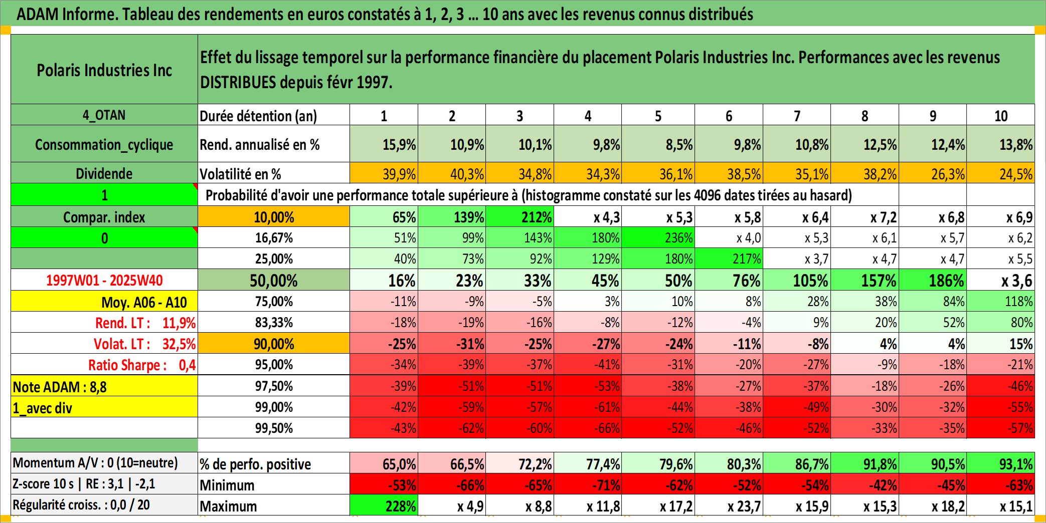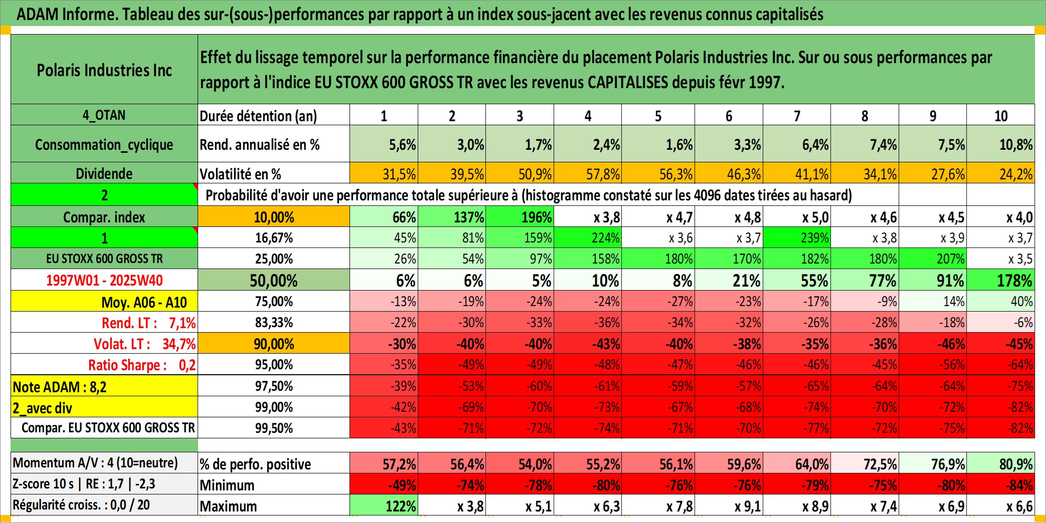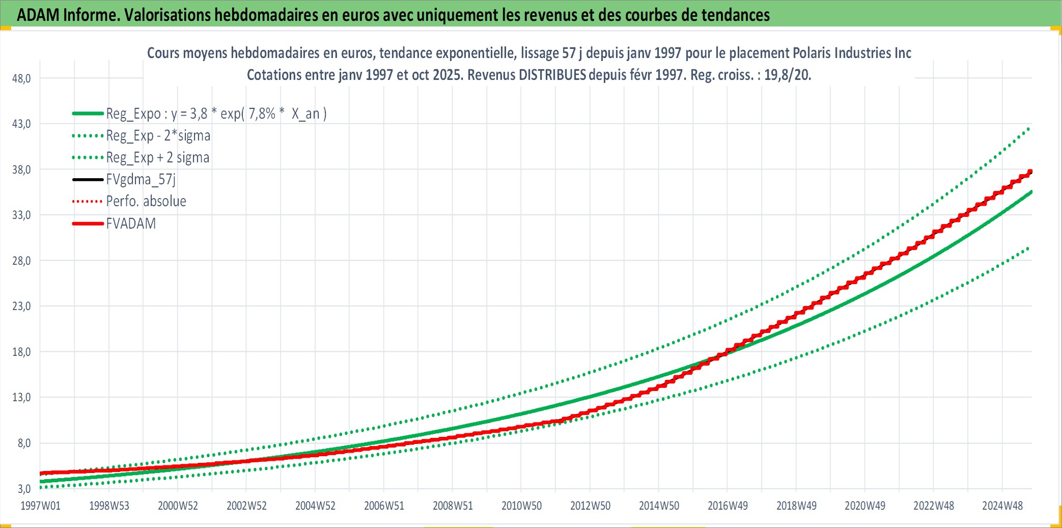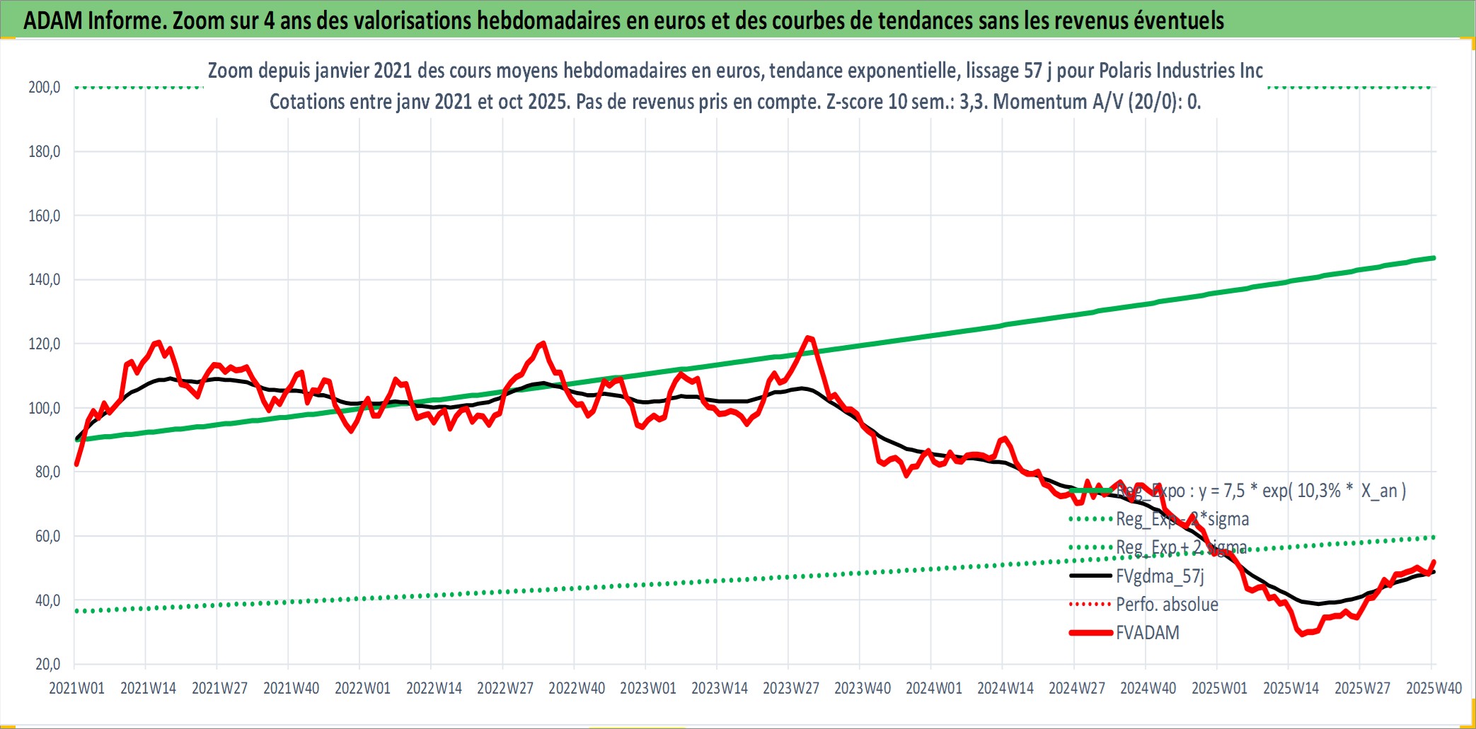 Site dédié aux investisseursPage dédiée sur site financeAnalyse des valorisations hebdomadaires de l'action Polaris Industries Inc. Cet actif est cote en USD. Les valorisations sont en contrevaleur EURO et couvrent les semaines 1997W01 a 2025W40. Les revenus de cet actif financier sont pris en compte depuis la semaine 1997W06. La note globale ESG de cet actif est estimee a 16.0 (apres rebasage entre 0 et 20).