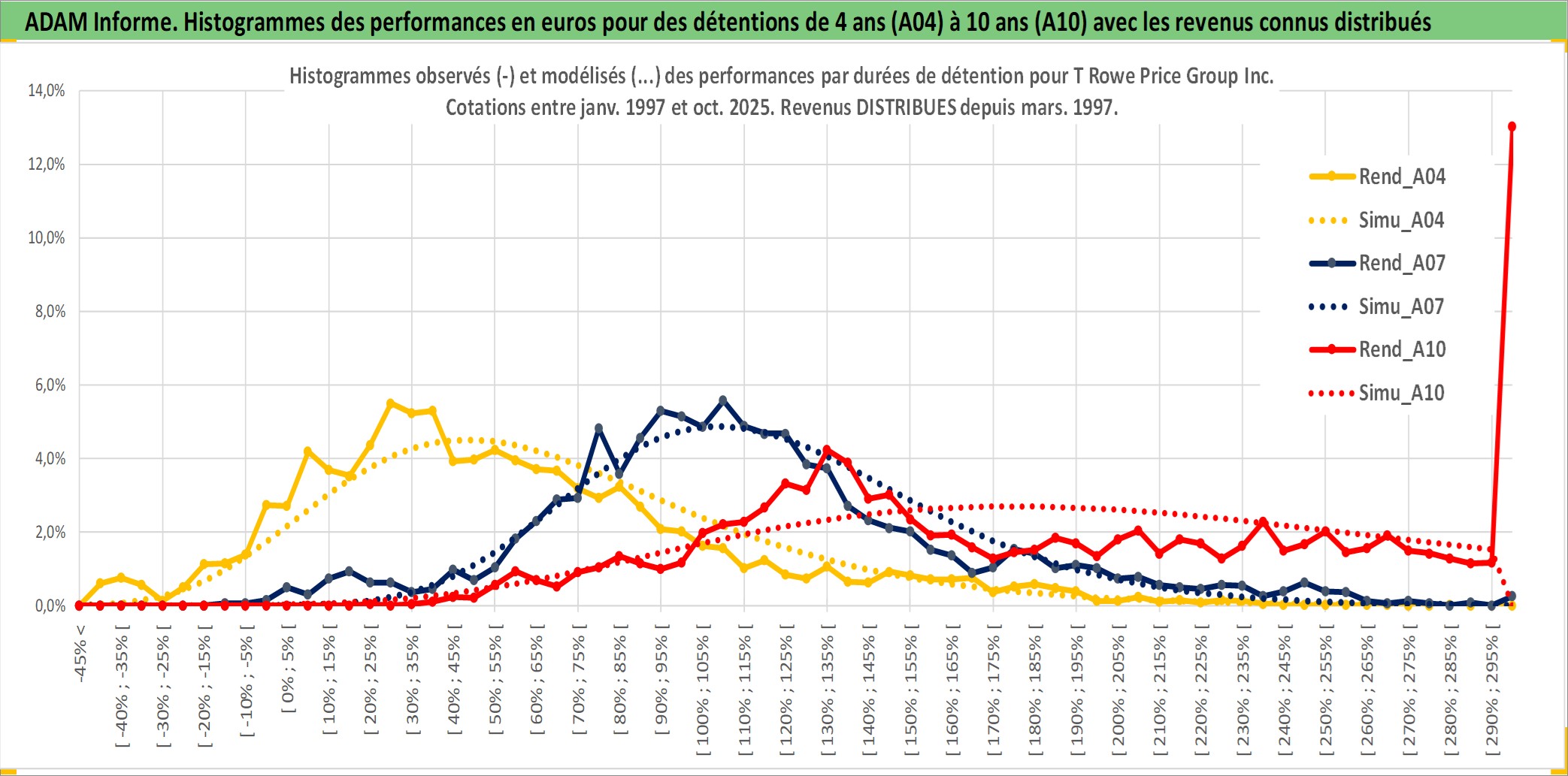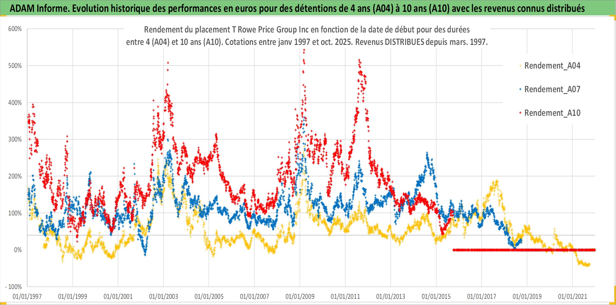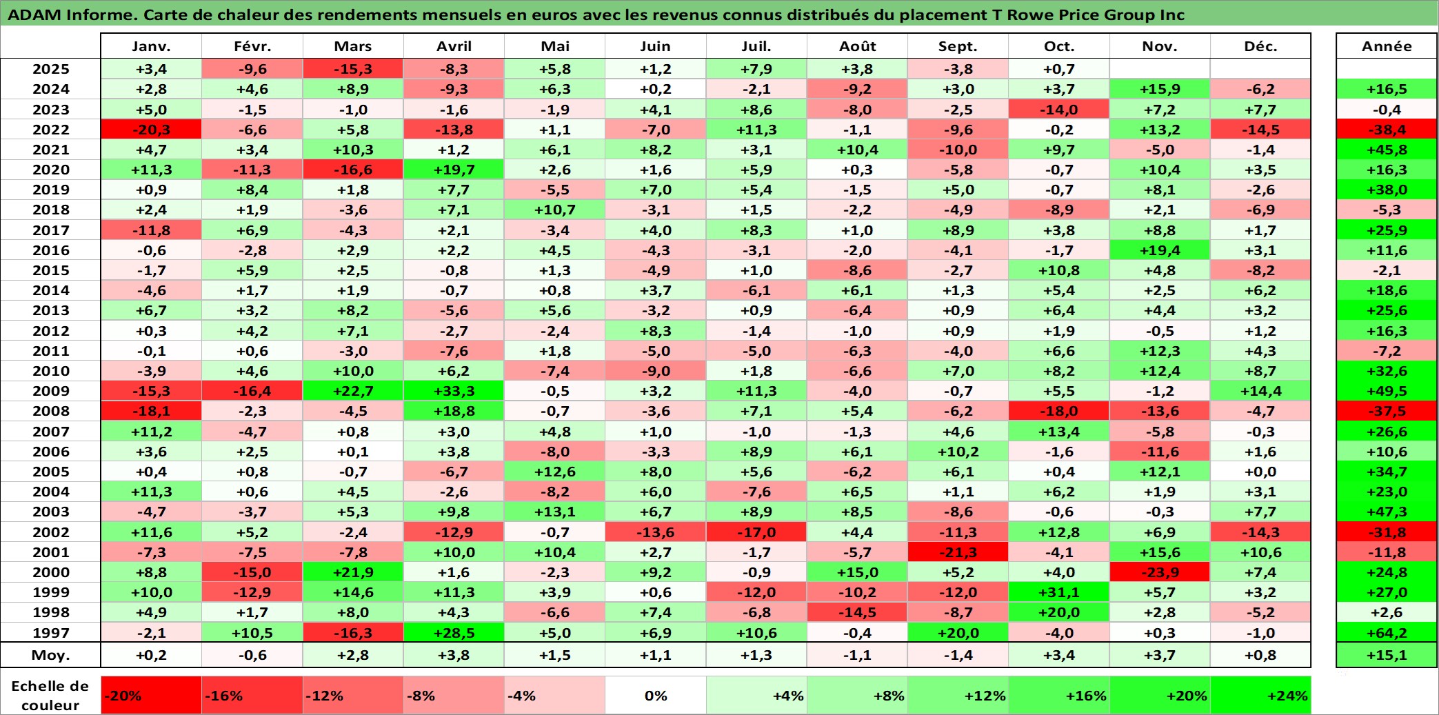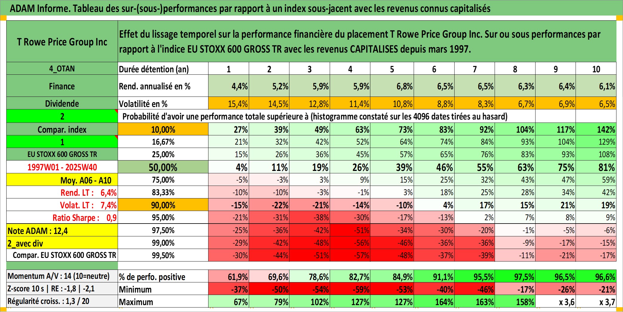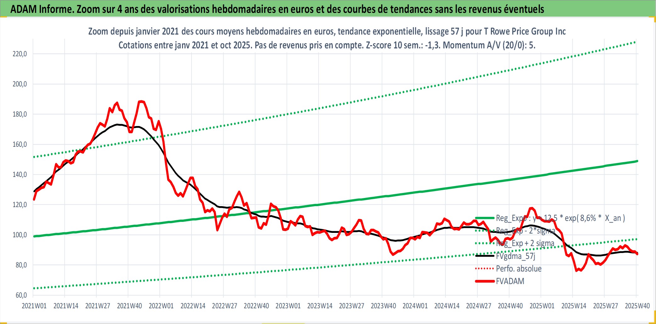 Site dédié aux investisseursPage dédiée sur site financeAnalyse des valorisations hebdomadaires de l'action T Rowe Price Group Inc. Cet actif est cote en USD. Les valorisations sont en contrevaleur EURO et couvrent les semaines 1997W01 a 2025W40. Les revenus de cet actif financier sont pris en compte depuis la semaine 1997W12. La note globale ESG de cet actif est estimee a 12.0 (apres rebasage entre 0 et 20).