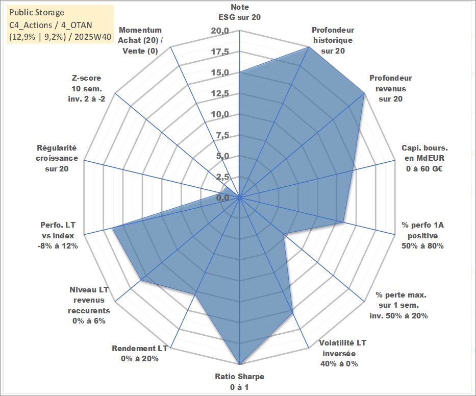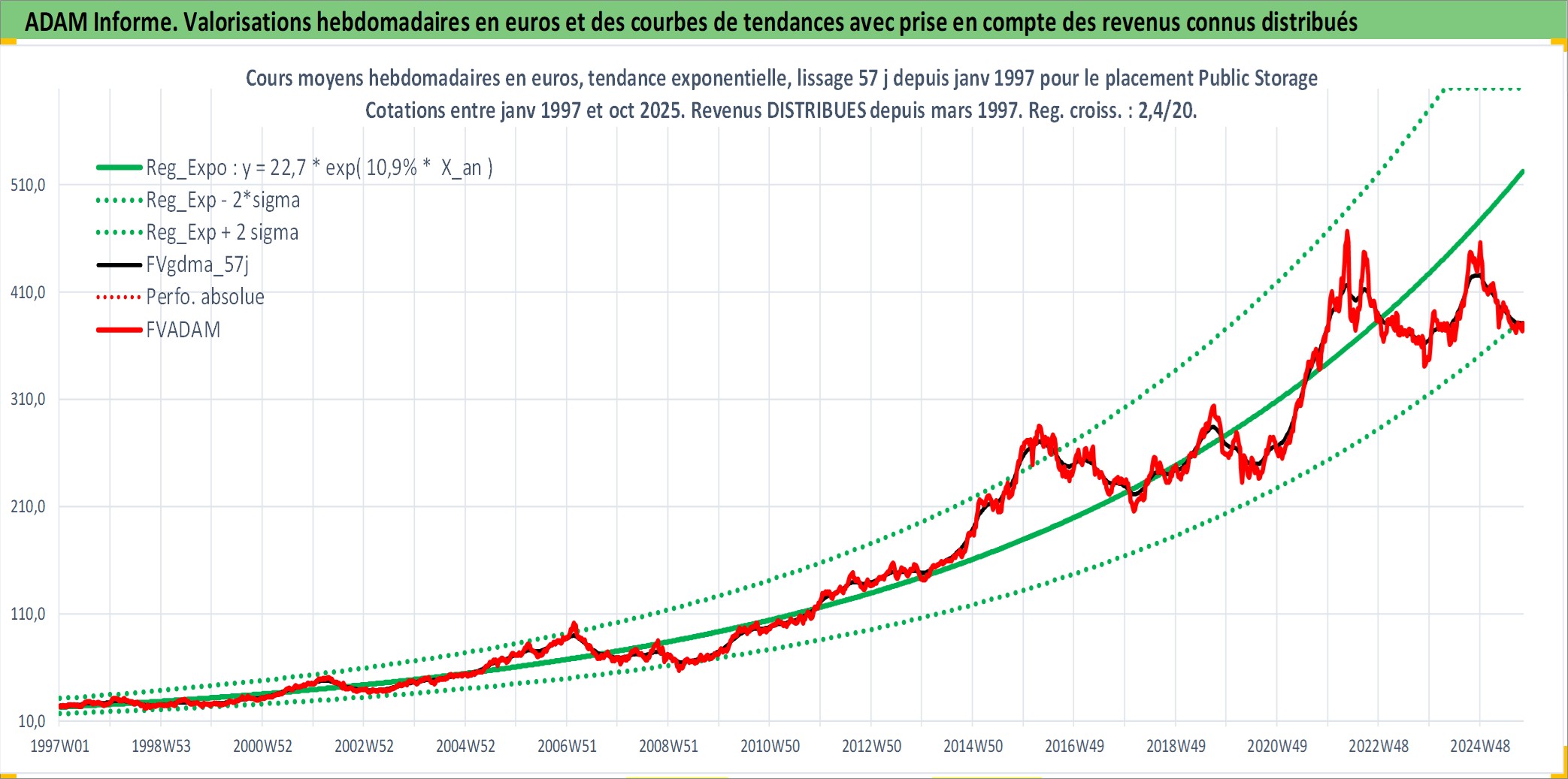 Site dédié aux investisseursPage dédiée sur site financeAnalyse des valorisations hebdomadaires de l'action Public Storage. Cet actif est cote en USD. Les valorisations sont en contrevaleur EURO et couvrent les semaines 1997W01 a 2025W40. Les revenus de cet actif financier sont pris en compte depuis la semaine 1997W11. La note globale ESG de cet actif est estimee a 15.0 (apres rebasage entre 0 et 20).