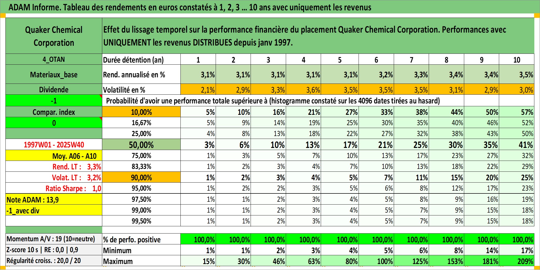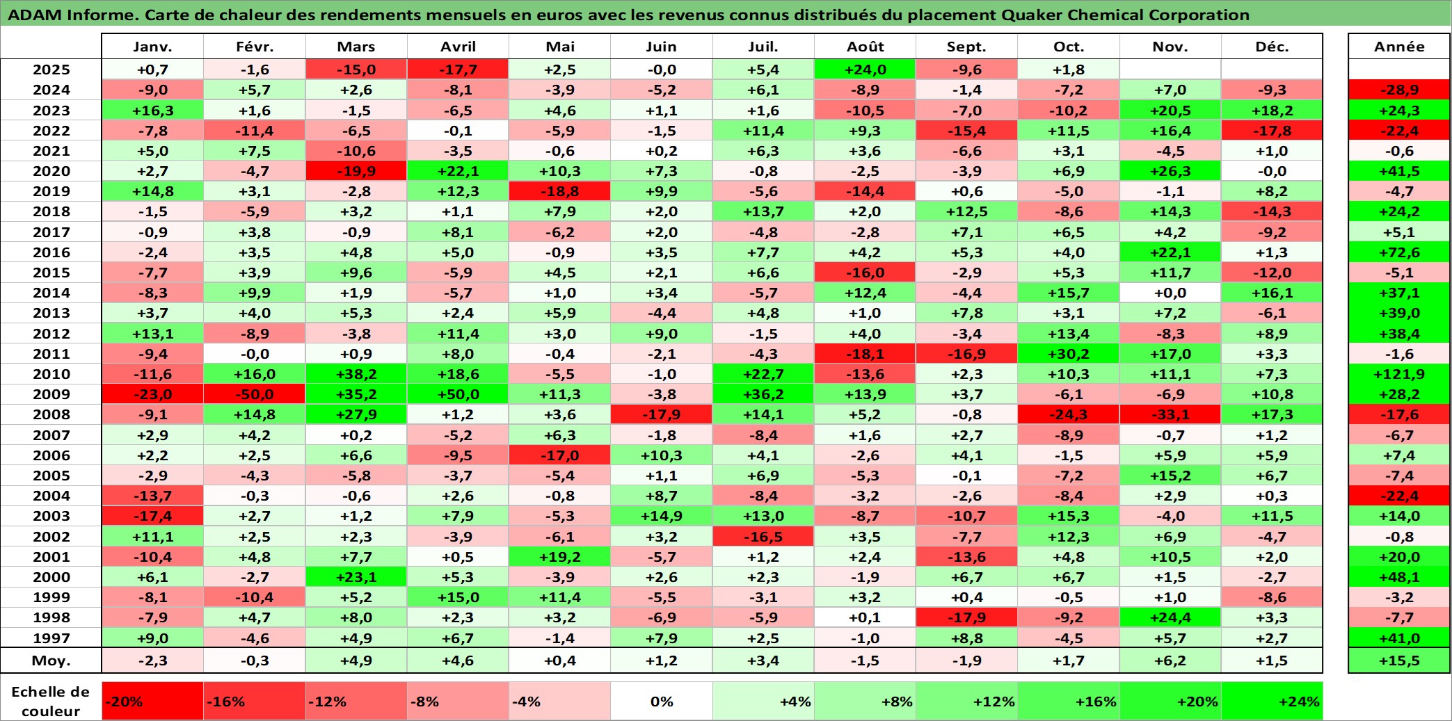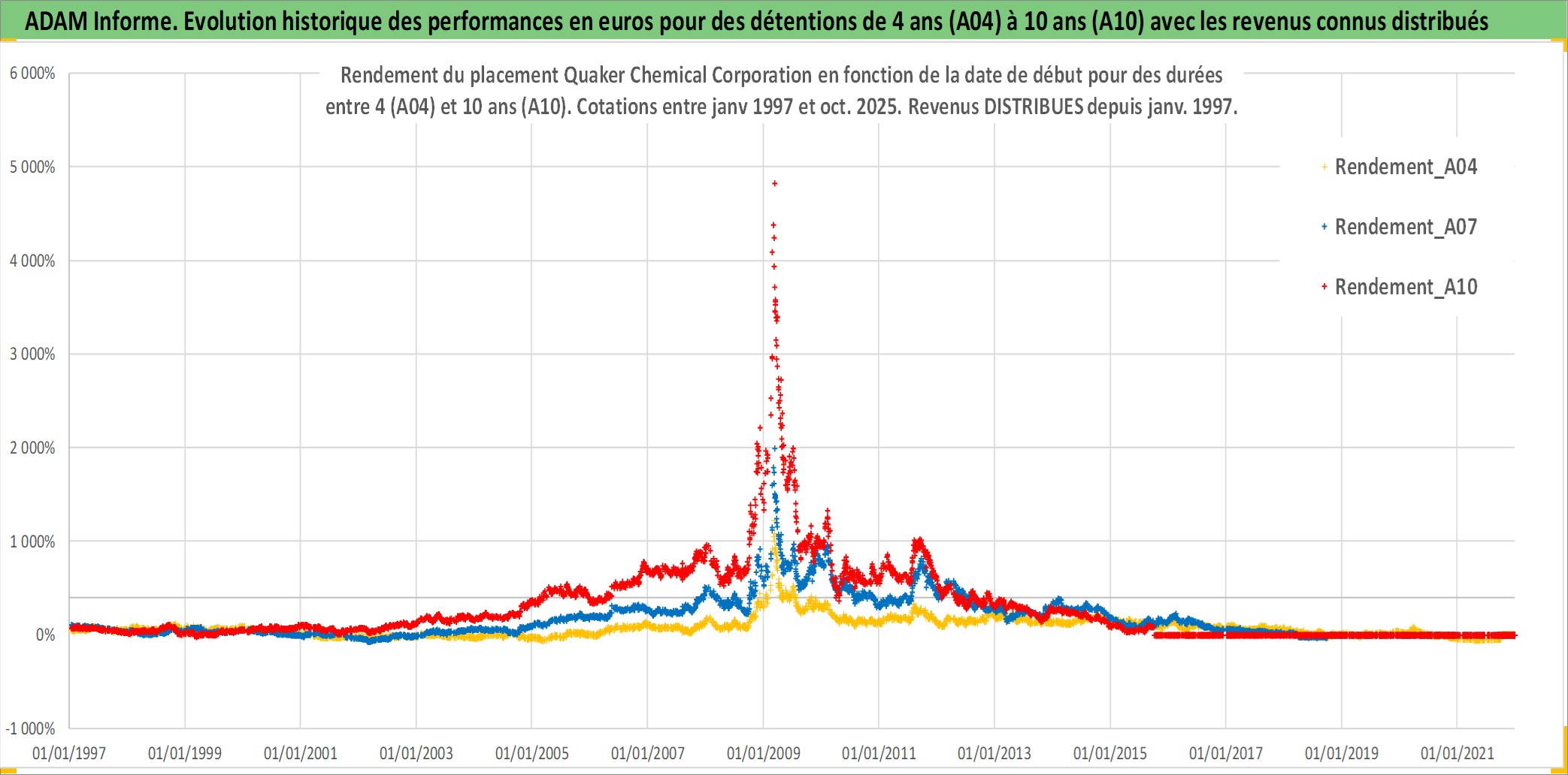 Site dédié aux investisseursPage dédiée sur site financeAnalyse des valorisations hebdomadaires de l'action Quaker Chemical Corporation. Cet actif est cote en USD. Les valorisations sont en contrevaleur EURO et couvrent les semaines 1997W01 a 2025W40. Les revenus de cet actif financier sont pris en compte depuis la semaine 1997W03. La note ESG de cet actif n'est pas connue.