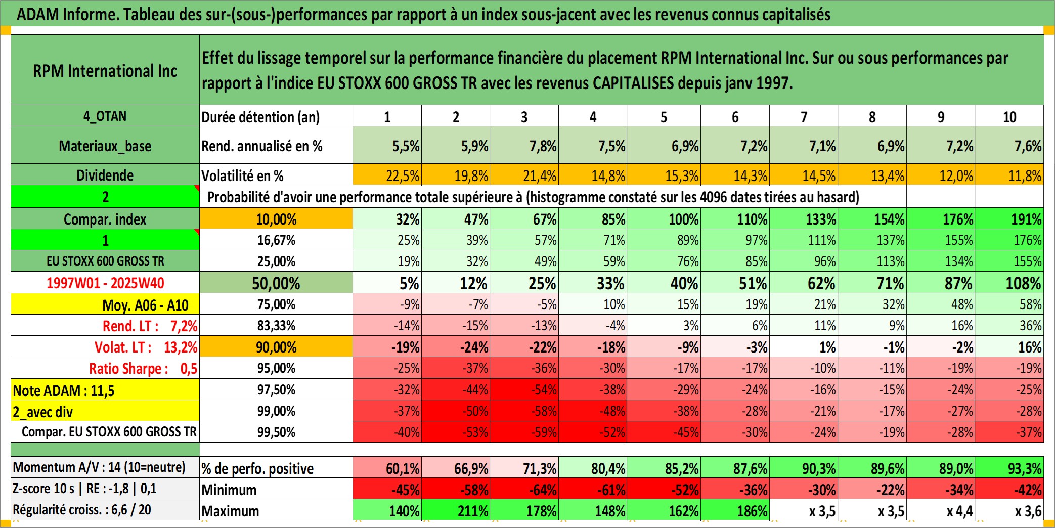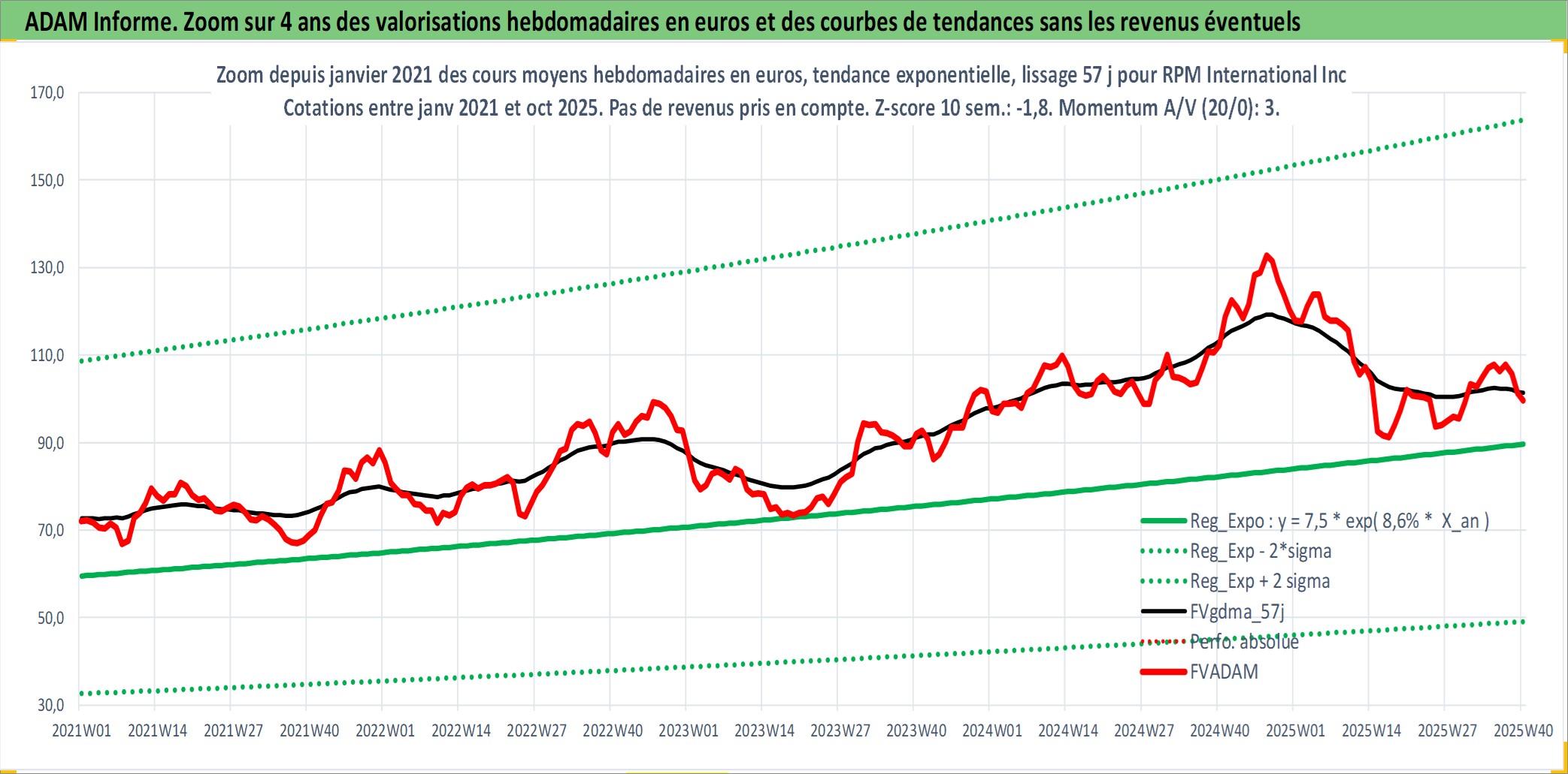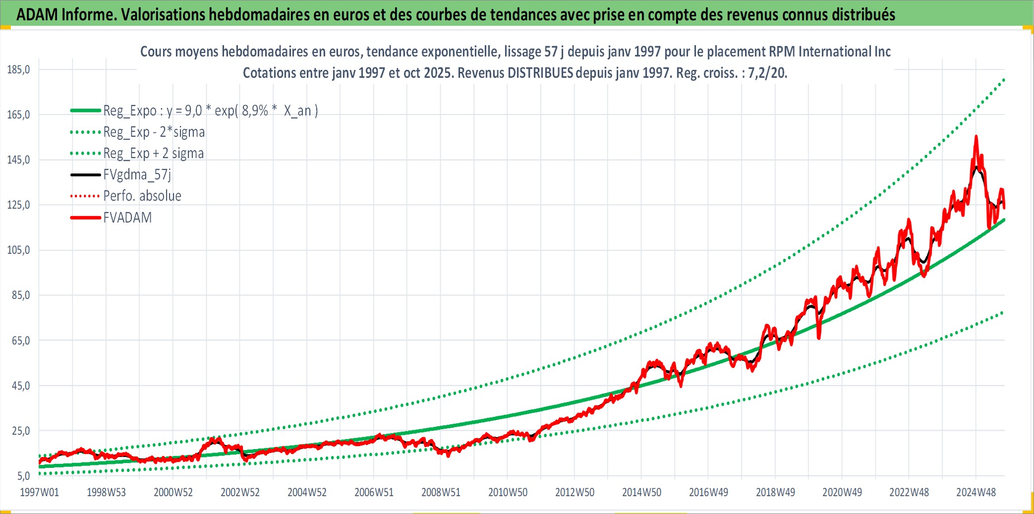Site dédié aux investisseursPage dédiée sur site financeAnalyse des valorisations hebdomadaires de l'action RPM International Inc. Cet actif est cote en USD. Les valorisations sont en contrevaleur EURO et couvrent les semaines 1997W01 a 2025W40. Les revenus de cet actif financier sont pris en compte depuis la semaine 1997W03. La note globale ESG de cet actif est estimee a 2.0 (apres rebasage entre 0 et 20).