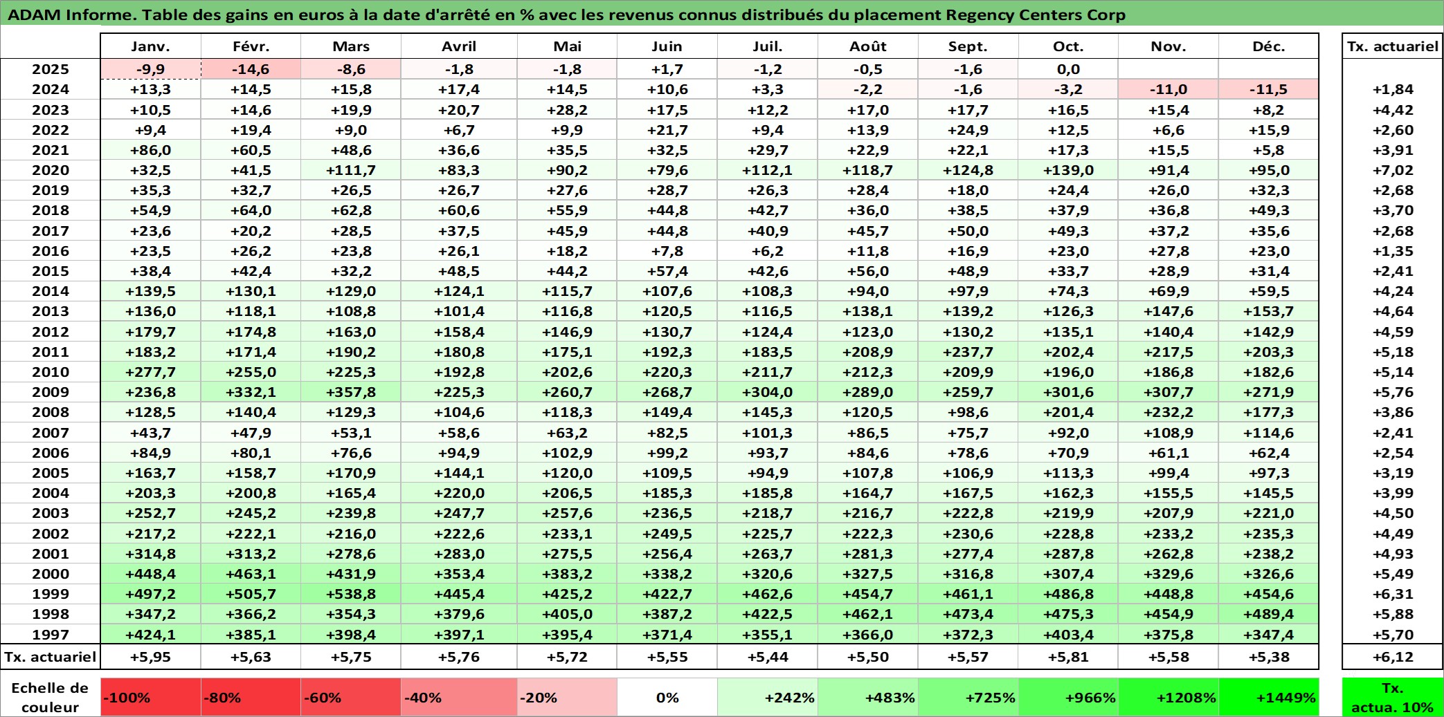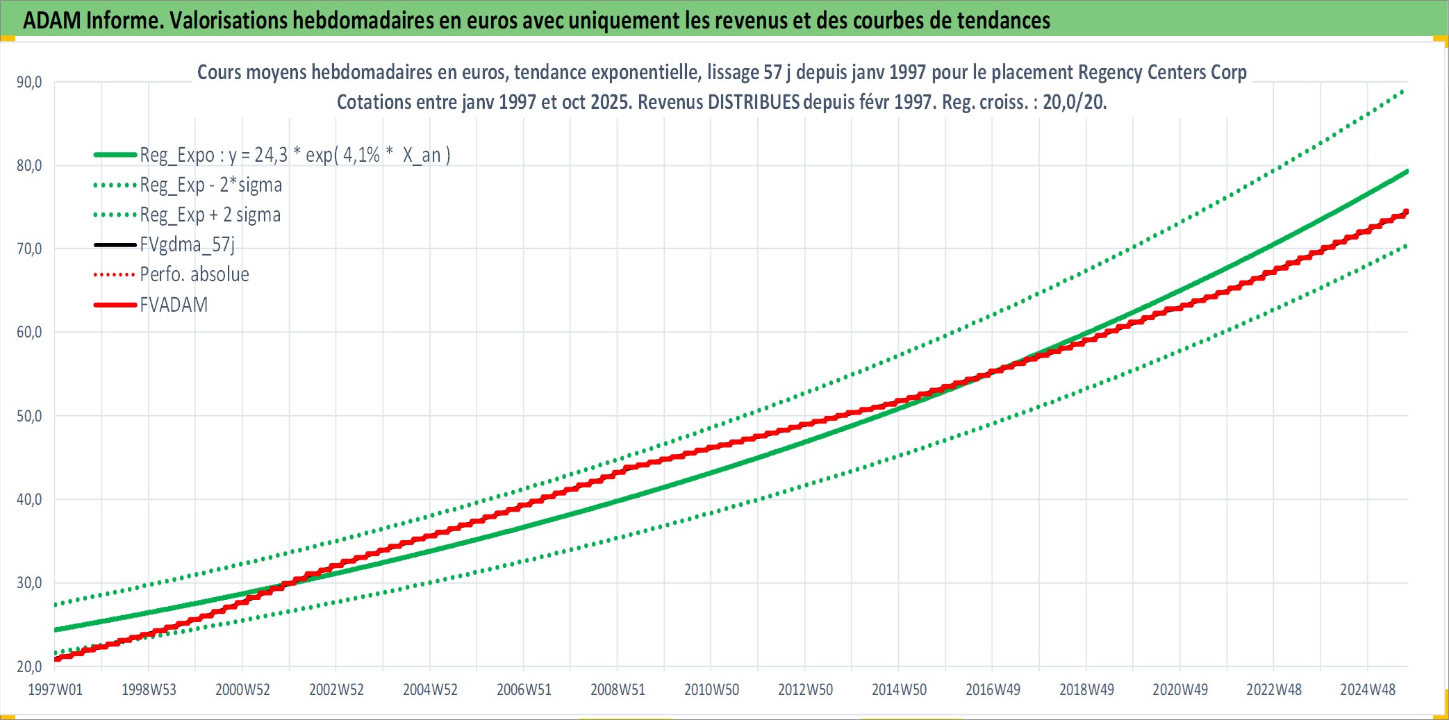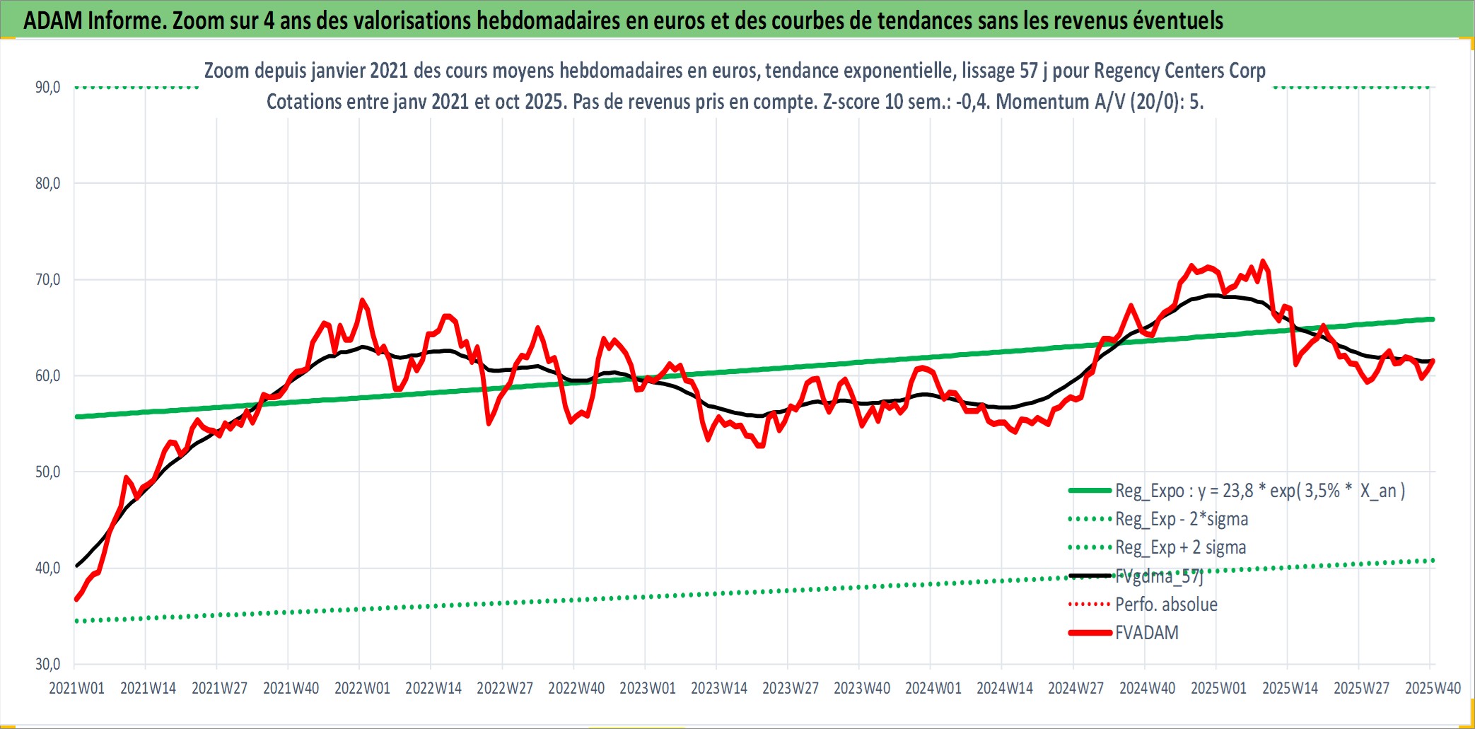 Site dédié aux investisseursPage dédiée sur site financeAnalyse des valorisations hebdomadaires de l'action Regency Centers Corp. Cet actif est cote en USD. Les valorisations sont en contrevaleur EURO et couvrent les semaines 1997W01 a 2025W40. Les revenus de cet actif financier sont pris en compte depuis la semaine 1997W07. La note globale ESG de cet actif est estimee a 16.0 (apres rebasage entre 0 et 20).