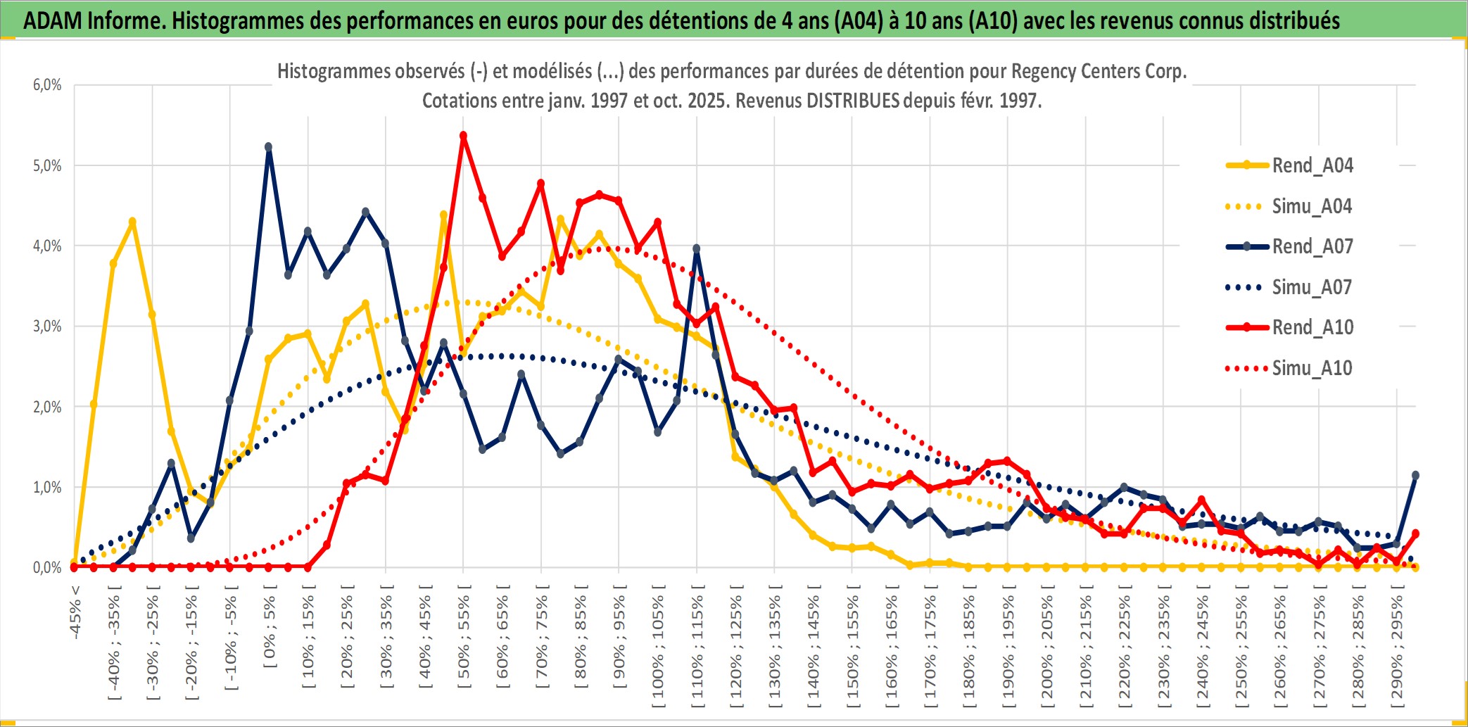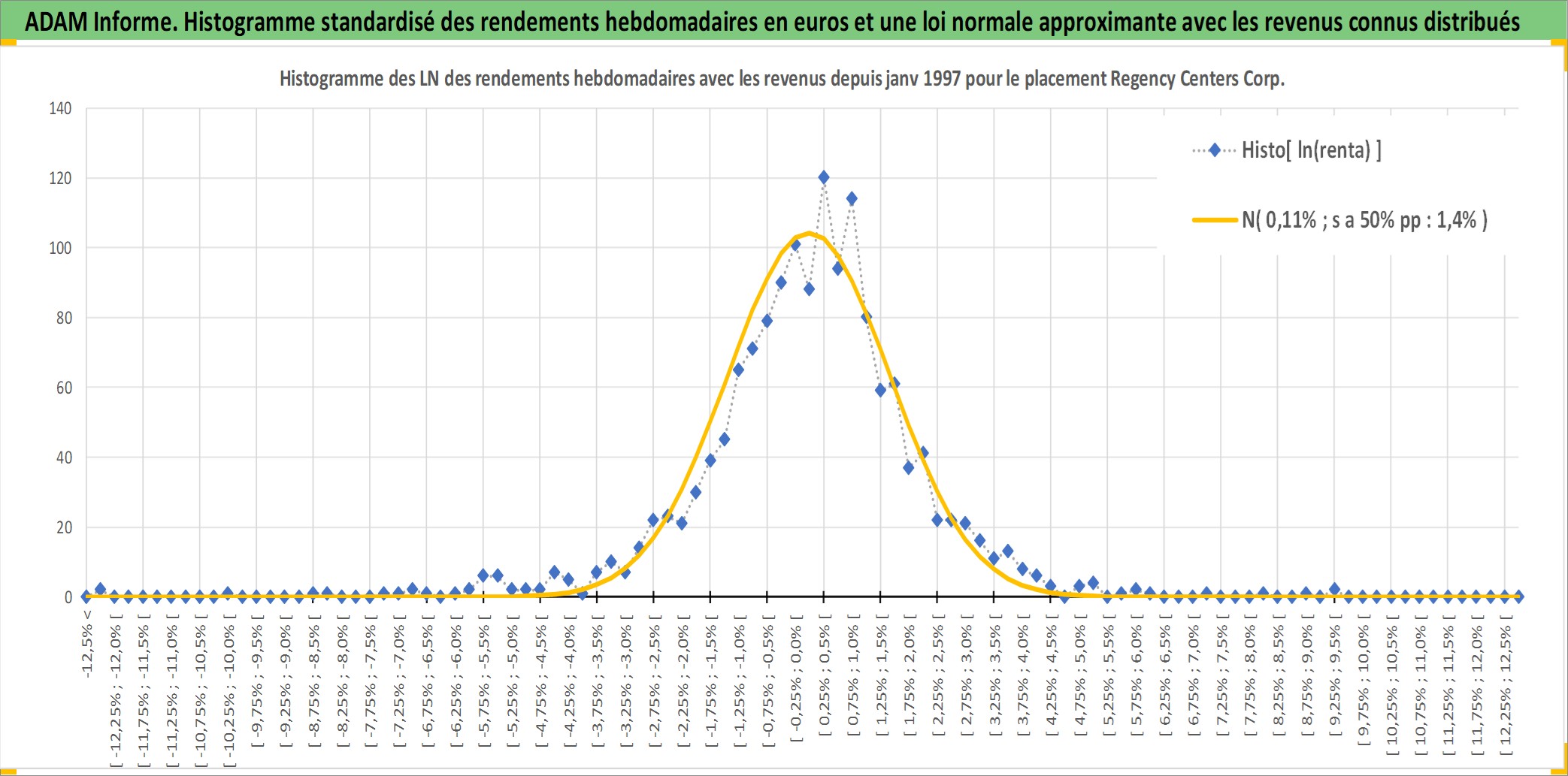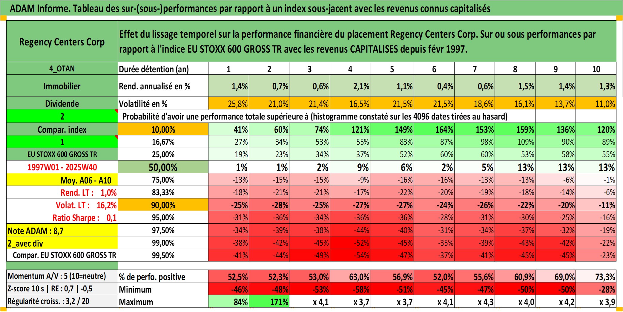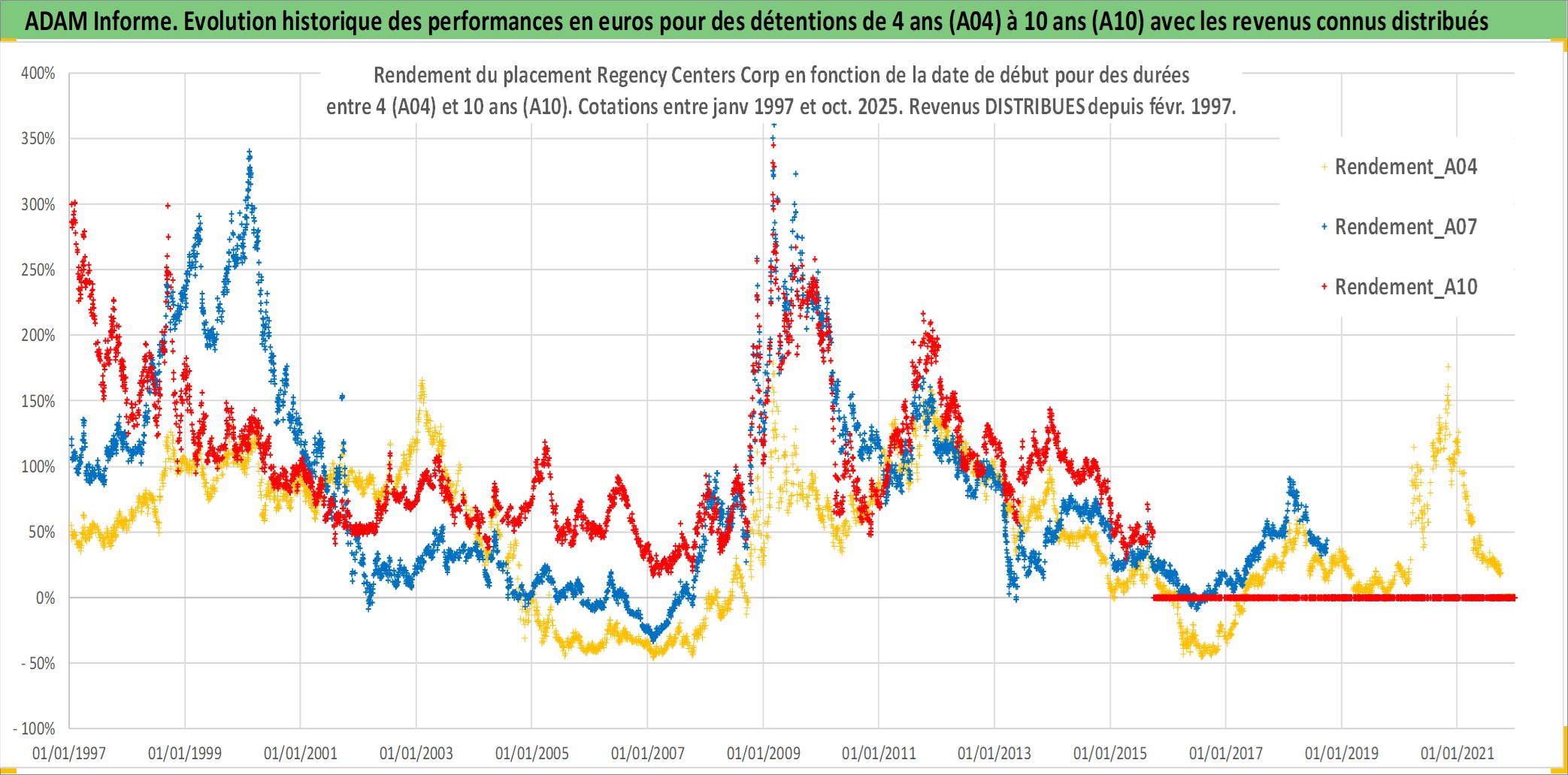 Site dédié aux investisseursPage dédiée sur site financeAnalyse des valorisations hebdomadaires de l'action Regency Centers Corp. Cet actif est cote en USD. Les valorisations sont en contrevaleur EURO et couvrent les semaines 1997W01 a 2025W40. Les revenus de cet actif financier sont pris en compte depuis la semaine 1997W07. La note globale ESG de cet actif est estimee a 16.0 (apres rebasage entre 0 et 20).