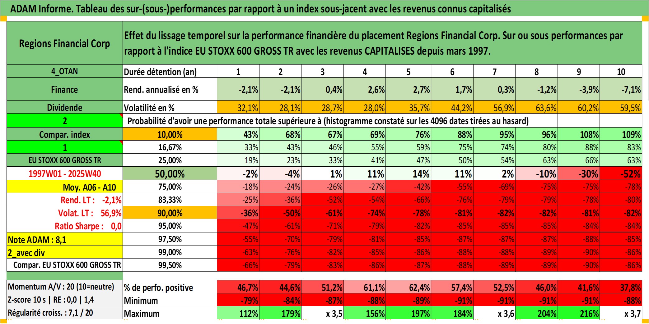 Site dédié aux investisseursPage dédiée sur site financeAnalyse des valorisations hebdomadaires de l'action Regions Financial Corp. Cet actif est cote en USD. Les valorisations sont en contrevaleur EURO et couvrent les semaines 1997W01 a 2025W40. Les revenus de cet actif financier sont pris en compte depuis la semaine 1997W11. La note globale ESG de cet actif est estimee a 13.0 (apres rebasage entre 0 et 20).