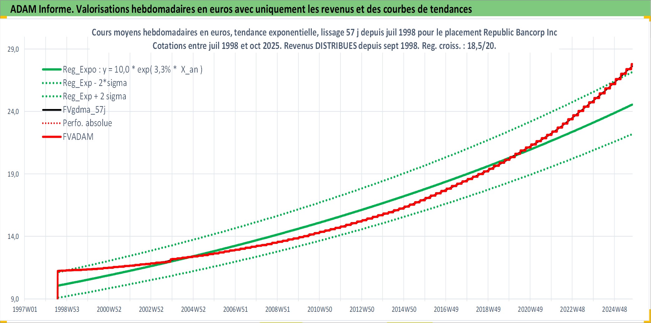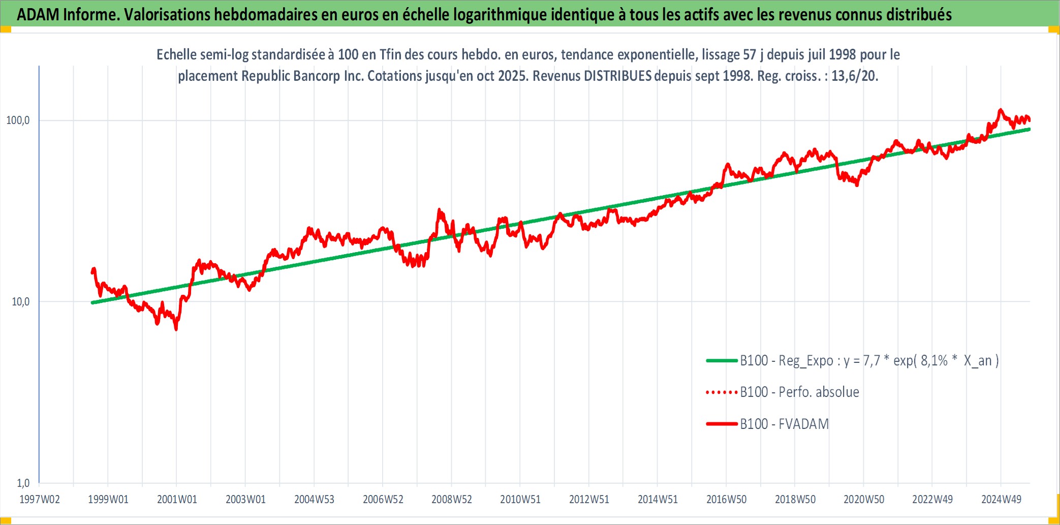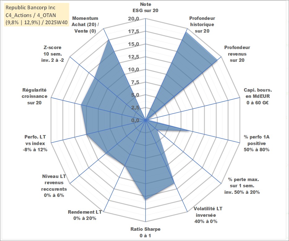 Site dédié aux investisseursPage dédiée sur site financeAnalyse des valorisations hebdomadaires de l'action Republic Bancorp Inc. Cet actif est cote en USD. Les valorisations sont en contrevaleur EURO et couvrent les semaines 1998W30 a 2025W40. Les revenus de cet actif financier sont pris en compte depuis la semaine 1998W38. La note ESG de cet actif n'est pas connue.