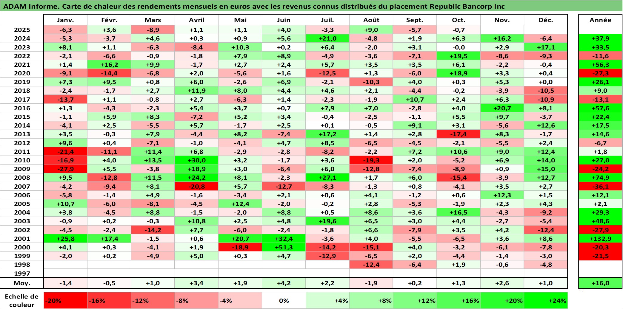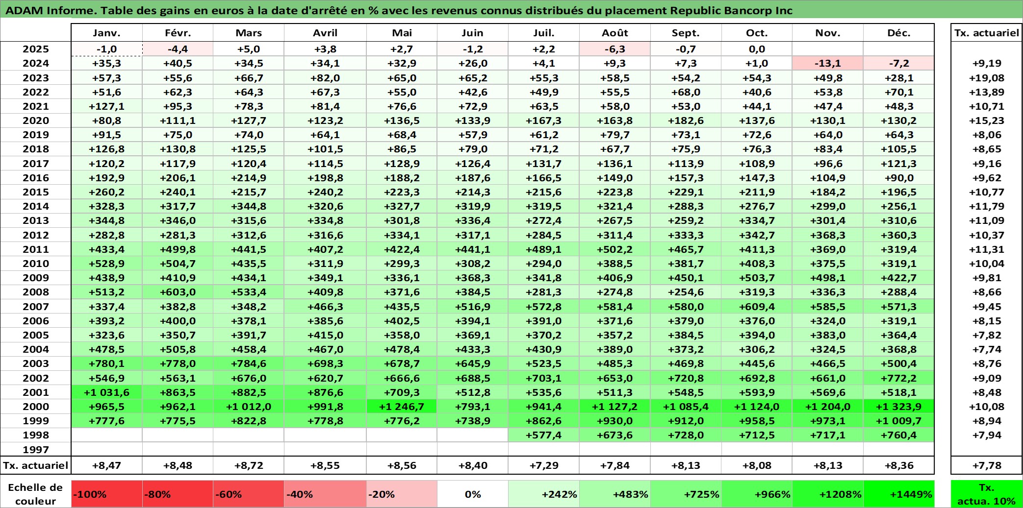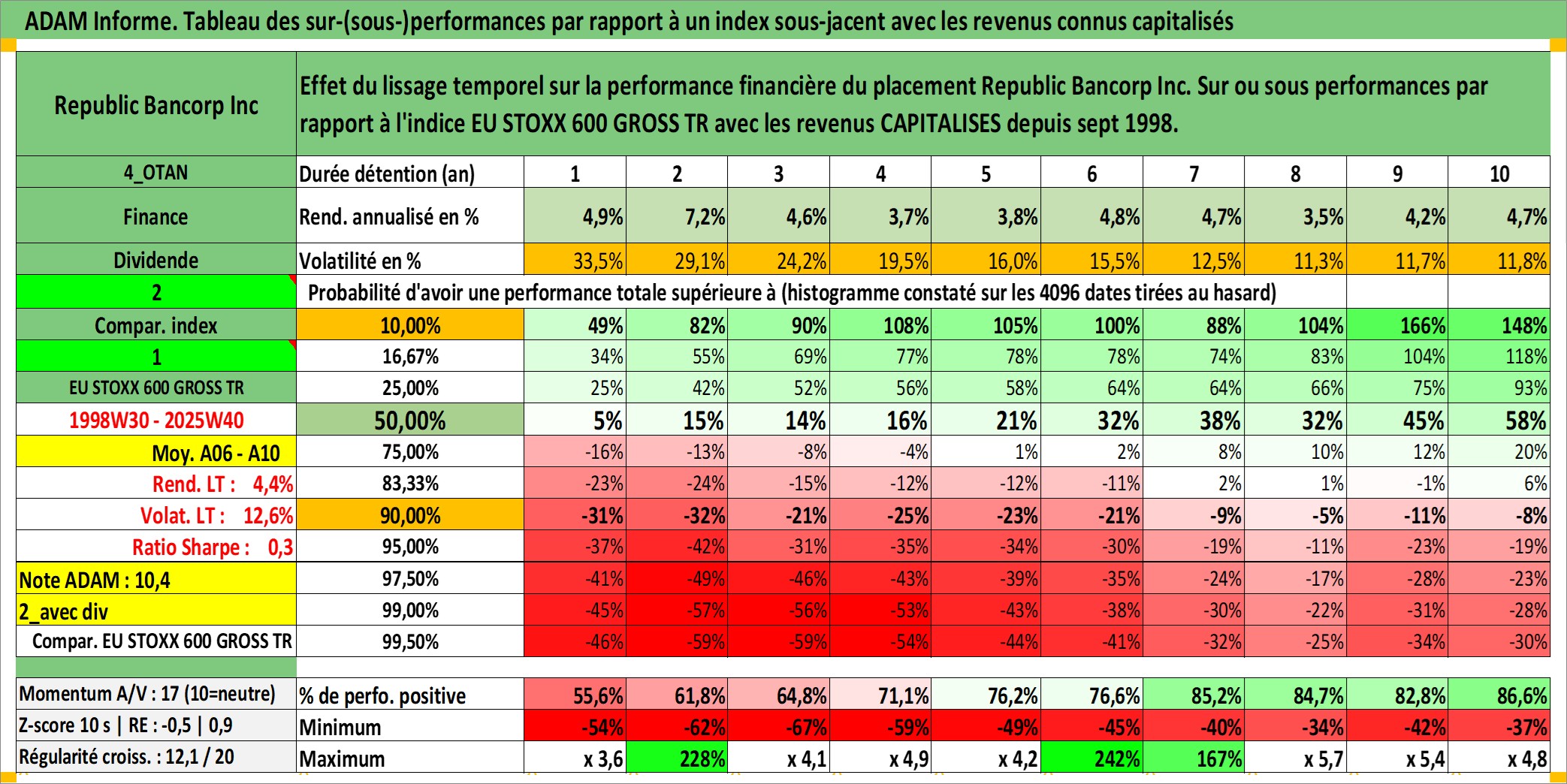 Site dédié aux investisseursPage dédiée sur site financeAnalyse des valorisations hebdomadaires de l'action Republic Bancorp Inc. Cet actif est cote en USD. Les valorisations sont en contrevaleur EURO et couvrent les semaines 1998W30 a 2025W40. Les revenus de cet actif financier sont pris en compte depuis la semaine 1998W38. La note ESG de cet actif n'est pas connue.