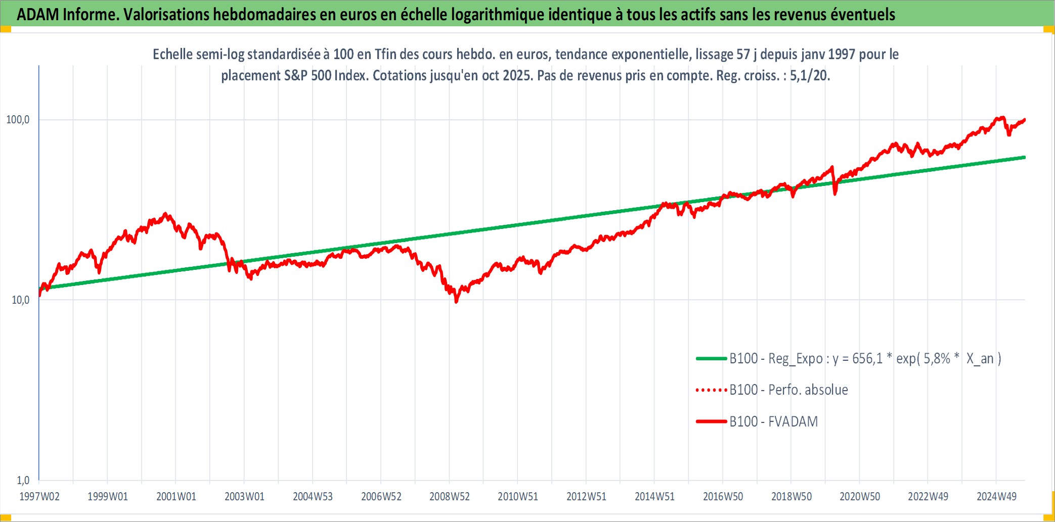 Site dédié aux investisseursPage dédiée sur site financeAnalyse des valorisations hebdomadaires de l'actif S&P 500 Index. Cet actif est cote en USD. Les valorisations sont en contrevaleur EURO et couvrent les semaines 1997W01 a 2025W40. Les revenus de cet actif financier ne sont pas connus car non existants ou non disponibles sur le site Yahoo Finance. La note ESG de cet actif n'est pas connue.