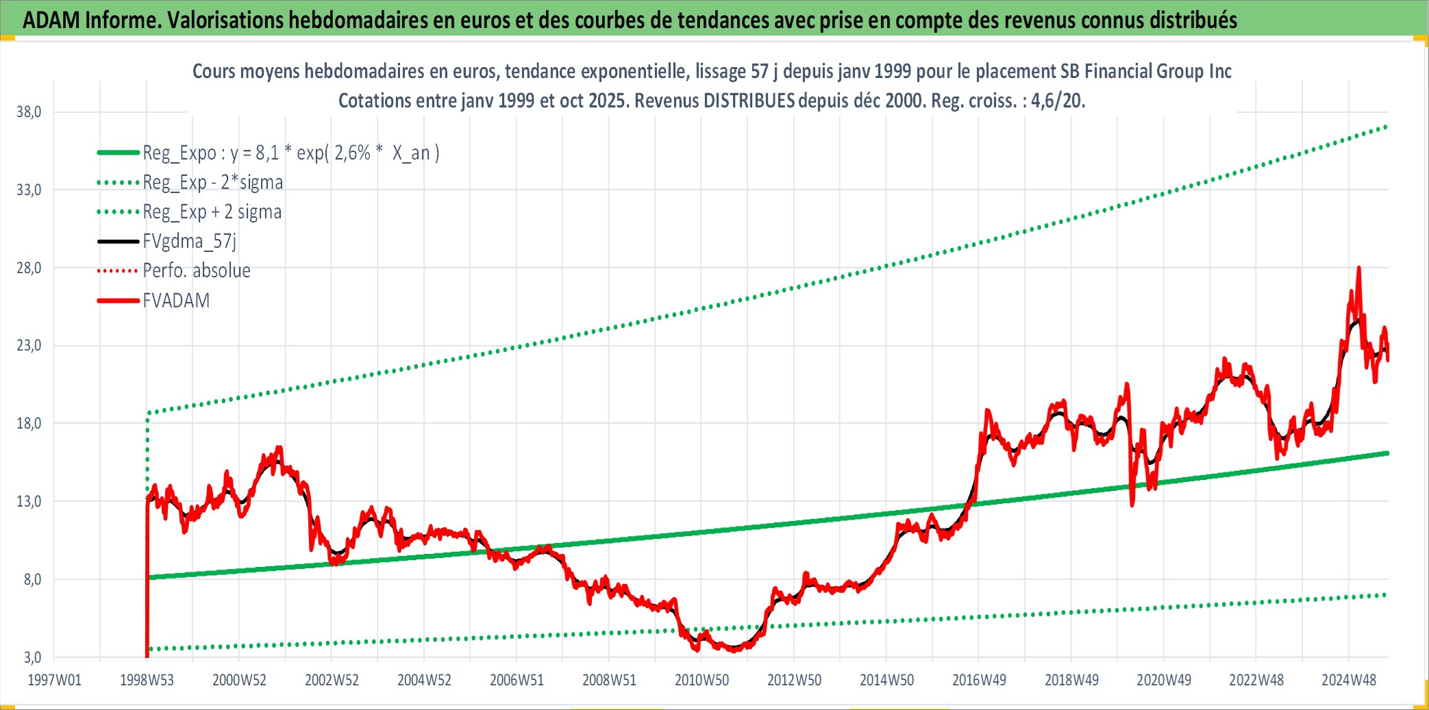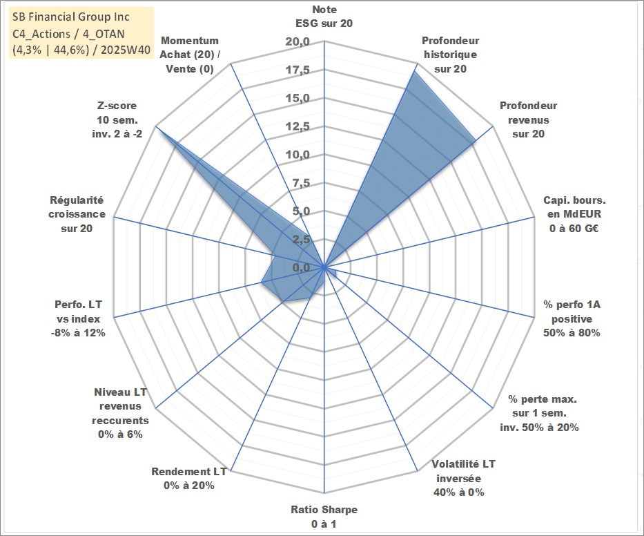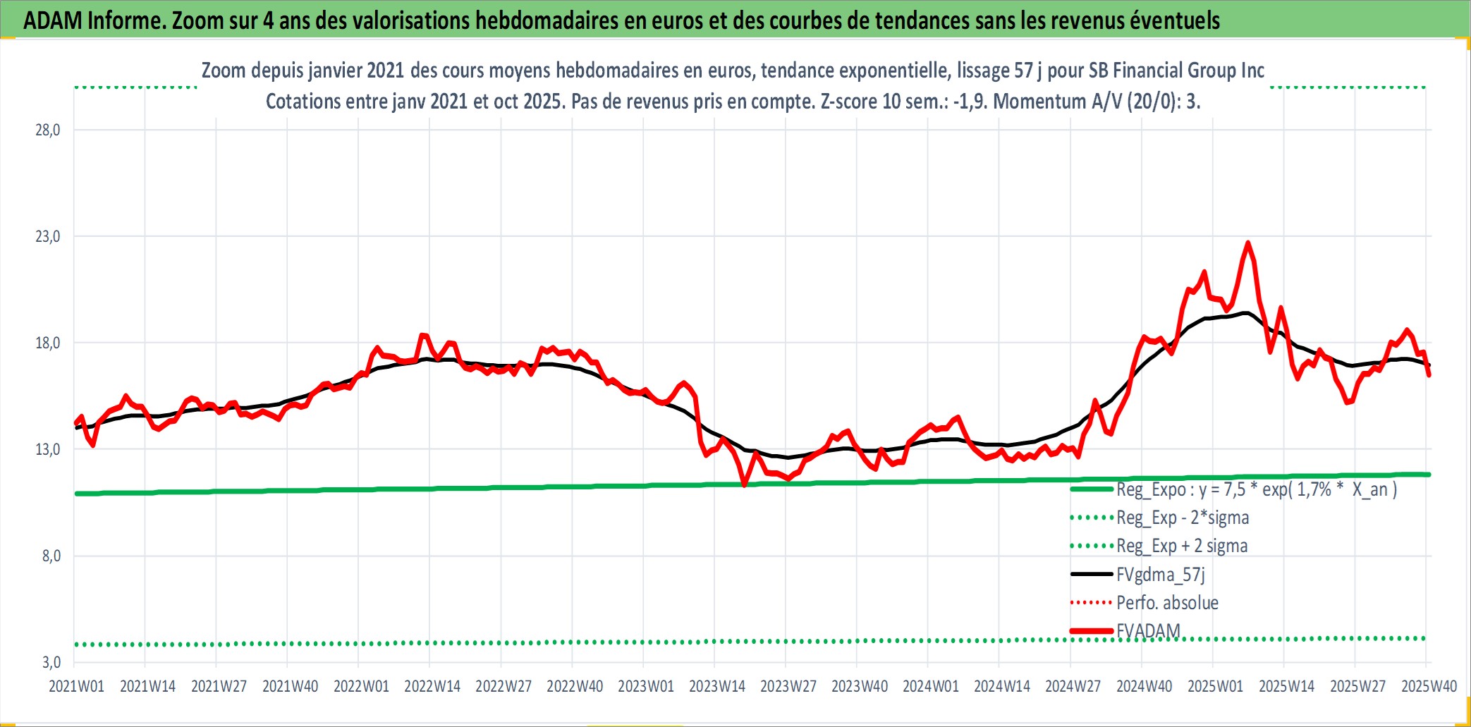 Site dédié aux investisseursPage dédiée sur site financeAnalyse des valorisations hebdomadaires de l'action SB Financial Group Inc. Cet actif est cote en USD. Les valorisations sont en contrevaleur EURO et couvrent les semaines 1999W01 a 2025W40. Les revenus de cet actif financier sont pris en compte depuis la semaine 2000W50. La note ESG de cet actif n'est pas connue.