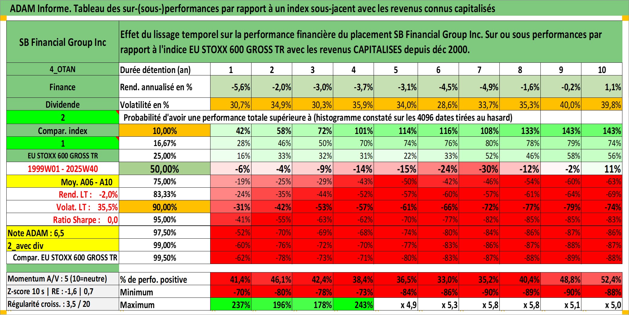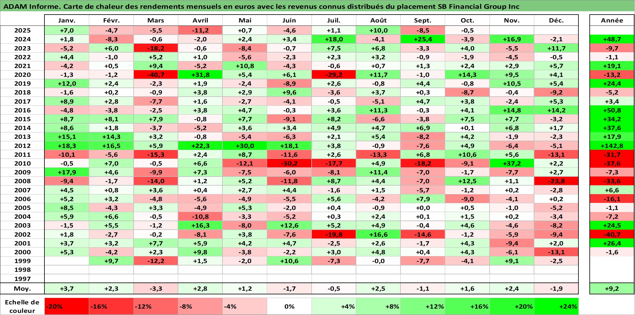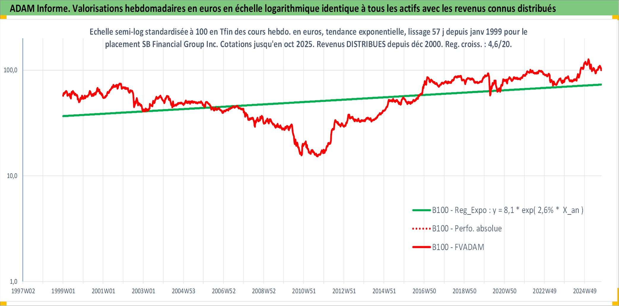 Site dédié aux investisseursPage dédiée sur site financeAnalyse des valorisations hebdomadaires de l'action SB Financial Group Inc. Cet actif est cote en USD. Les valorisations sont en contrevaleur EURO et couvrent les semaines 1999W01 a 2025W40. Les revenus de cet actif financier sont pris en compte depuis la semaine 2000W50. La note ESG de cet actif n'est pas connue.