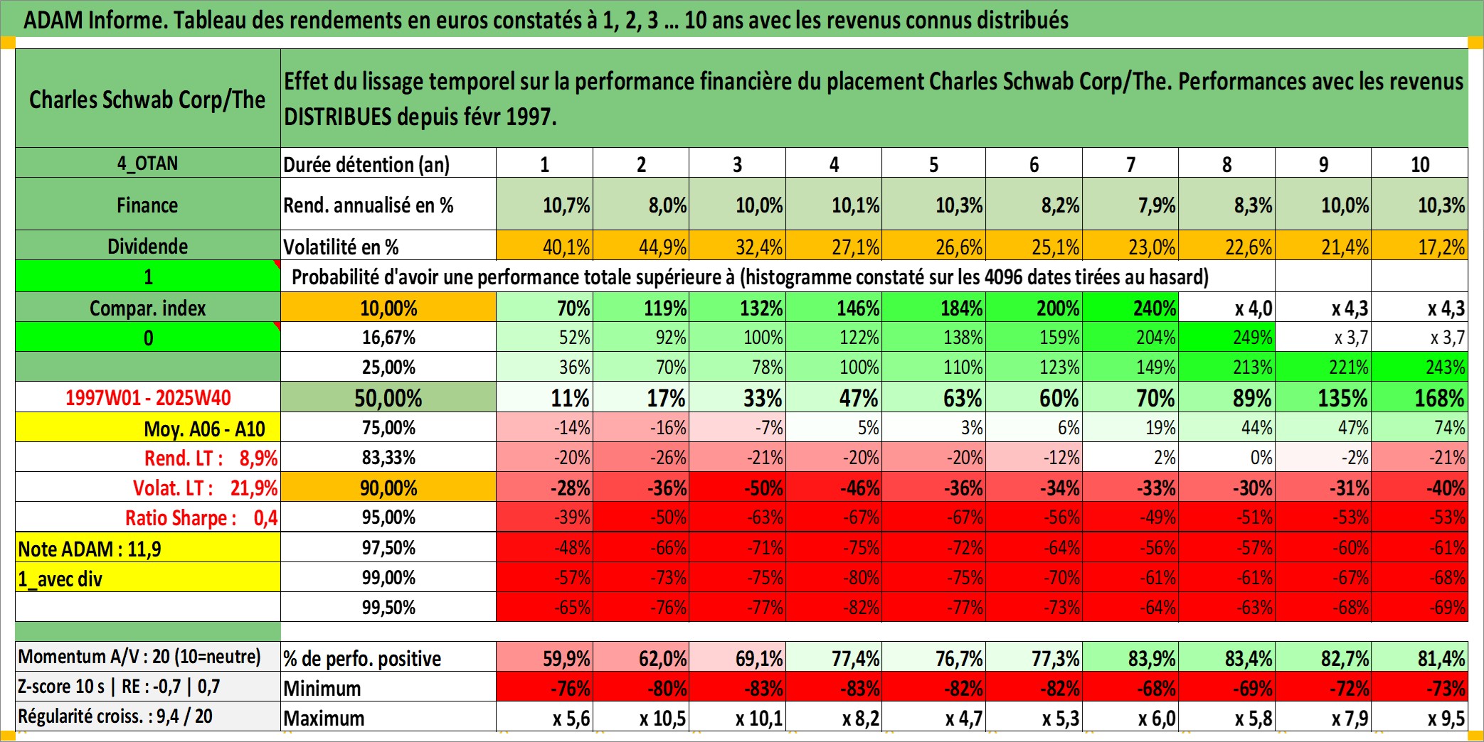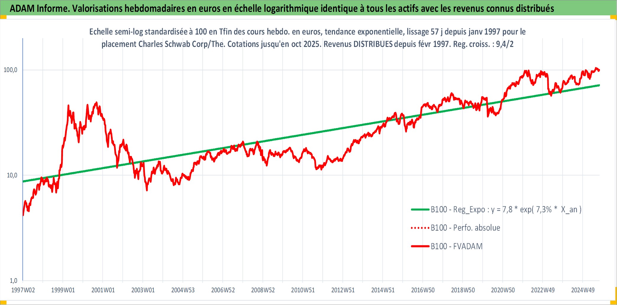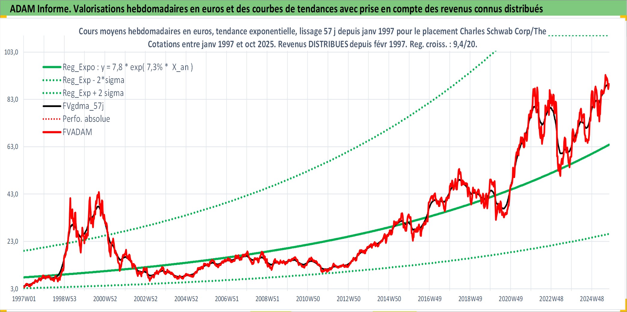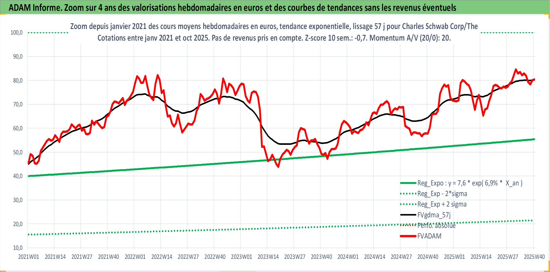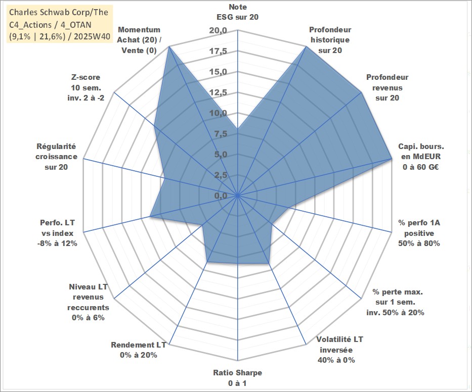 Site dédié aux investisseursPage dédiée sur site financeAnalyse des valorisations hebdomadaires de l'action Charles Schwab Corp/The. Cet actif est cote en USD. Les valorisations sont en contrevaleur EURO et couvrent les semaines 1997W01 a 2025W40. Les revenus de cet actif financier sont pris en compte depuis la semaine 1997W07. La note globale ESG de cet actif est estimee a 8.0 (apres rebasage entre 0 et 20).