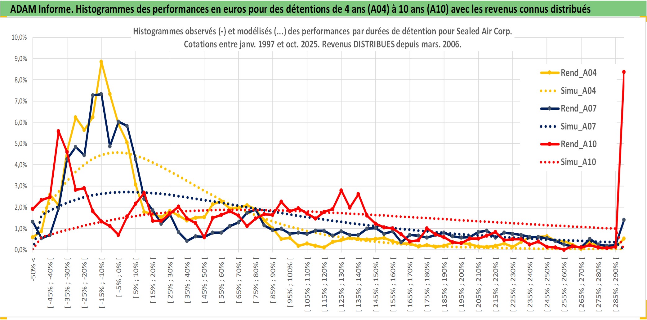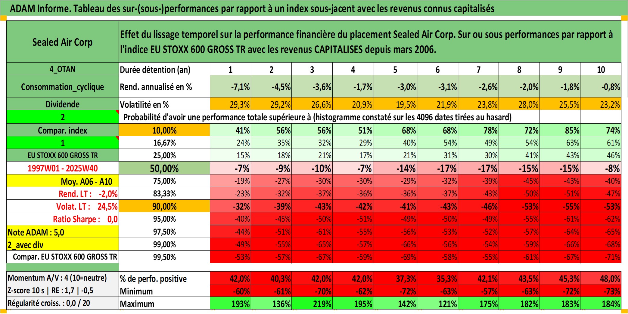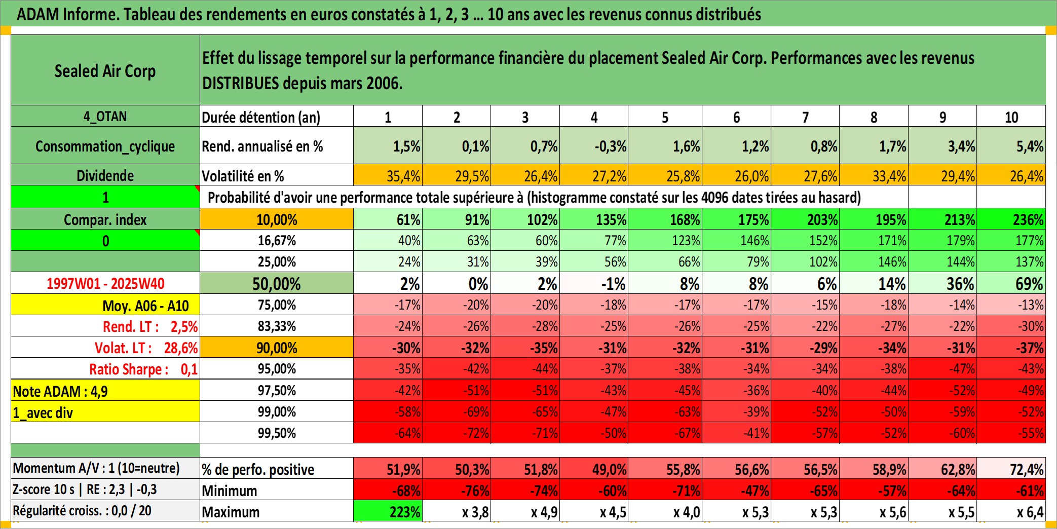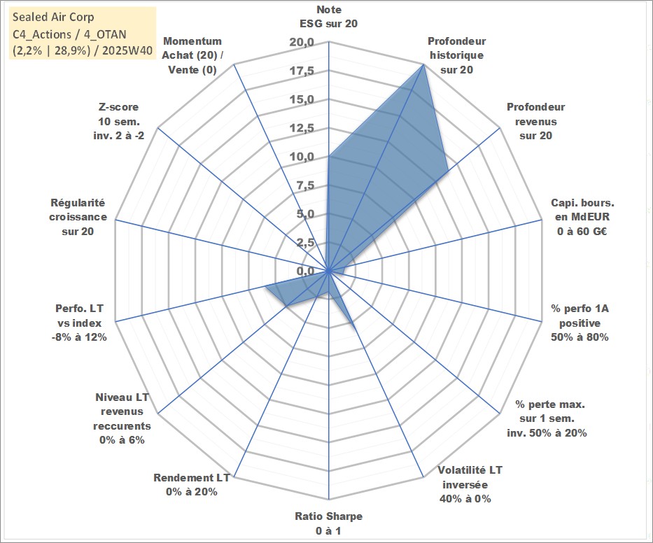 Site dédié aux investisseursPage dédiée sur site financeAnalyse des valorisations hebdomadaires de l'action Sealed Air Corp. Cet actif est cote en USD. Les valorisations sont en contrevaleur EURO et couvrent les semaines 1997W01 a 2025W40. Les revenus de cet actif financier sont pris en compte depuis la semaine 2006W09. La note globale ESG de cet actif est estimee a 10.0 (apres rebasage entre 0 et 20).