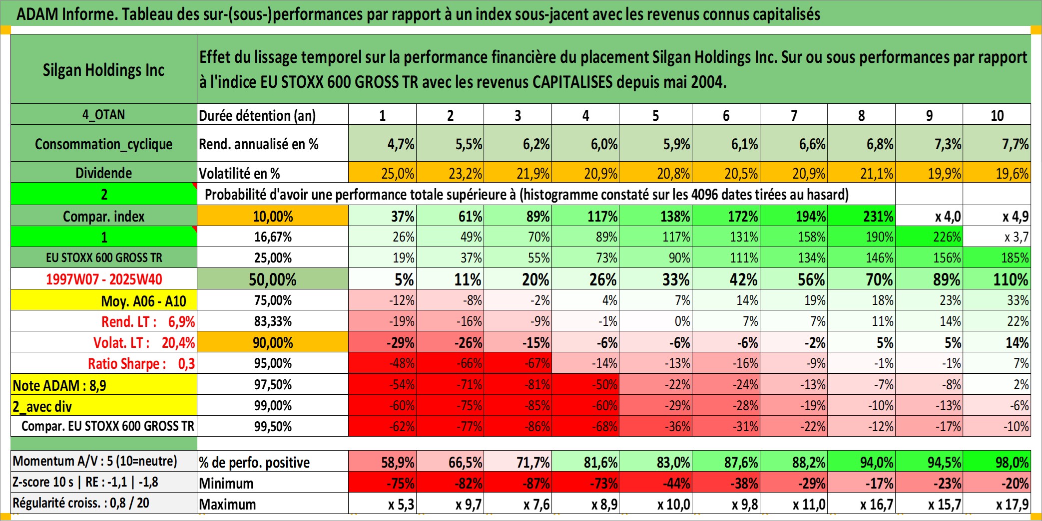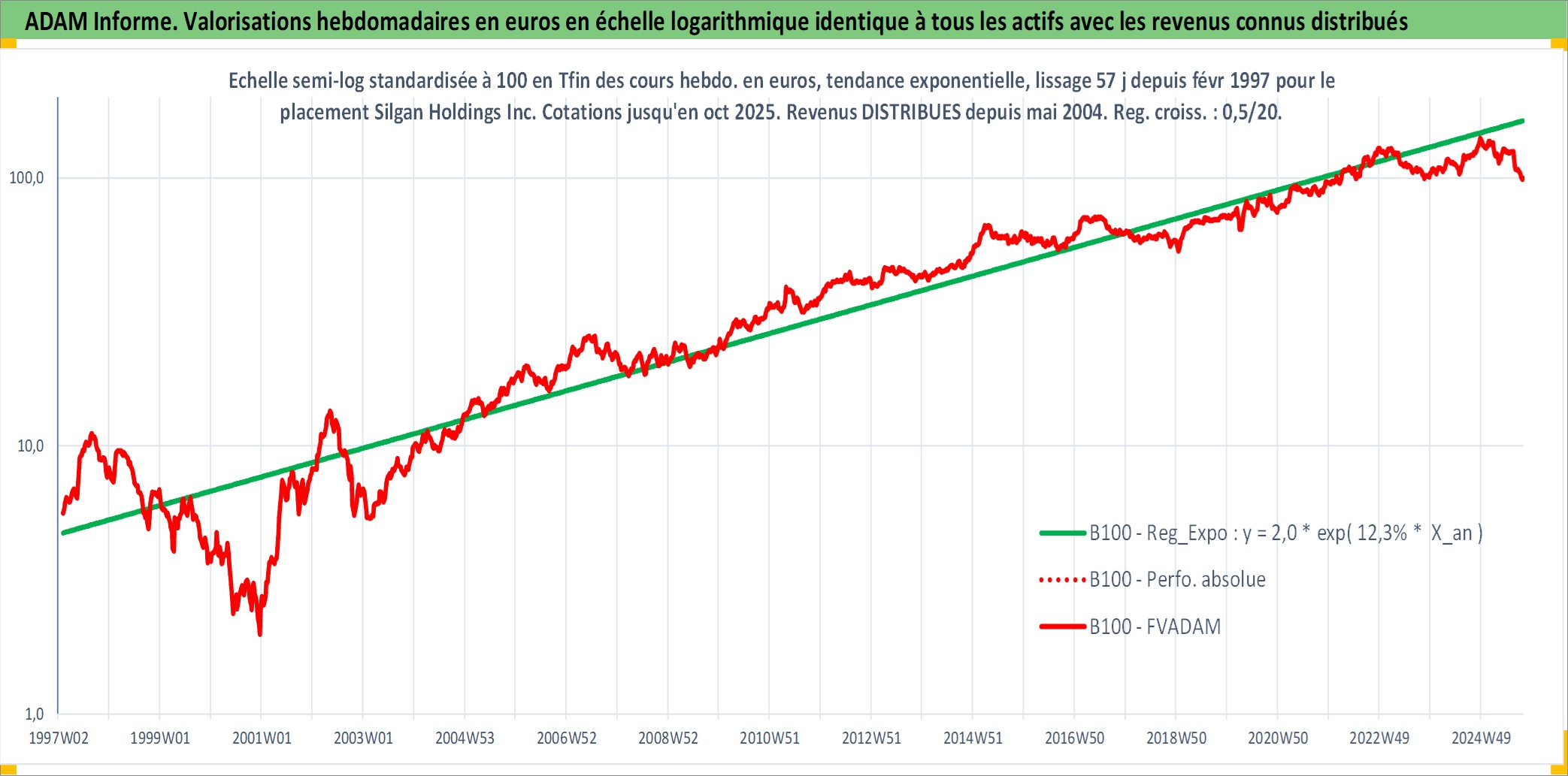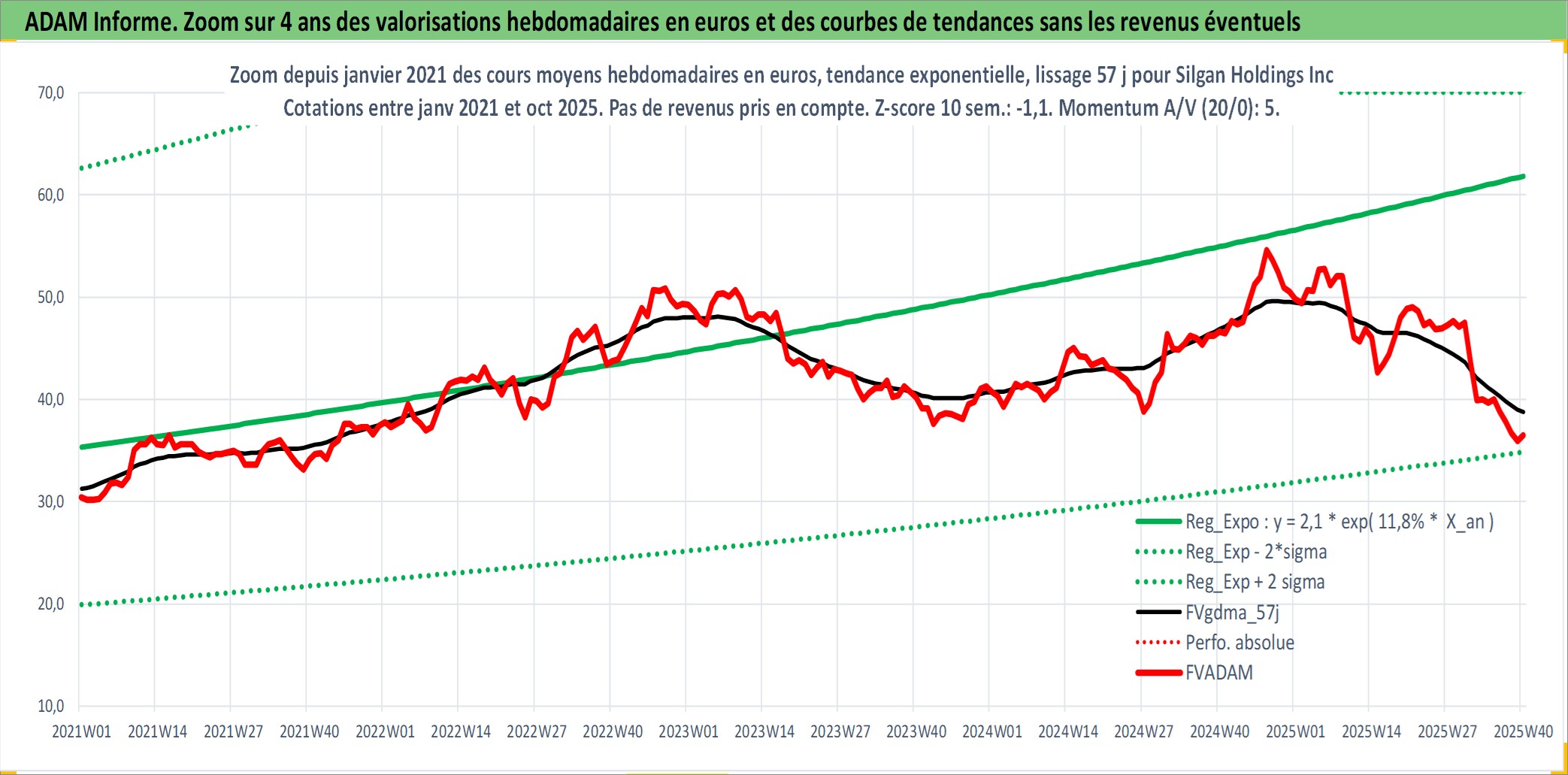 Site dédié aux investisseursPage dédiée sur site financeAnalyse des valorisations hebdomadaires de l'action Silgan Holdings Inc. Cet actif est cote en USD. Les valorisations sont en contrevaleur EURO et couvrent les semaines 1997W07 a 2025W40. Les revenus de cet actif financier sont pris en compte depuis la semaine 2004W22. La note ESG de cet actif n'est pas connue.