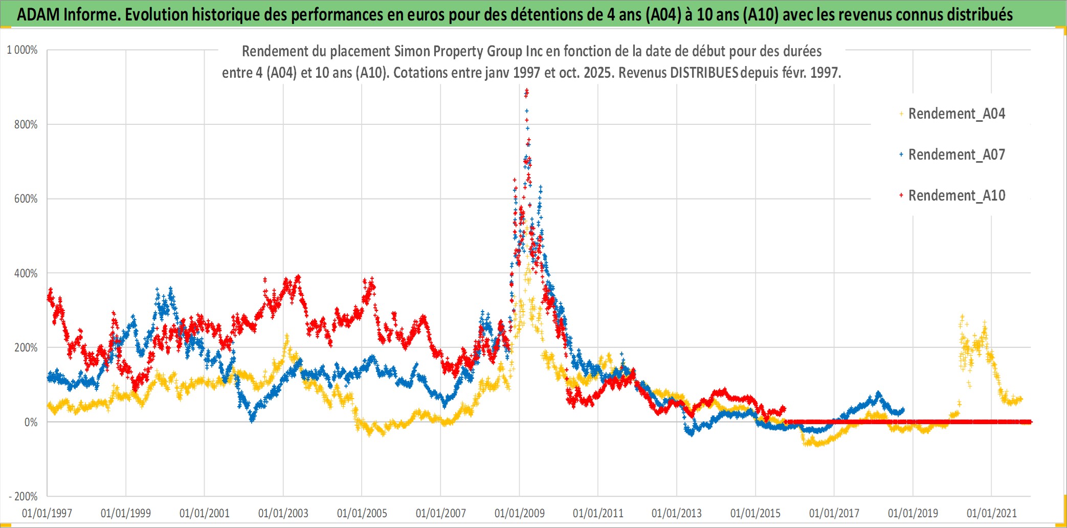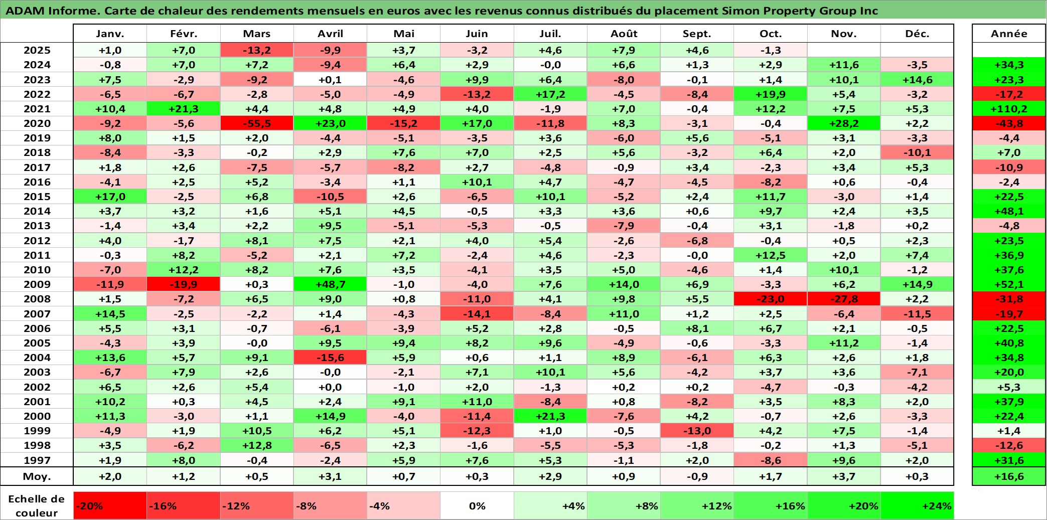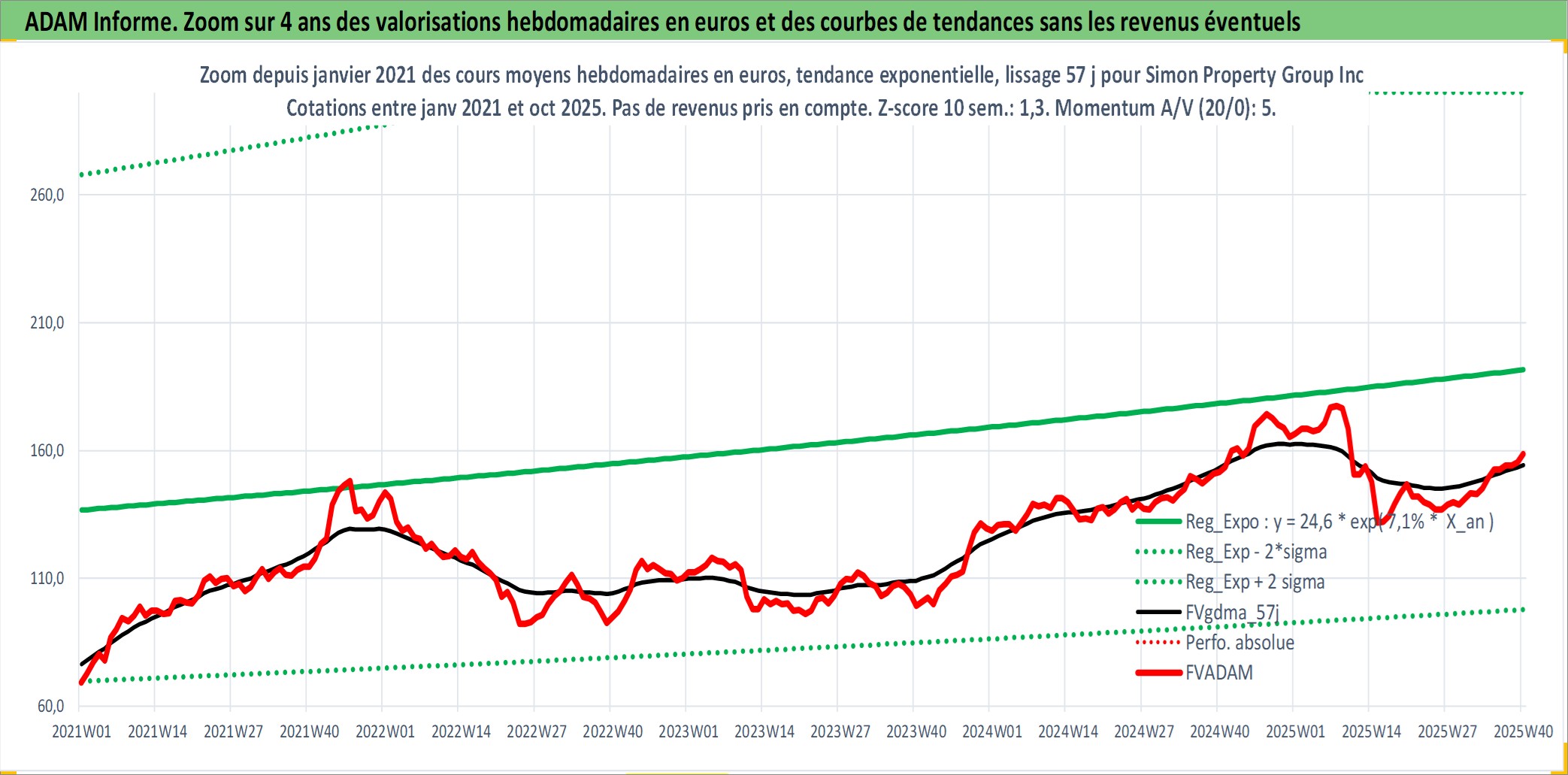 Site dédié aux investisseursPage dédiée sur site financeAnalyse des valorisations hebdomadaires de l'action Simon Property Group Inc. Cet actif est cote en USD. Les valorisations sont en contrevaleur EURO et couvrent les semaines 1997W01 a 2025W40. Les revenus de cet actif financier sont pris en compte depuis la semaine 1997W06. La note globale ESG de cet actif est estimee a 14.0 (apres rebasage entre 0 et 20).