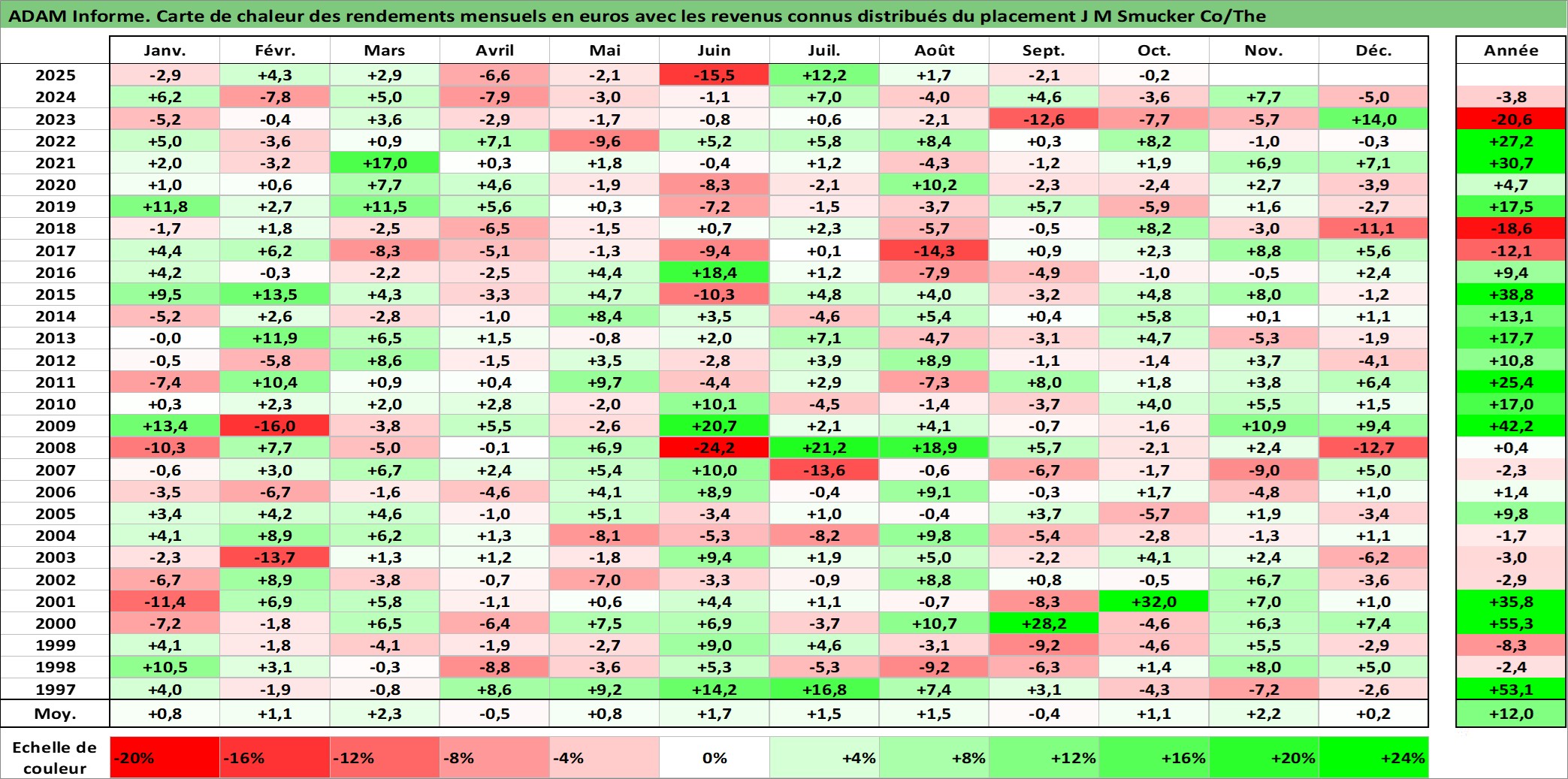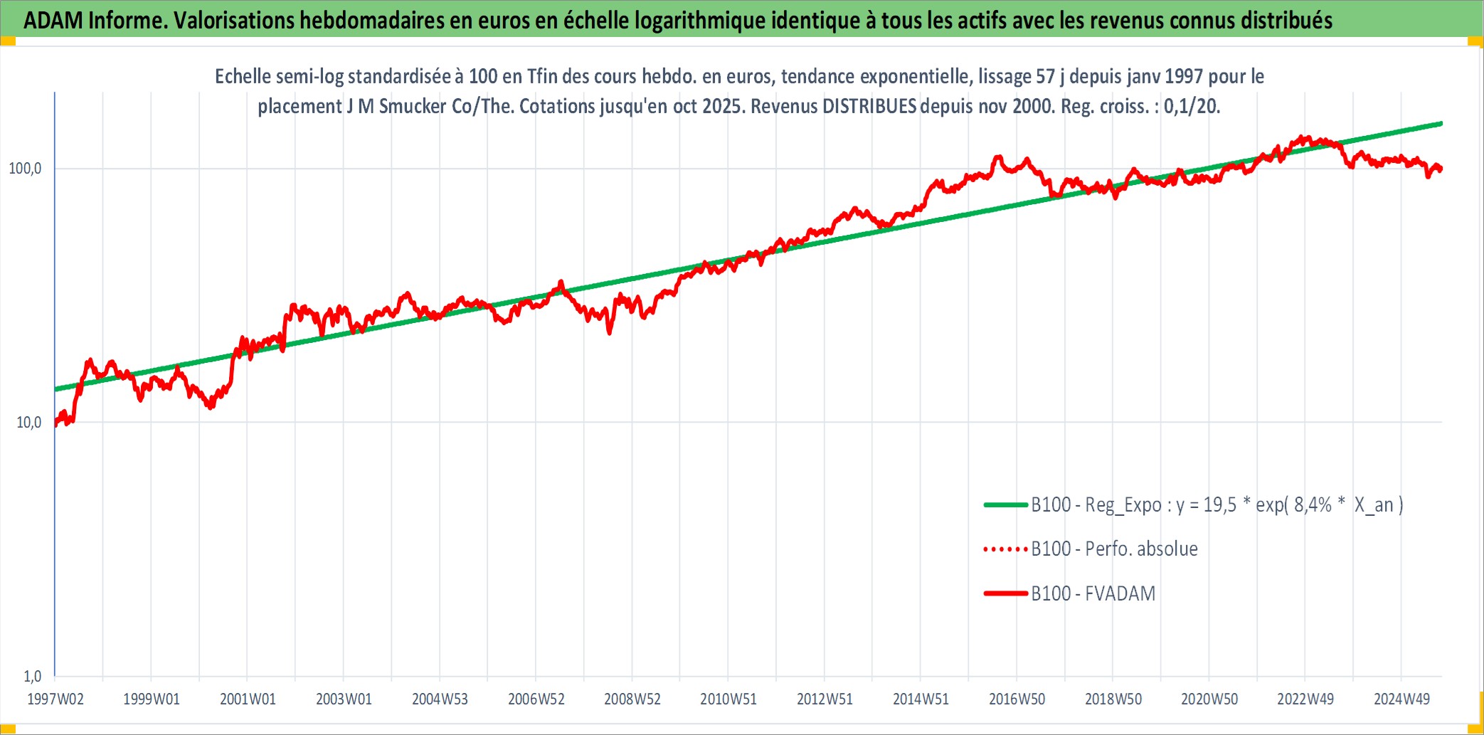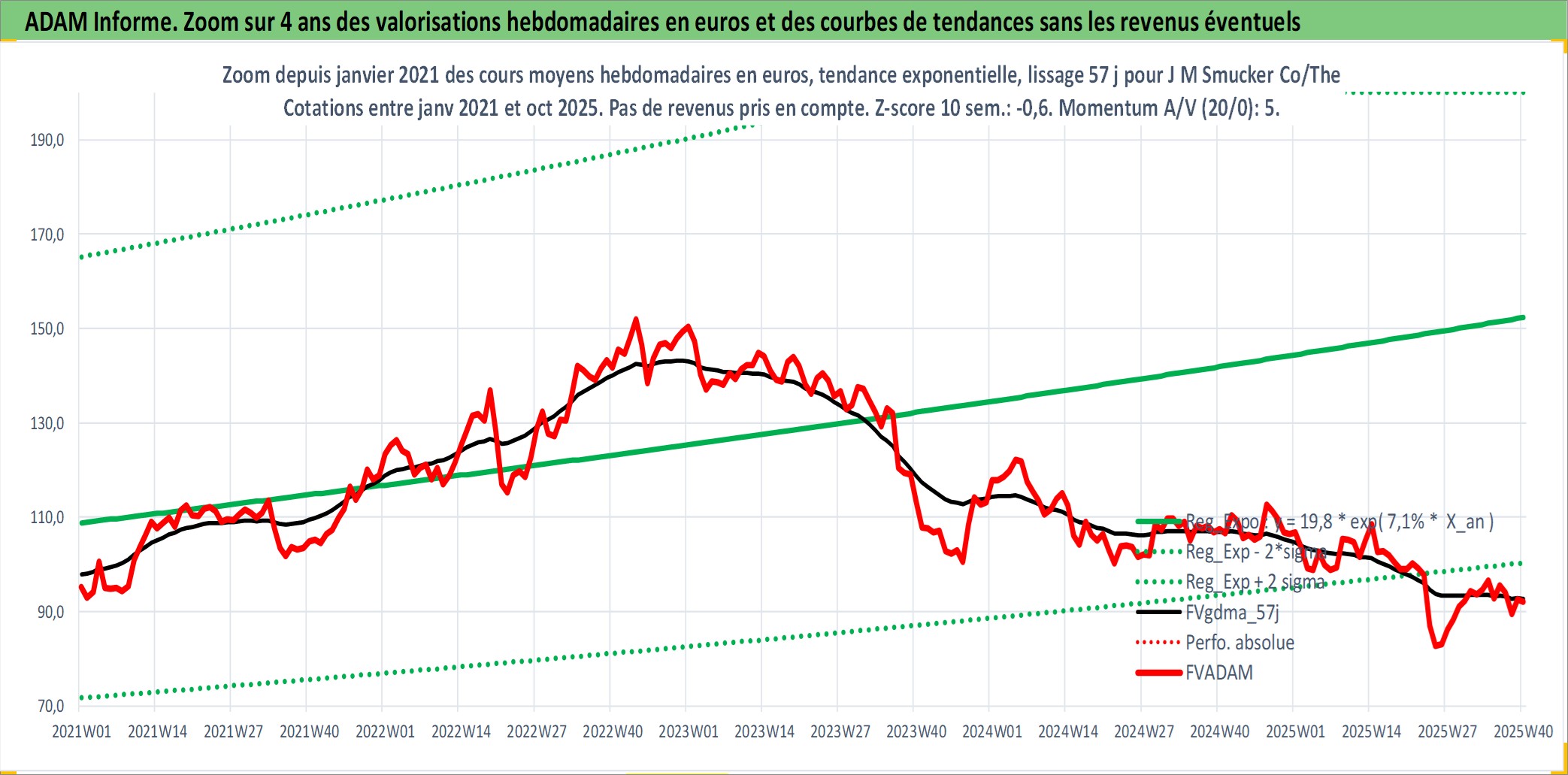 Site dédié aux investisseursPage dédiée sur site financeAnalyse des valorisations hebdomadaires de l'action J M Smucker Co/The. Cet actif est cote en USD. Les valorisations sont en contrevaleur EURO et couvrent les semaines 1997W01 a 2025W40. Les revenus de cet actif financier sont pris en compte depuis la semaine 2000W46. La note globale ESG de cet actif est estimee a 5.0 (apres rebasage entre 0 et 20).
