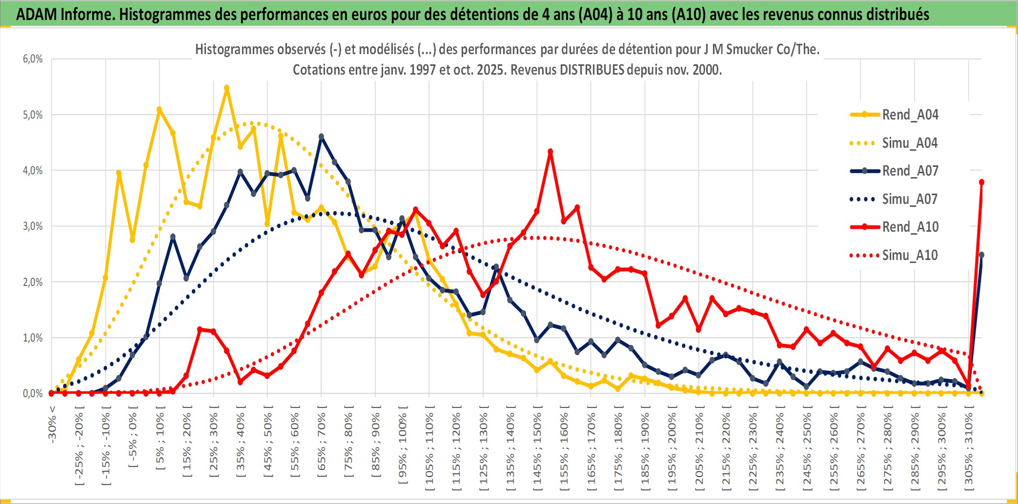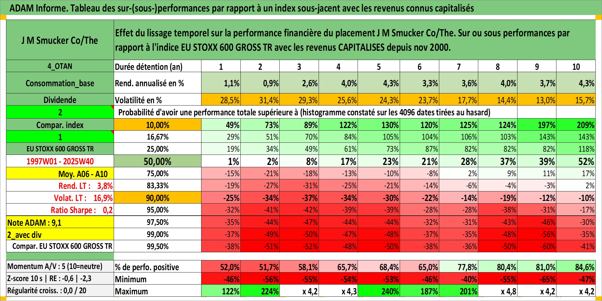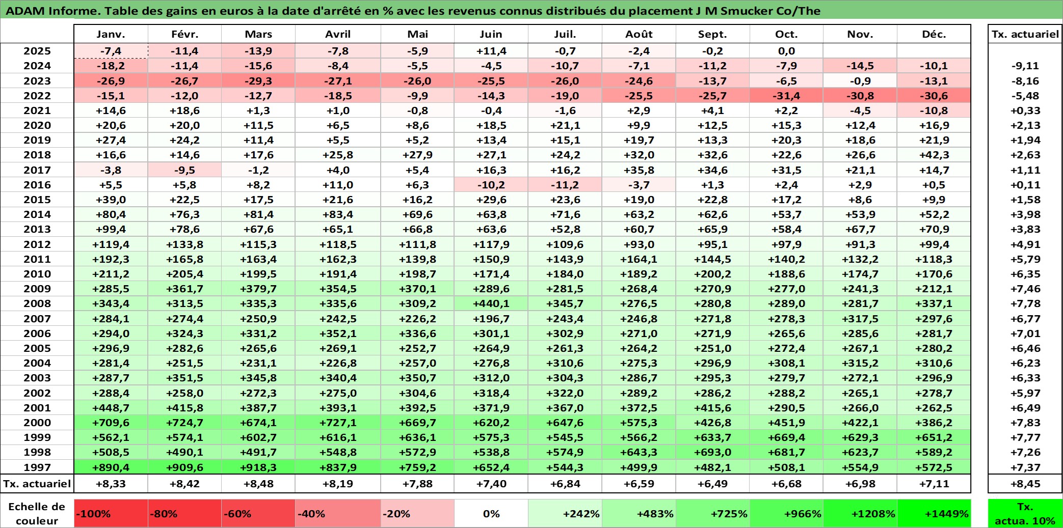 Site dédié aux investisseursPage dédiée sur site financeAnalyse des valorisations hebdomadaires de l'action J M Smucker Co/The. Cet actif est cote en USD. Les valorisations sont en contrevaleur EURO et couvrent les semaines 1997W01 a 2025W40. Les revenus de cet actif financier sont pris en compte depuis la semaine 2000W46. La note globale ESG de cet actif est estimee a 5.0 (apres rebasage entre 0 et 20).