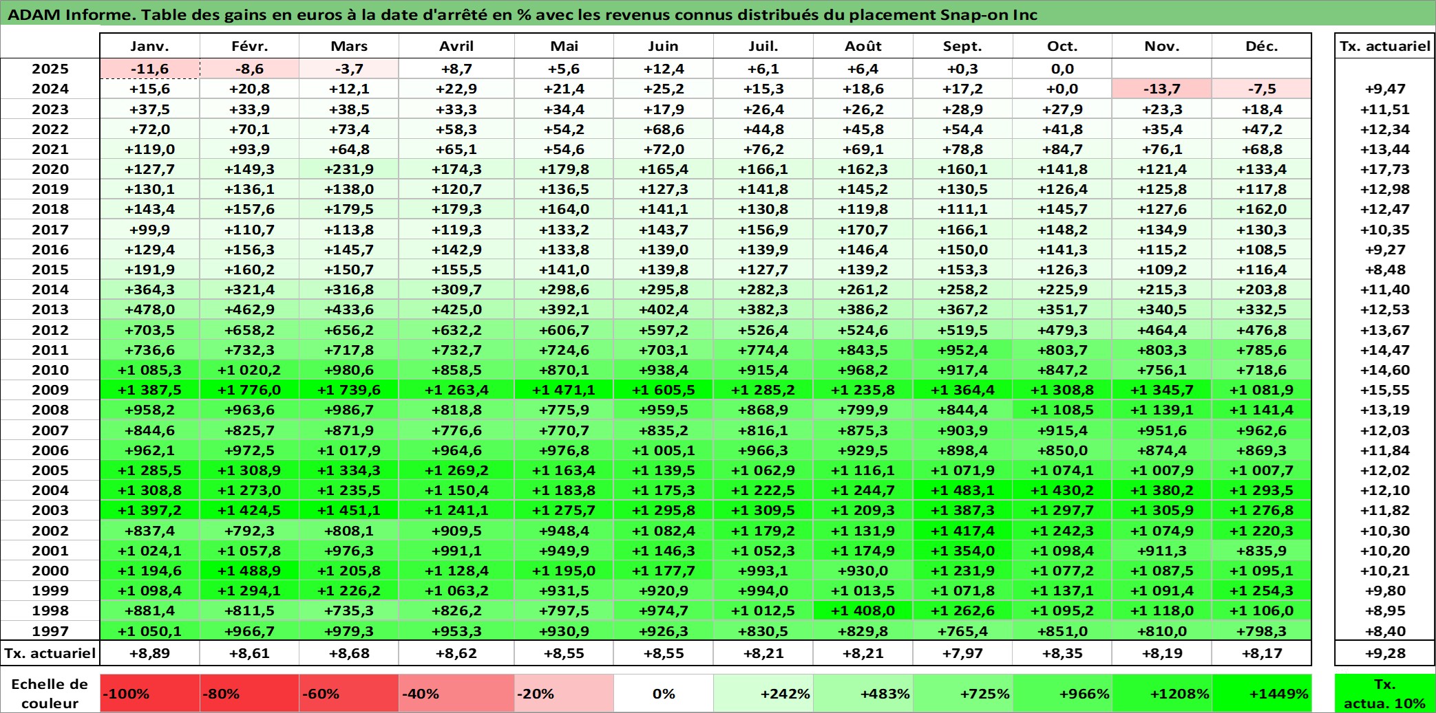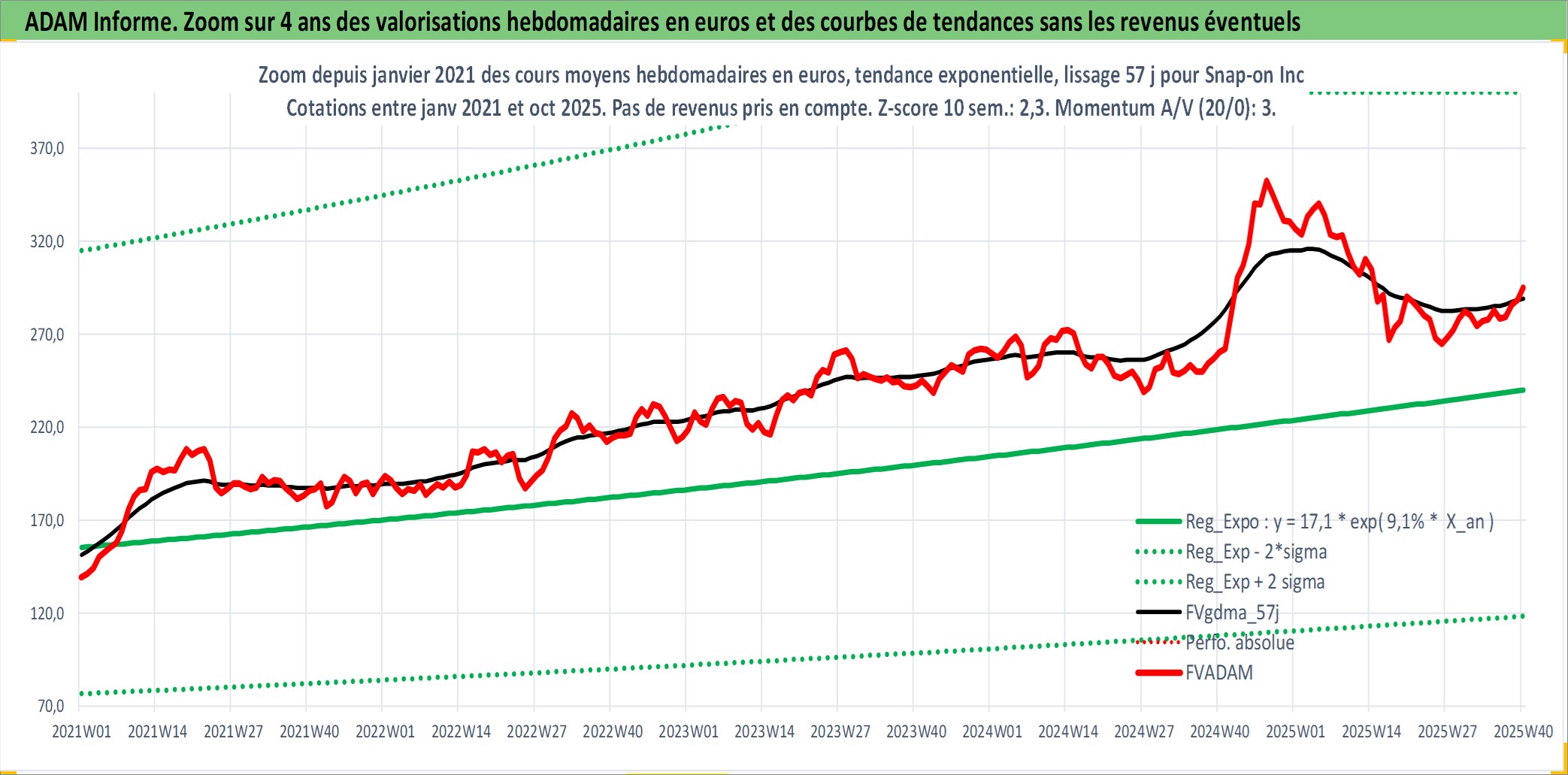 Site dédié aux investisseursPage dédiée sur site financeAnalyse des valorisations hebdomadaires de l'action Snap-on Inc. Cet actif est cote en USD. Les valorisations sont en contrevaleur EURO et couvrent les semaines 1997W01 a 2025W40. Les revenus de cet actif financier sont pris en compte depuis la semaine 1997W07. La note globale ESG de cet actif est estimee a 5.0 (apres rebasage entre 0 et 20).