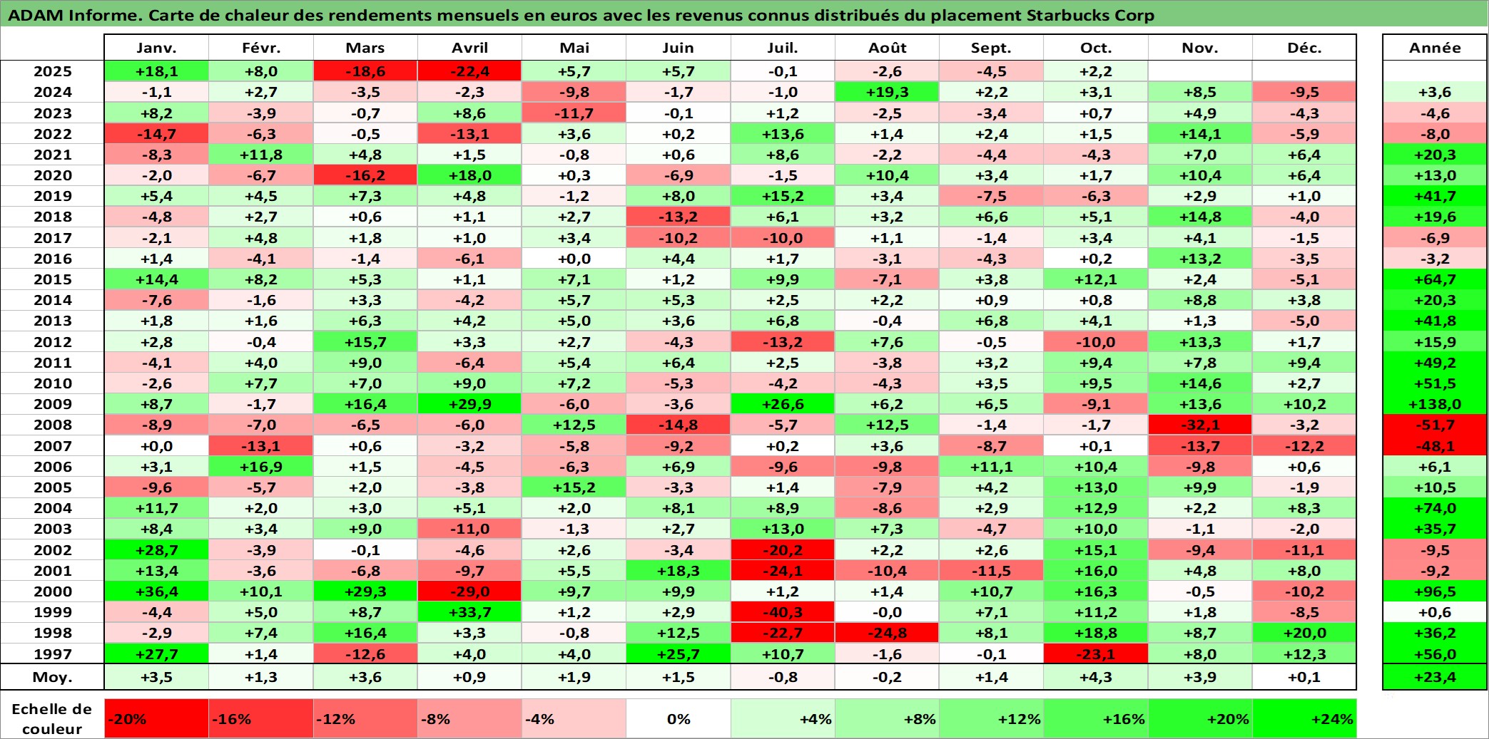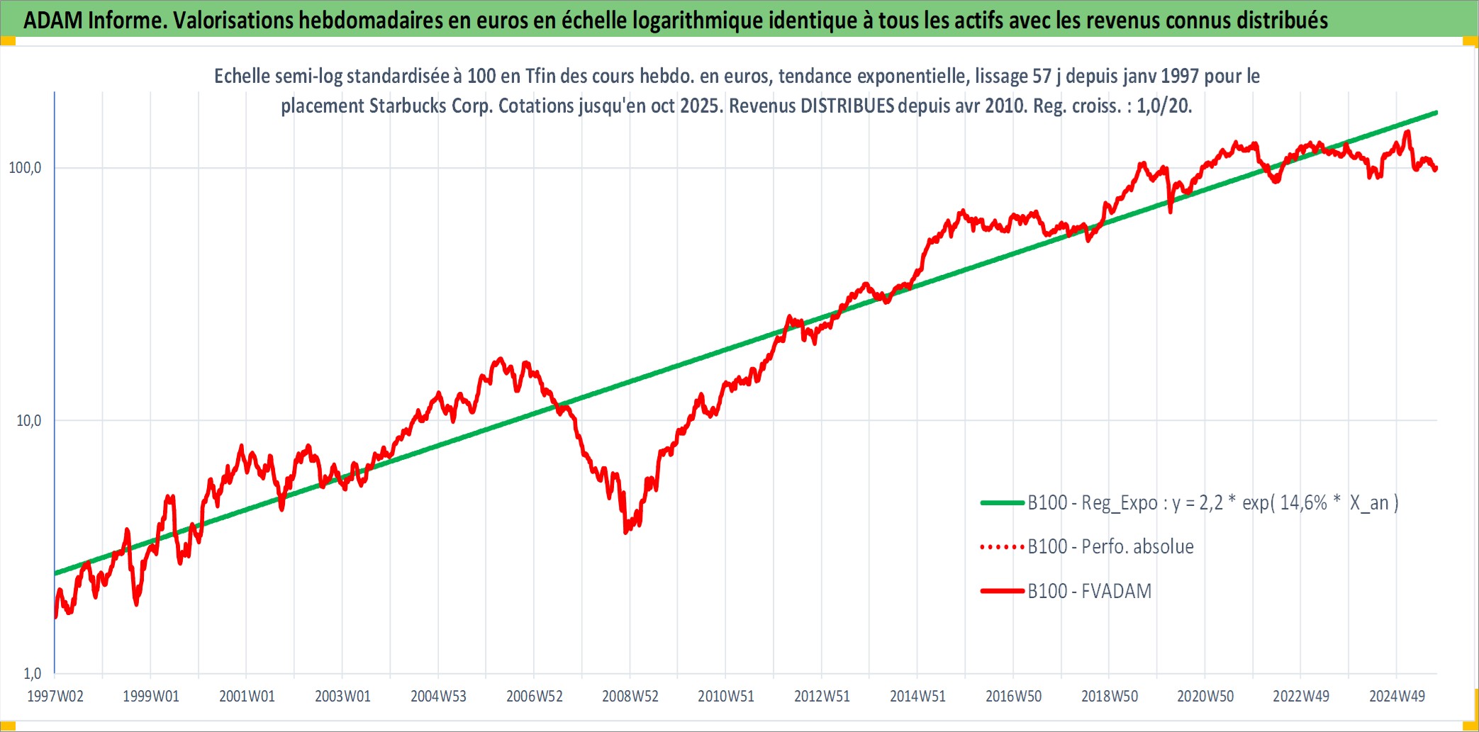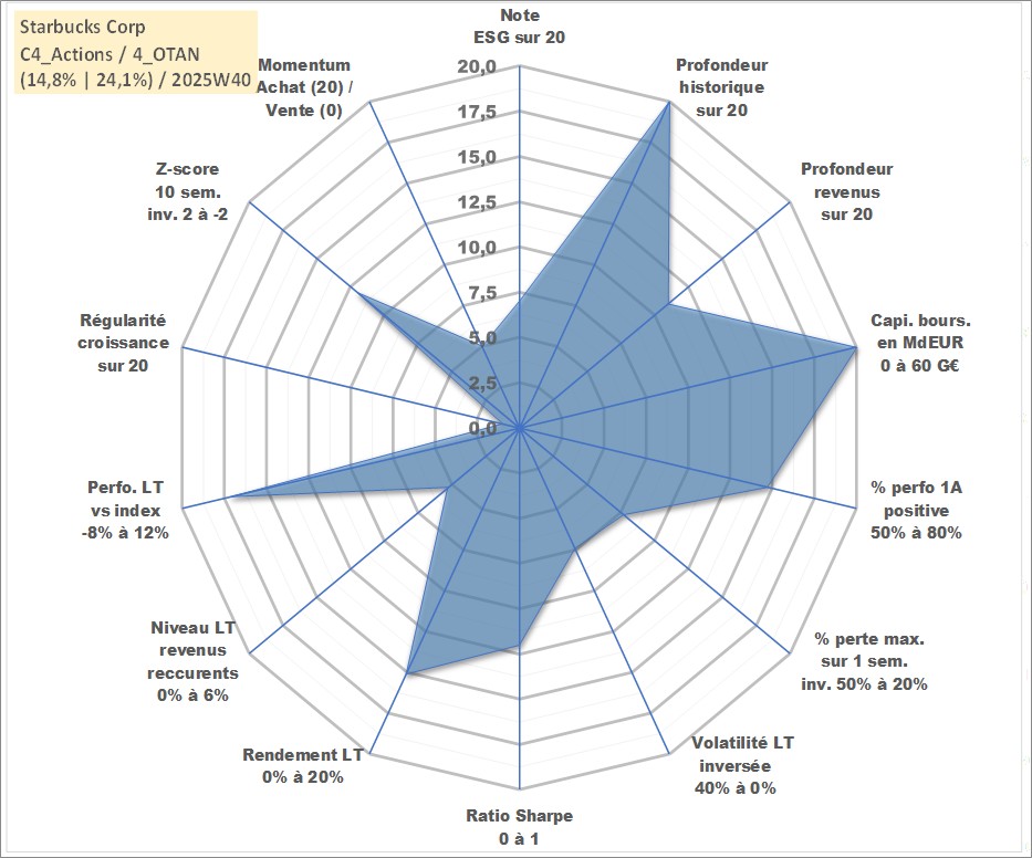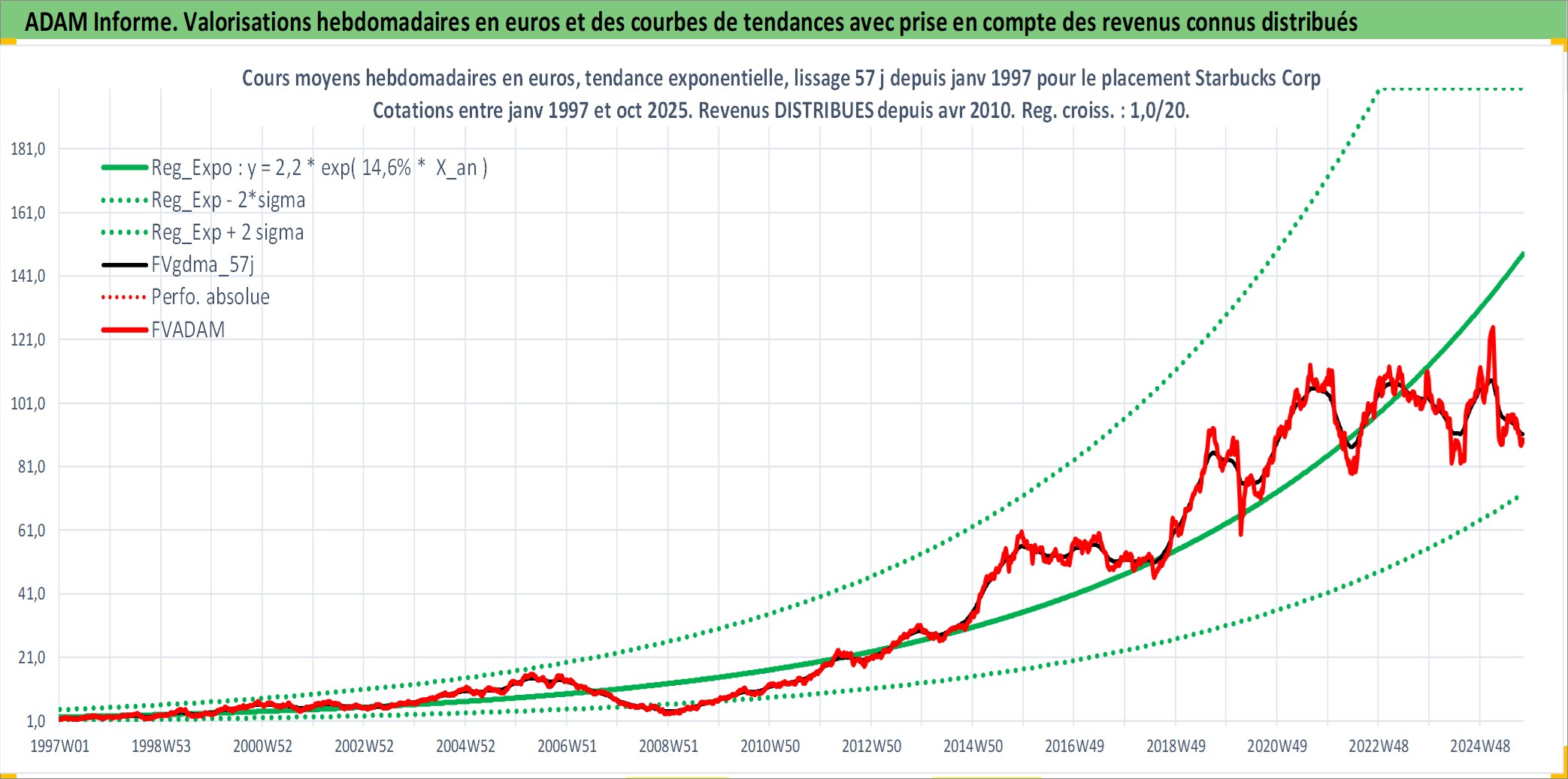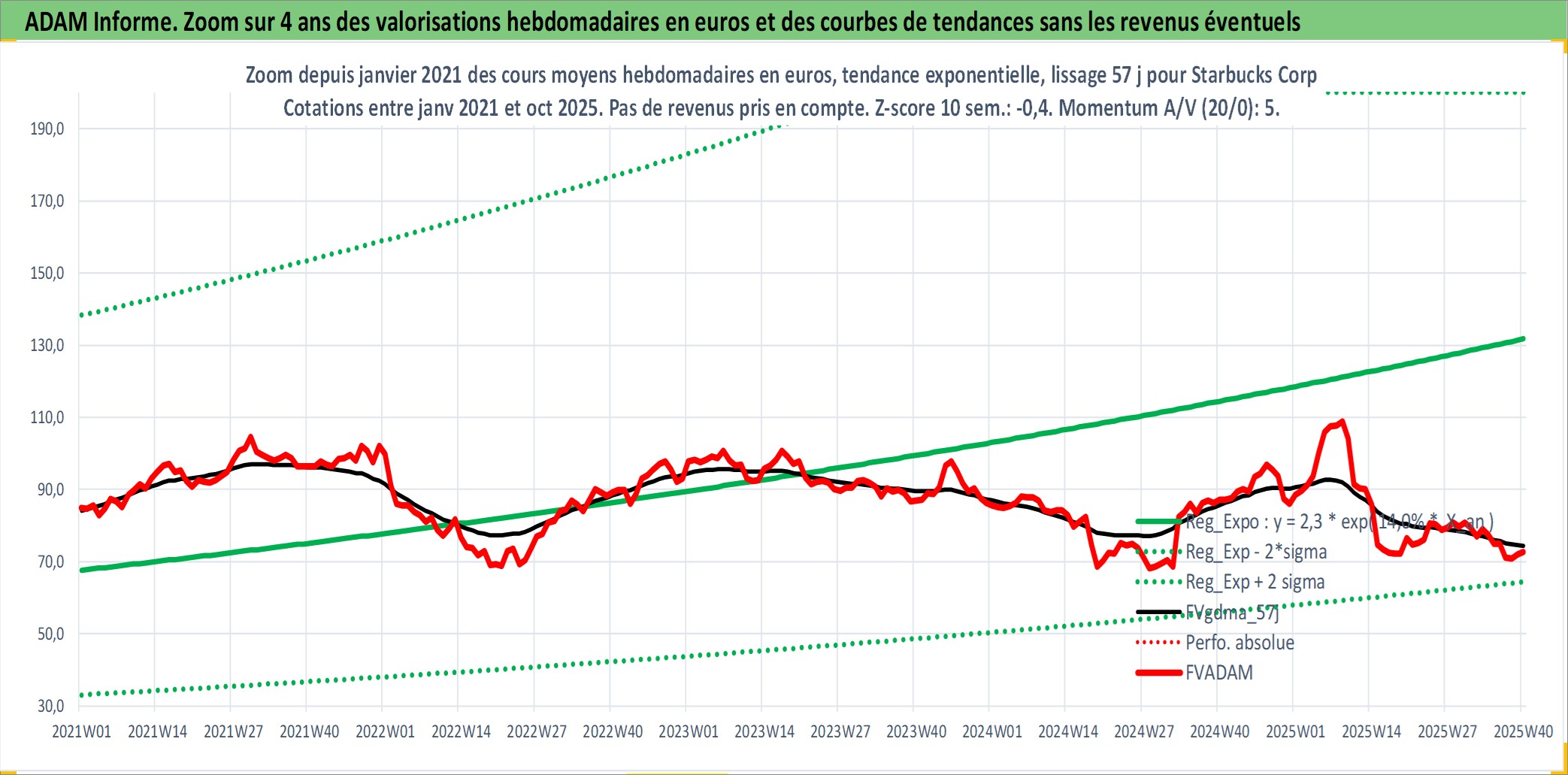 Site dédié aux investisseursPage dédiée sur site financeAnalyse des valorisations hebdomadaires de l'action Starbucks Corp. Cet actif est cote en USD. Les valorisations sont en contrevaleur EURO et couvrent les semaines 1997W01 a 2025W40. Les revenus de cet actif financier sont pris en compte depuis la semaine 2010W14. La note globale ESG de cet actif est estimee a 7.0 (apres rebasage entre 0 et 20).