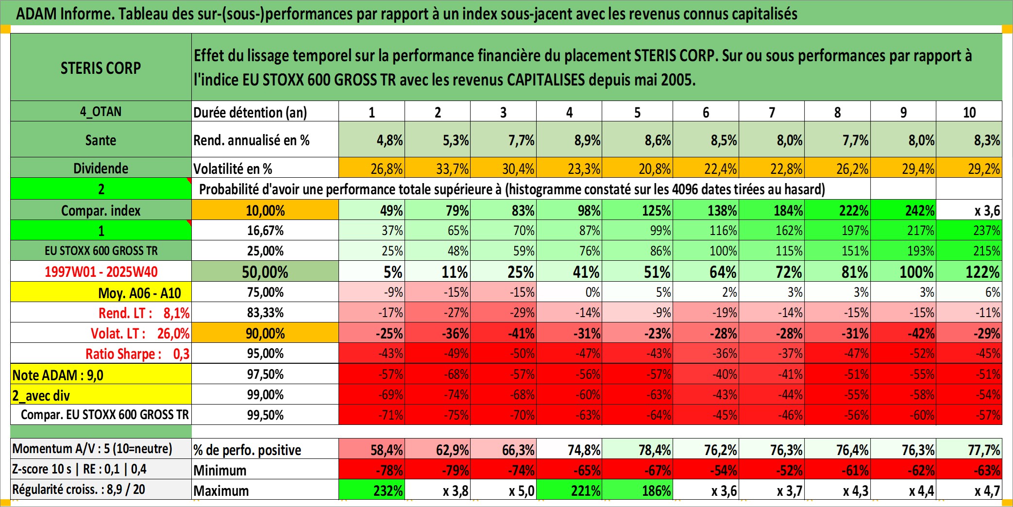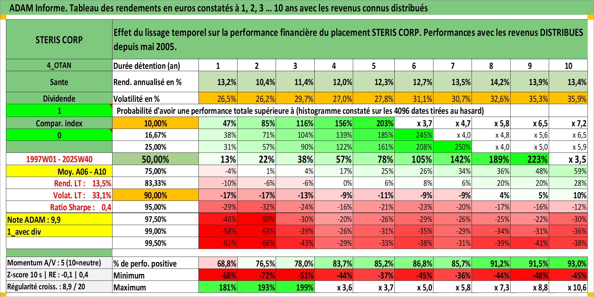 Site dédié aux investisseursPage dédiée sur site financeAnalyse des valorisations hebdomadaires de l'action STERIS CORP. Cet actif est cote en USD. Les valorisations sont en contrevaleur EURO et couvrent les semaines 1997W01 a 2025W40. Les revenus de cet actif financier sont pris en compte depuis la semaine 2005W21. La note ESG de cet actif n'est pas connue.