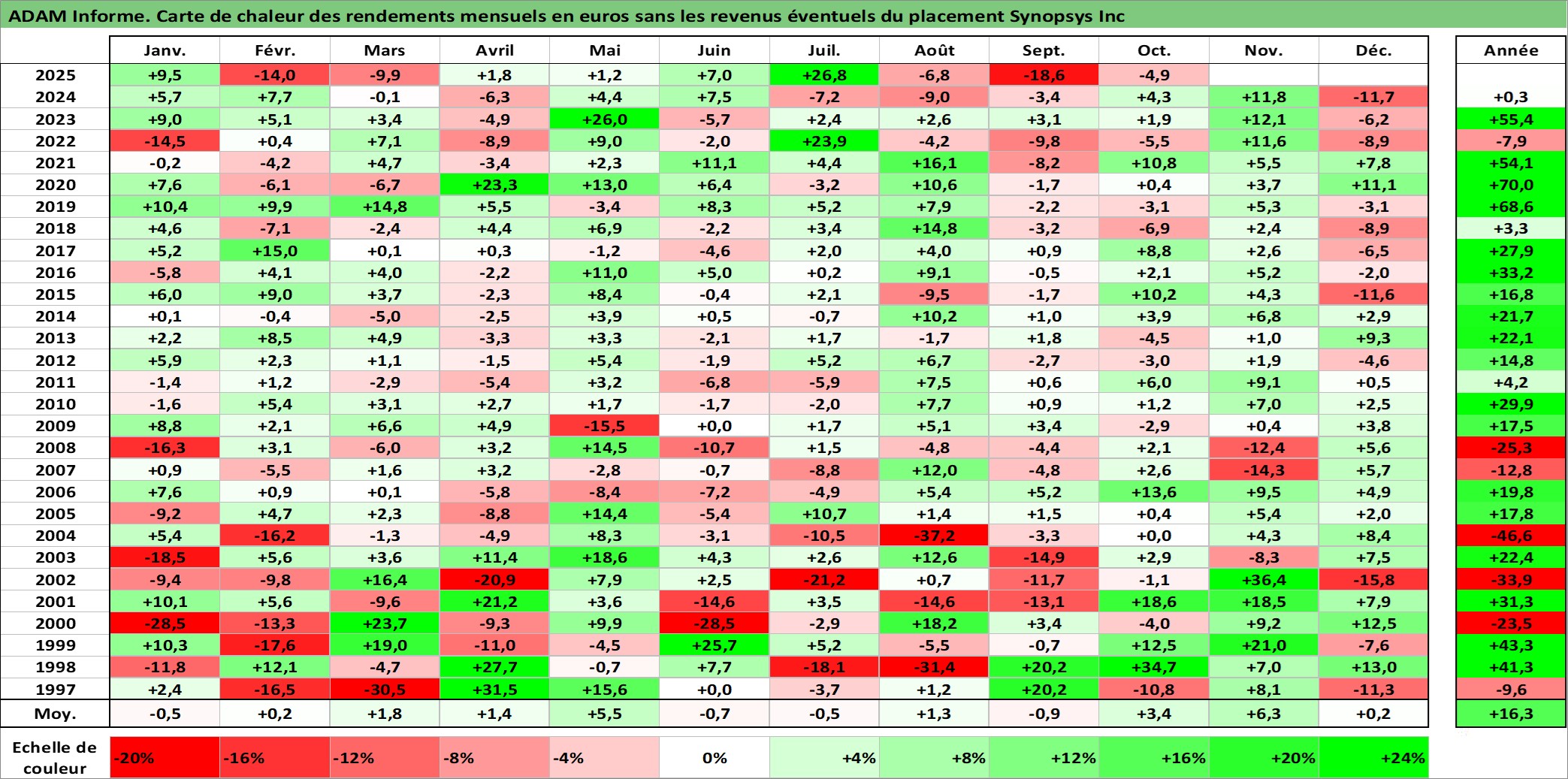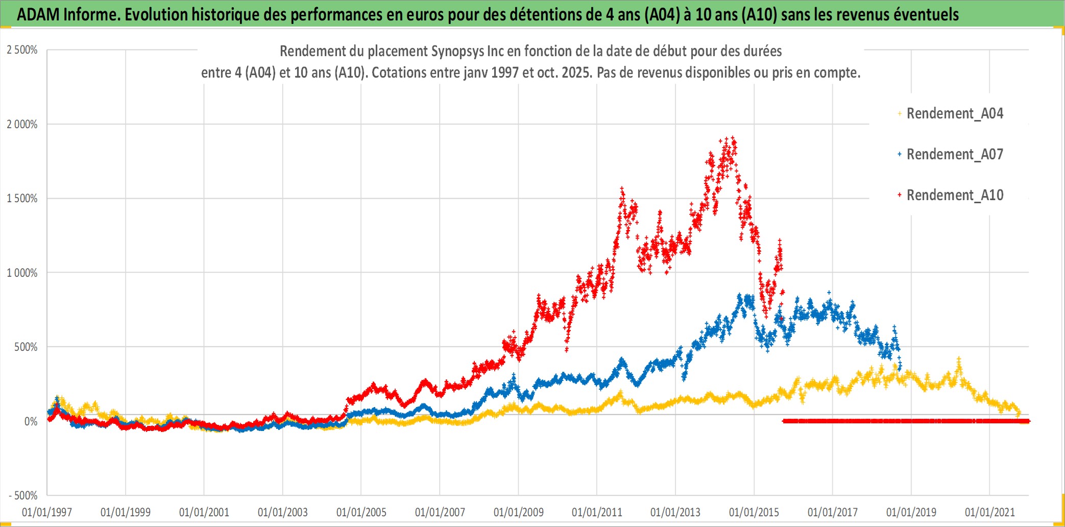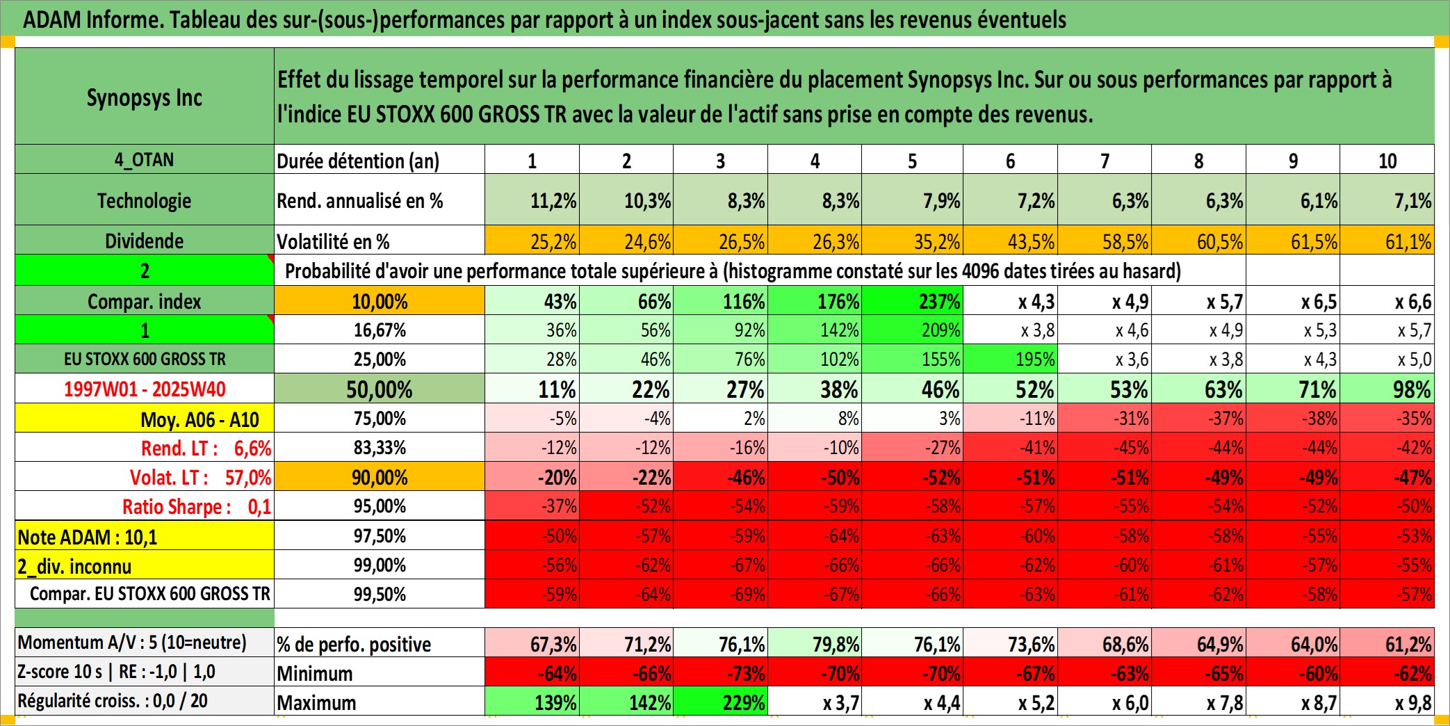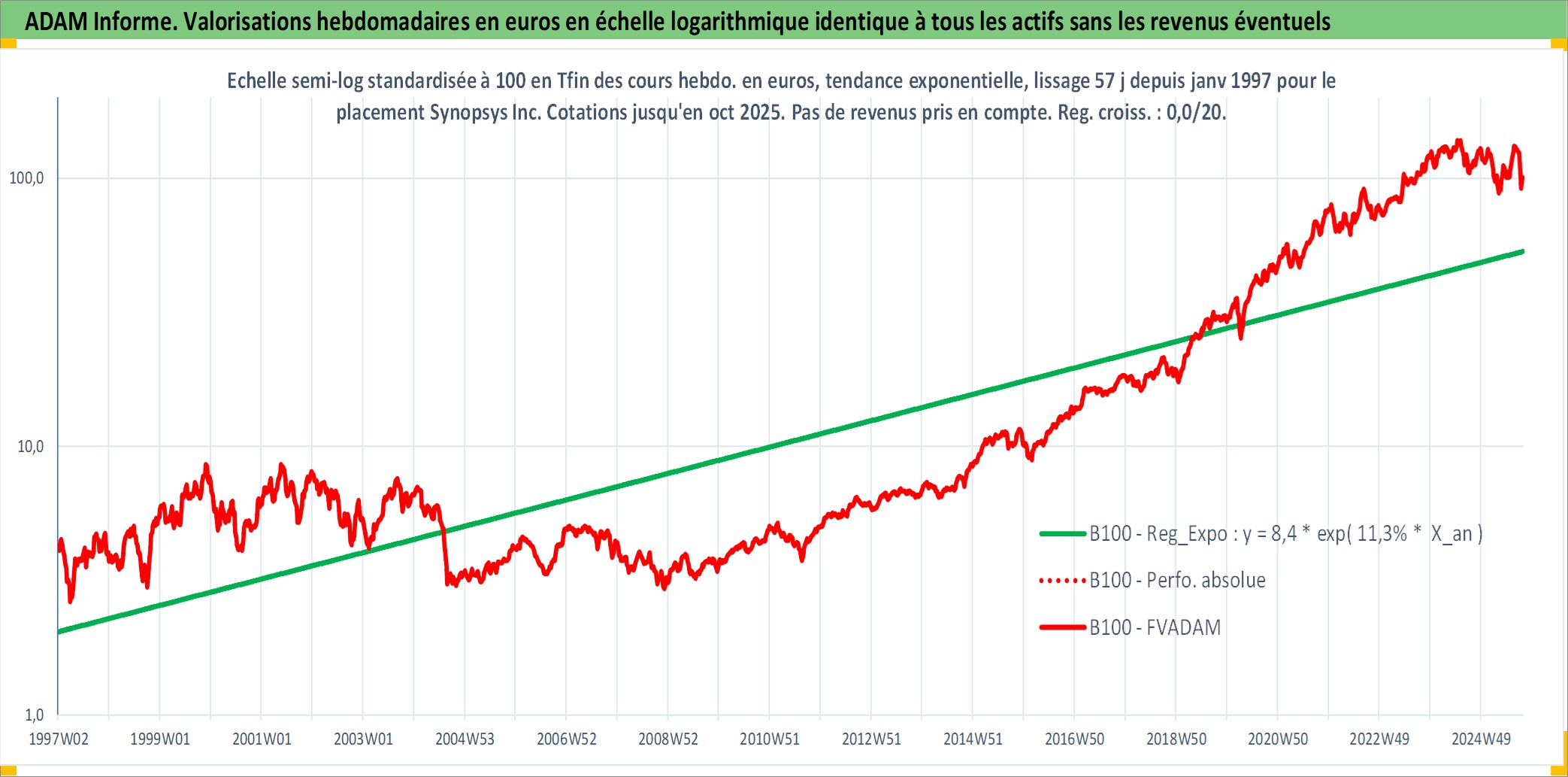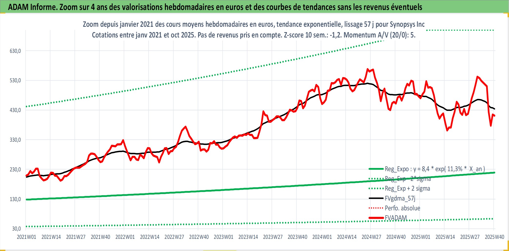 Site dédié aux investisseursPage dédiée sur site financeAnalyse des valorisations hebdomadaires de l'action Synopsys Inc. Cet actif est cote en USD. Les valorisations sont en contrevaleur EURO et couvrent les semaines 1997W01 a 2025W40. Les revenus de cet actif financier ne sont pas connus car non existants ou non disponibles sur le site Yahoo Finance. La note globale ESG de cet actif est estimee a 15.0 (apres rebasage entre 0 et 20).
