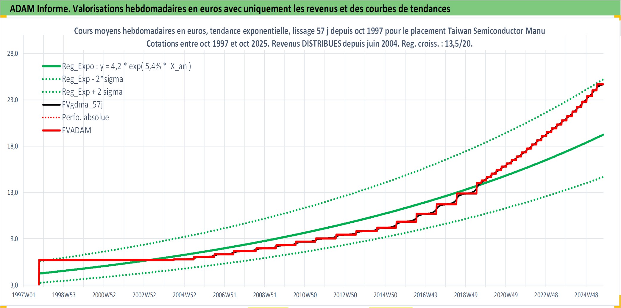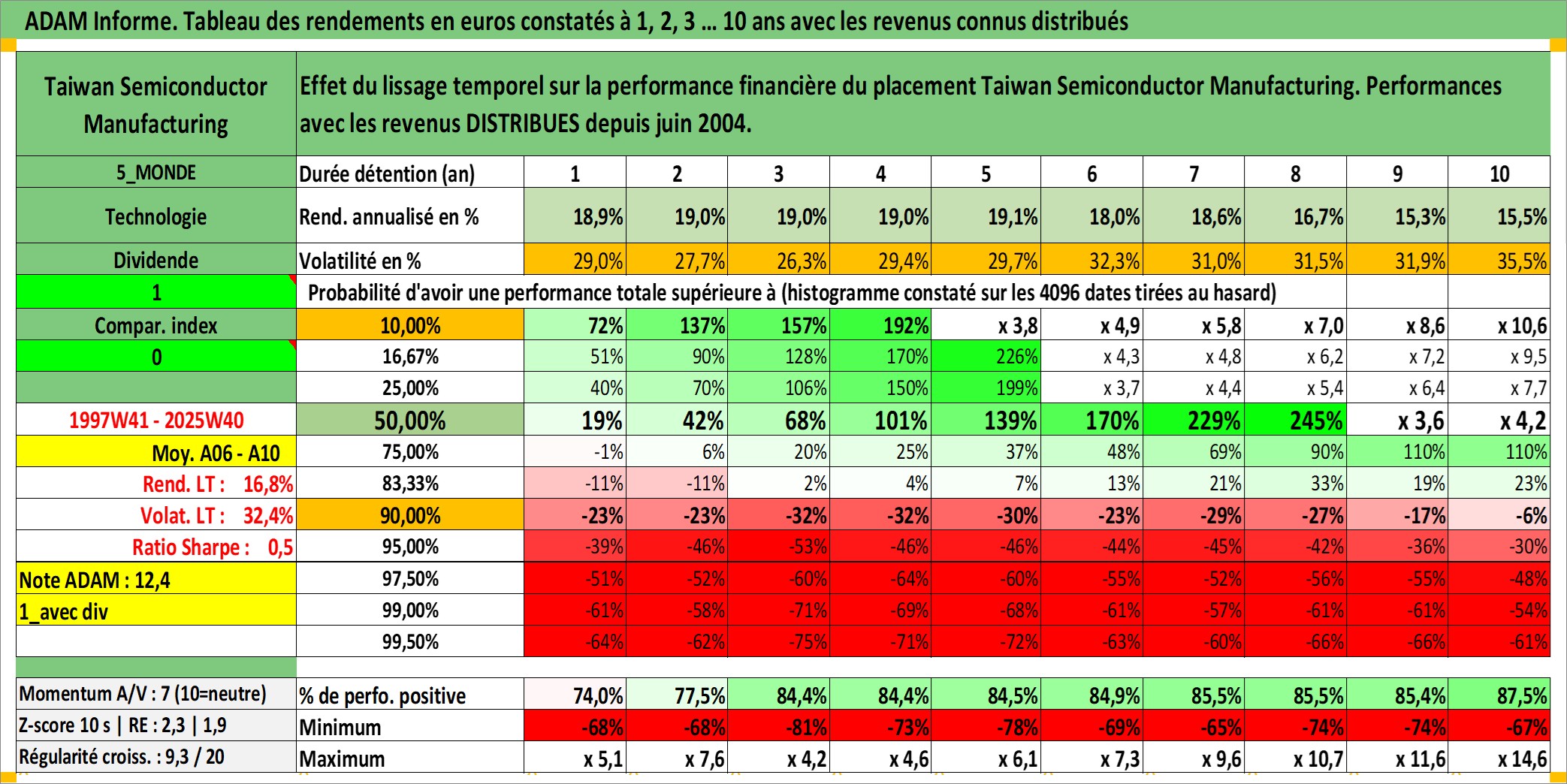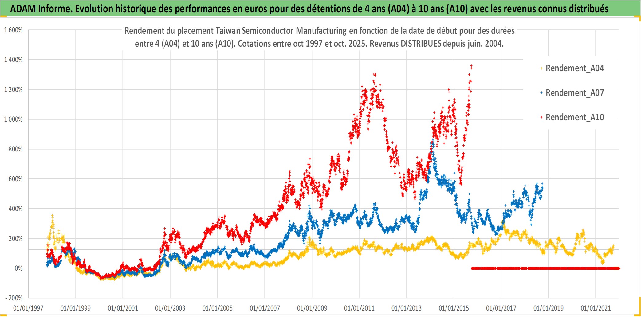 Site dédié aux investisseursPage dédiée sur site financeAnalyse des valorisations hebdomadaires de l'action Taiwan Semiconductor Manufacturing. Cet actif est cote en USD. Les valorisations sont en contrevaleur EURO et couvrent les semaines 1997W41 a 2025W40. Les revenus de cet actif financier sont pris en compte depuis la semaine 2004W25. La note ESG de cet actif n'est pas connue.