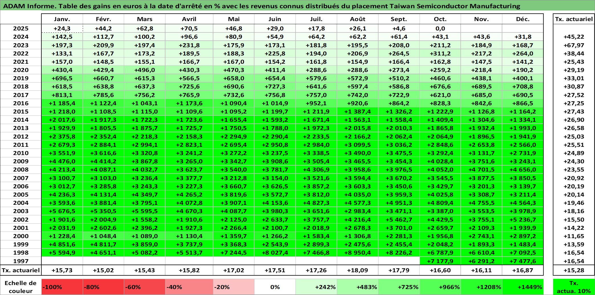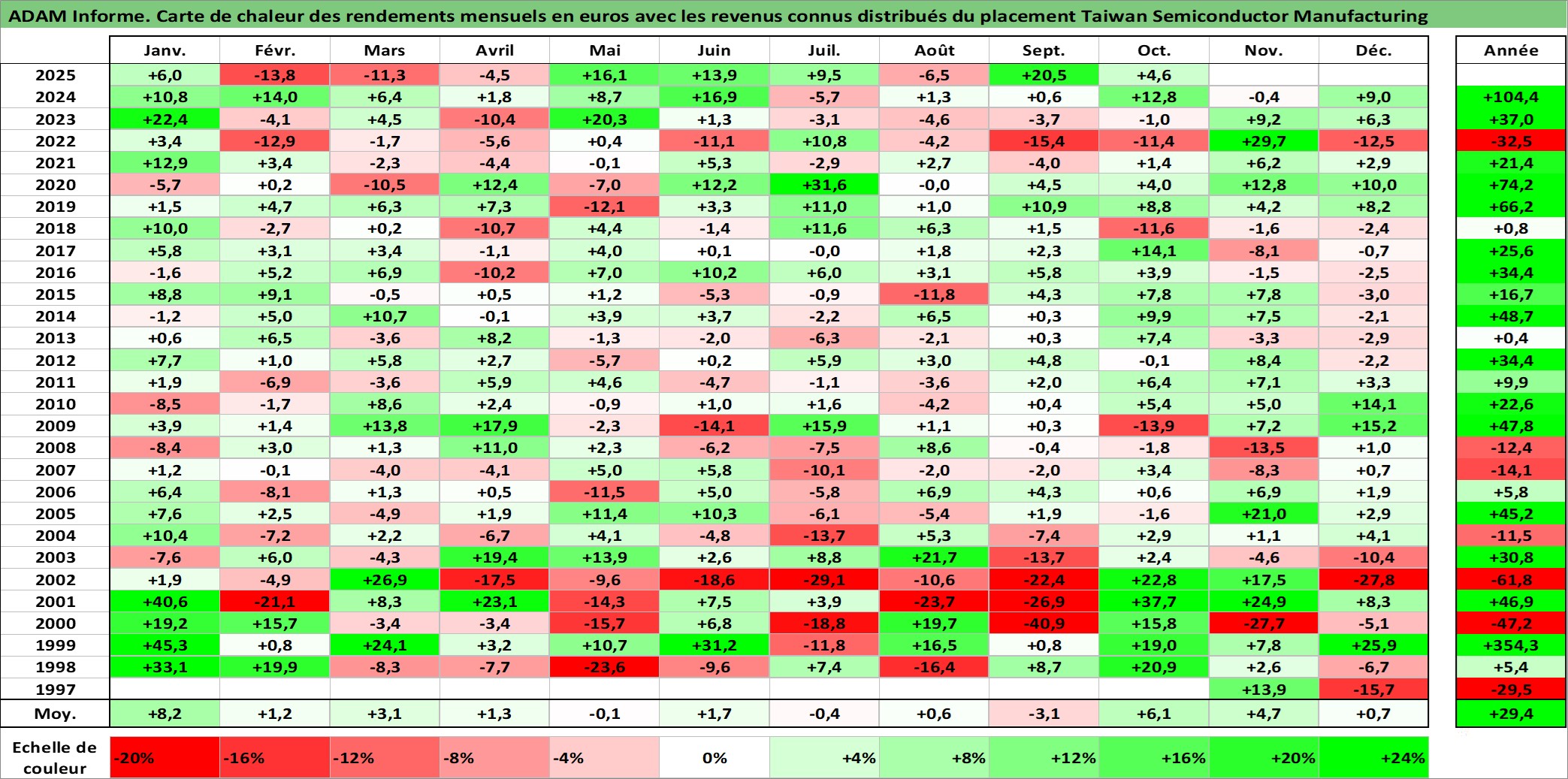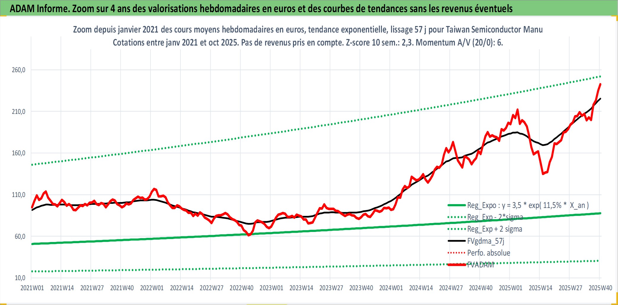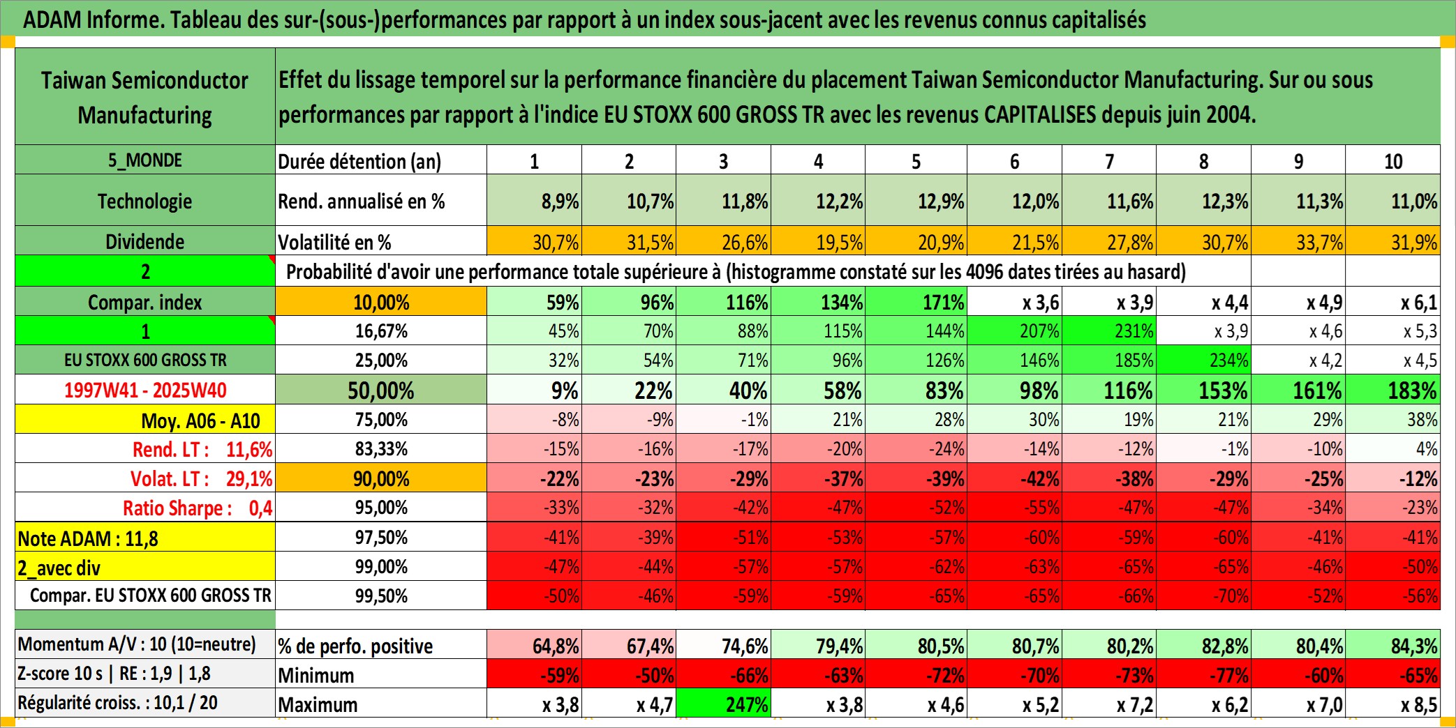 Site dédié aux investisseursPage dédiée sur site financeAnalyse des valorisations hebdomadaires de l'action Taiwan Semiconductor Manufacturing. Cet actif est cote en USD. Les valorisations sont en contrevaleur EURO et couvrent les semaines 1997W41 a 2025W40. Les revenus de cet actif financier sont pris en compte depuis la semaine 2004W25. La note ESG de cet actif n'est pas connue.