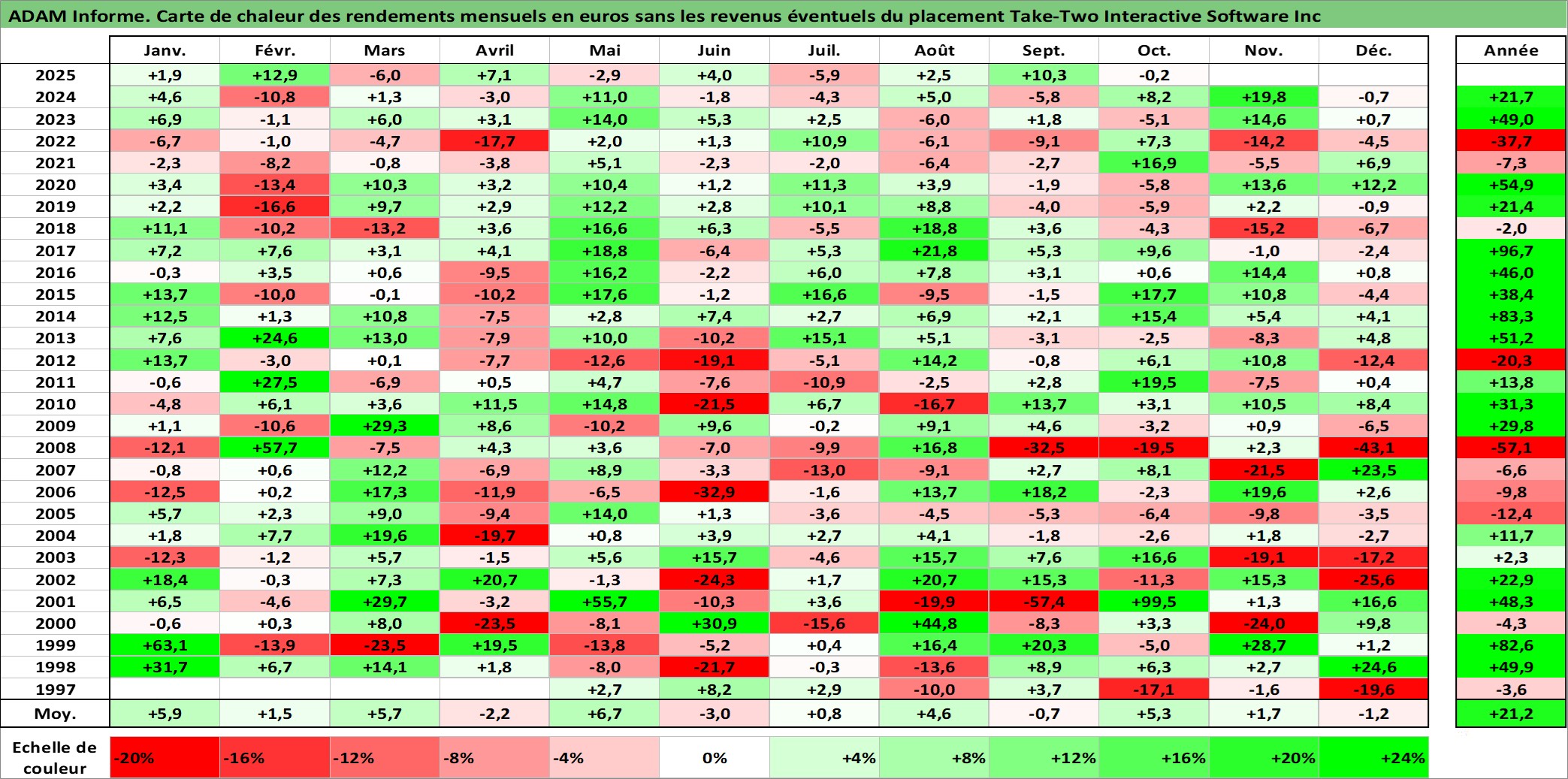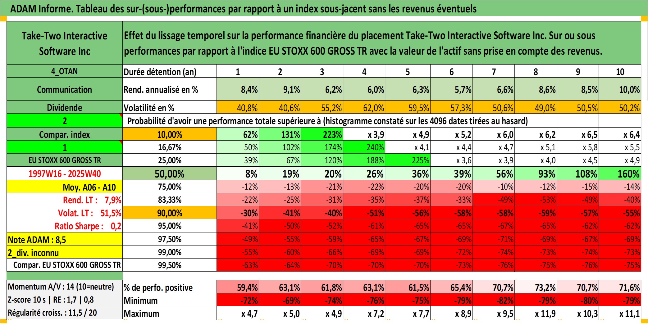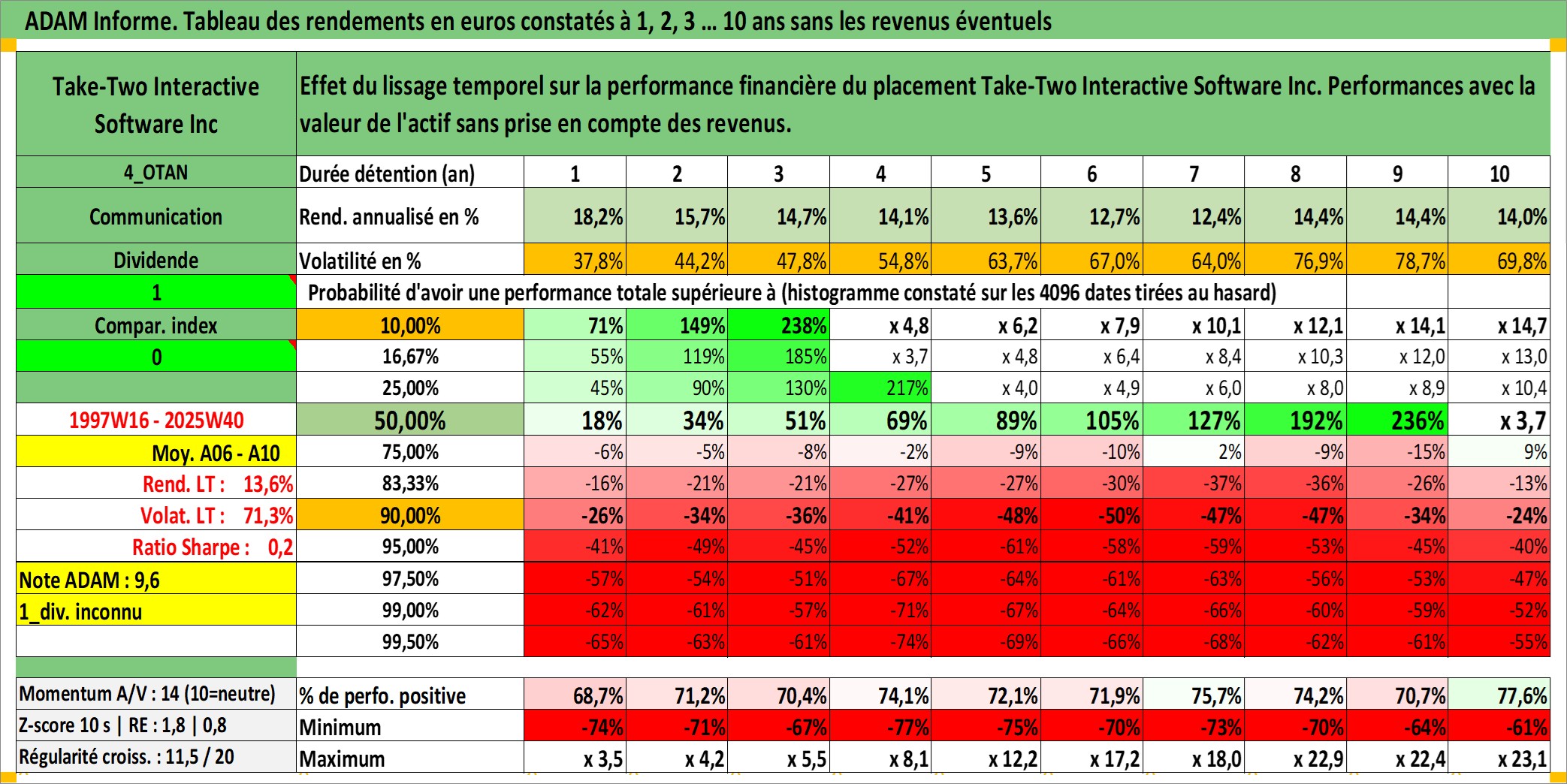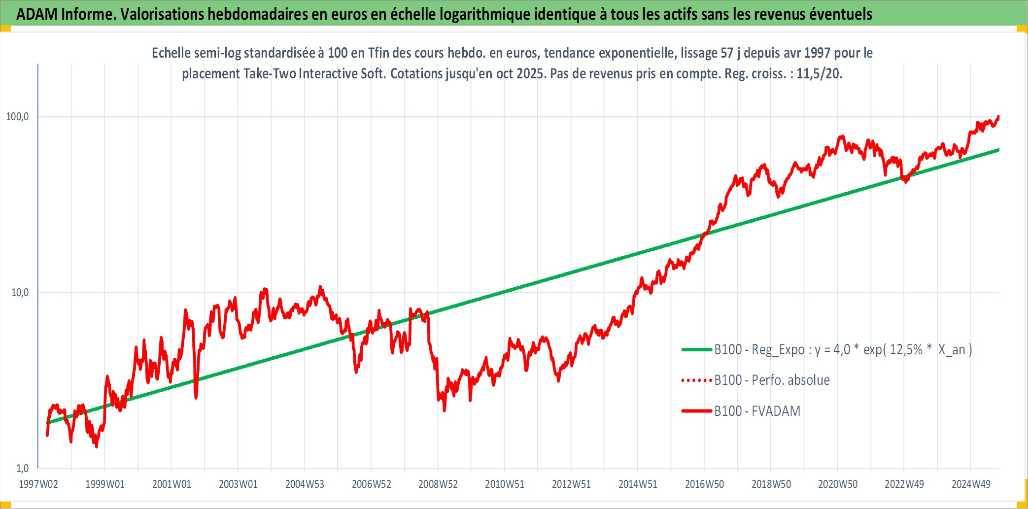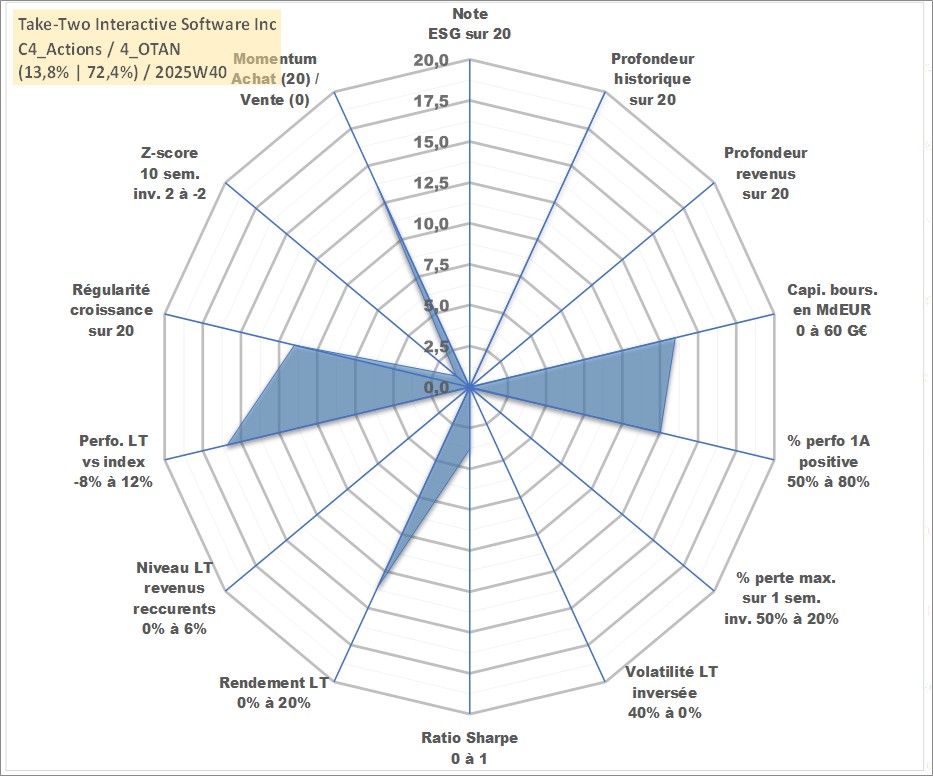 Site dédié aux investisseursPage dédiée sur site financeAnalyse des valorisations hebdomadaires de l'action Take-Two Interactive Software Inc. Cet actif est cote en USD. Les valorisations sont en contrevaleur EURO et couvrent les semaines 1997W16 a 2025W40. Les revenus de cet actif financier ne sont pas connus car non existants ou non disponibles sur le site Yahoo Finance. La note ESG de cet actif n'est pas connue.