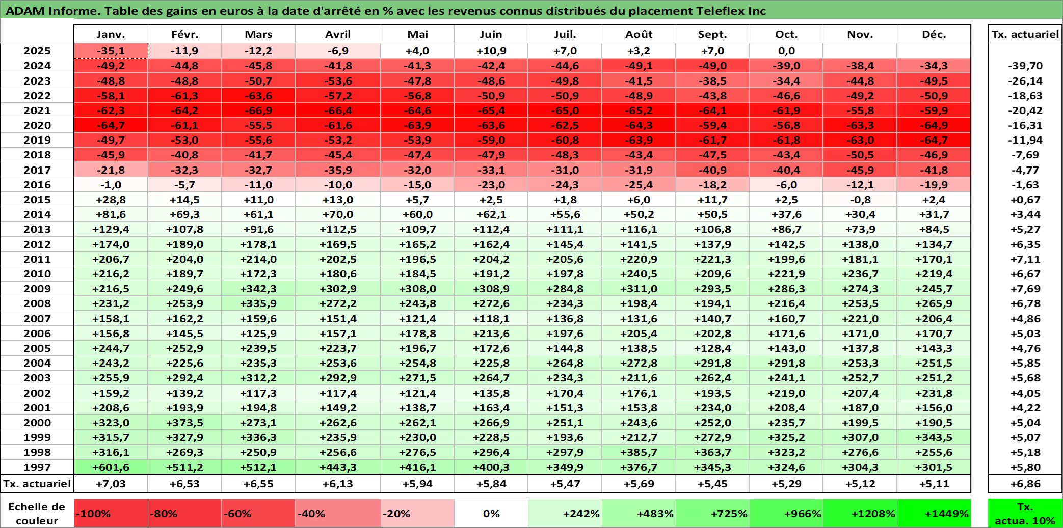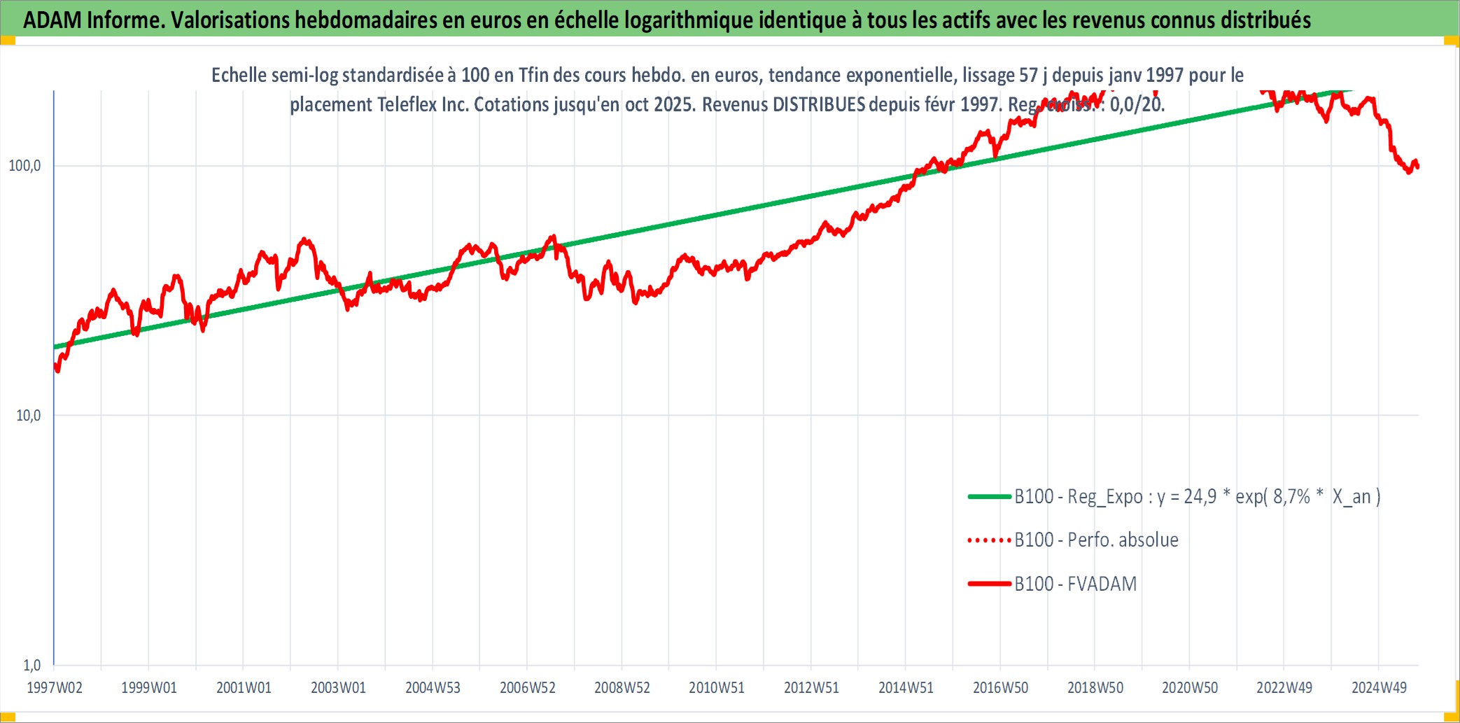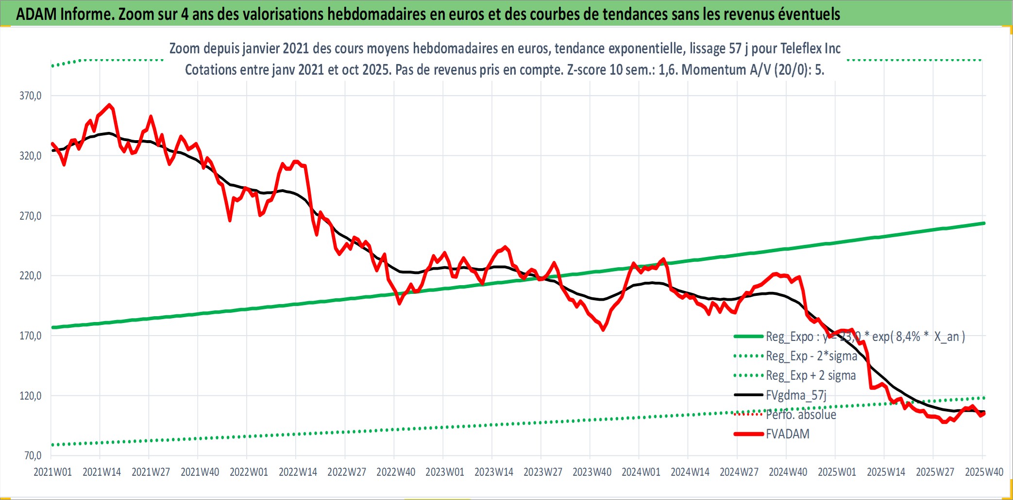 Site dédié aux investisseursPage dédiée sur site financeAnalyse des valorisations hebdomadaires de l'action Teleflex Inc. Cet actif est cote en USD. Les valorisations sont en contrevaleur EURO et couvrent les semaines 1997W01 a 2025W40. Les revenus de cet actif financier sont pris en compte depuis la semaine 1997W08. La note globale ESG de cet actif est estimee a 5.0 (apres rebasage entre 0 et 20).