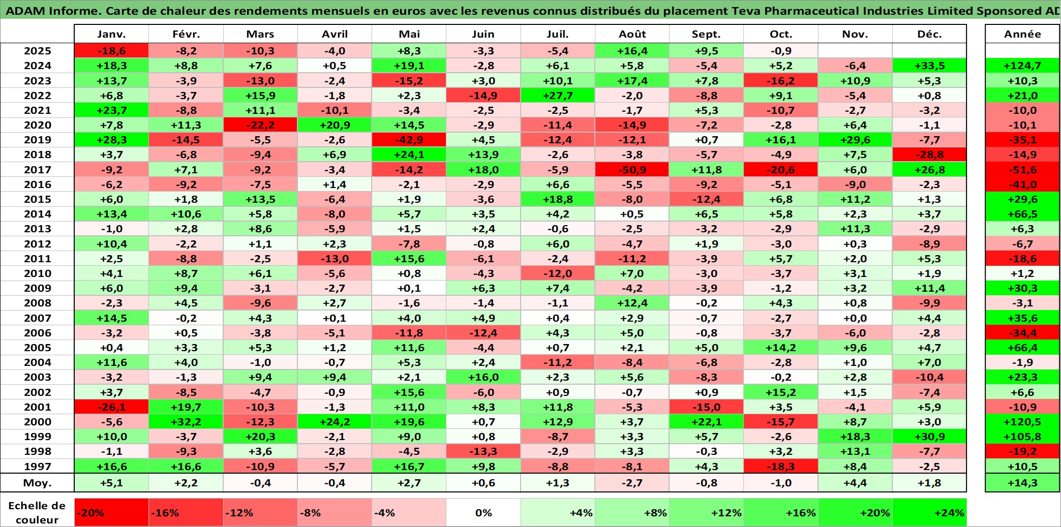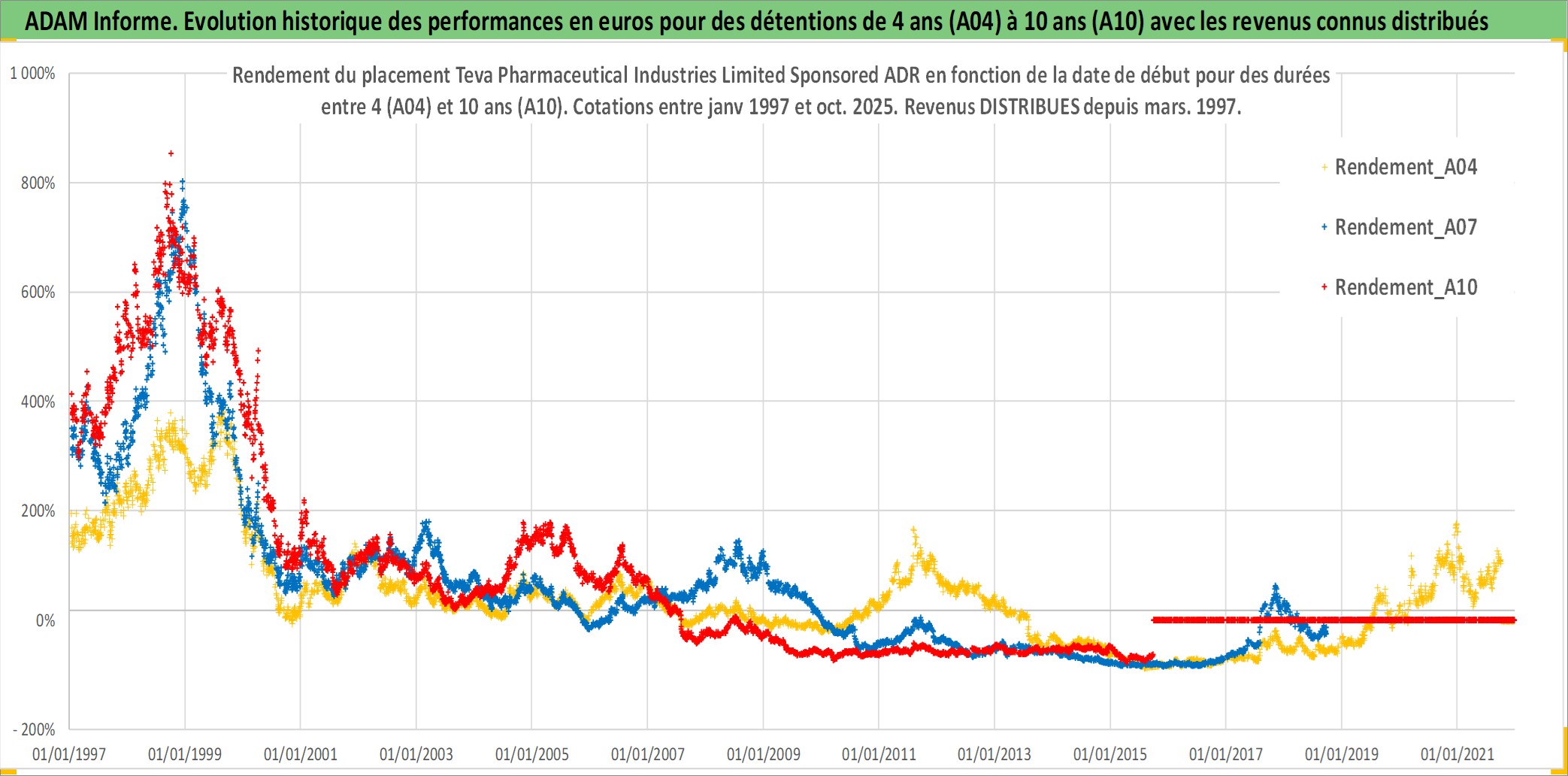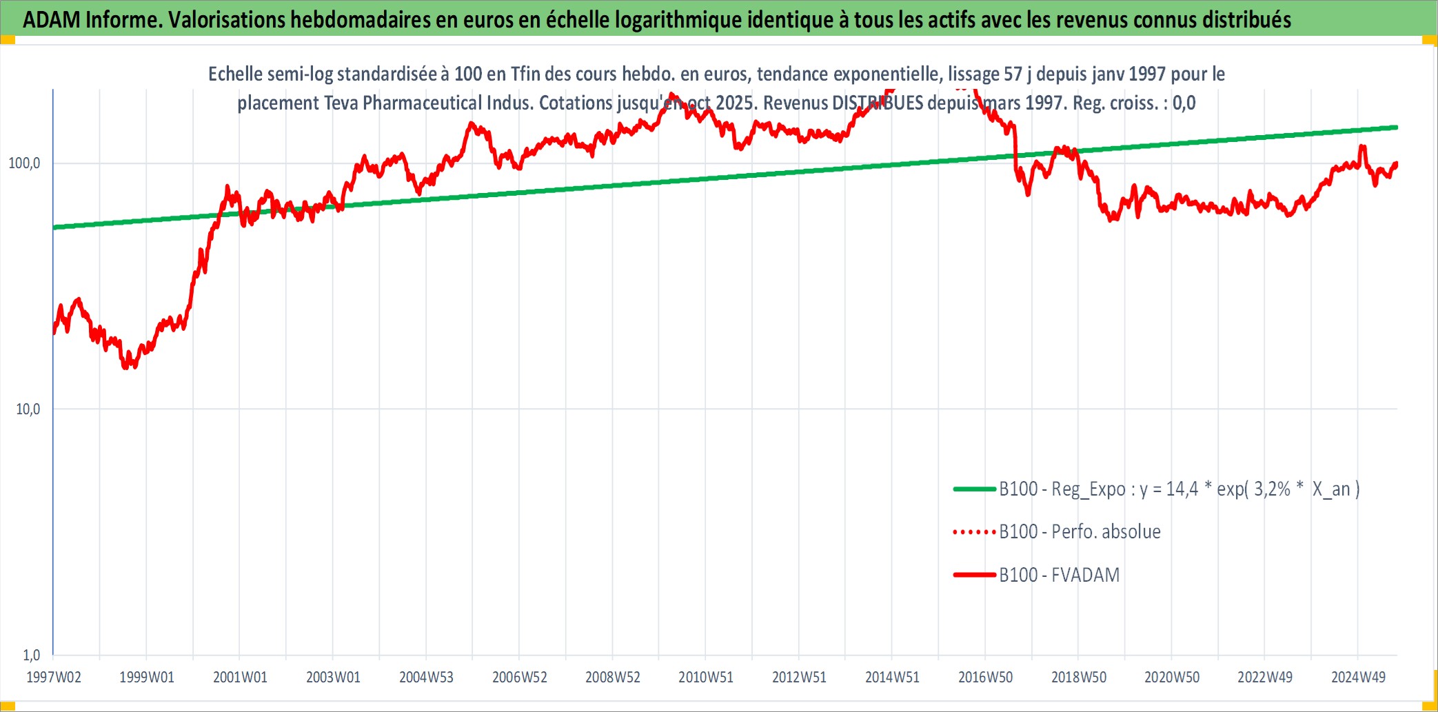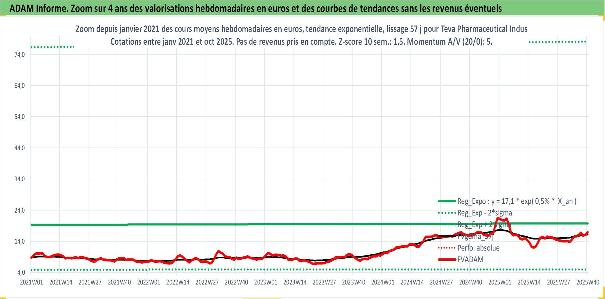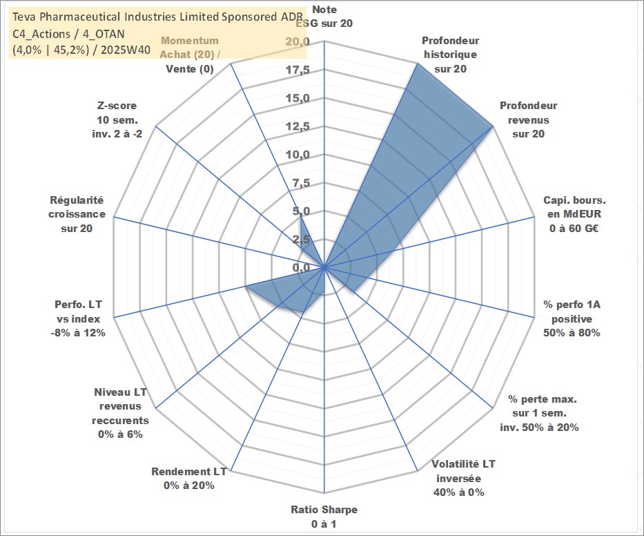 Site dédié aux investisseursPage dédiée sur site financeAnalyse des valorisations hebdomadaires de l'action Teva Pharmaceutical Industries Limited Sponsored ADR. Cet actif est cote en USD. Les valorisations sont en contrevaleur EURO et couvrent les semaines 1997W01 a 2025W40. Les revenus de cet actif financier sont pris en compte depuis la semaine 1997W10. La note ESG de cet actif n'est pas connue.