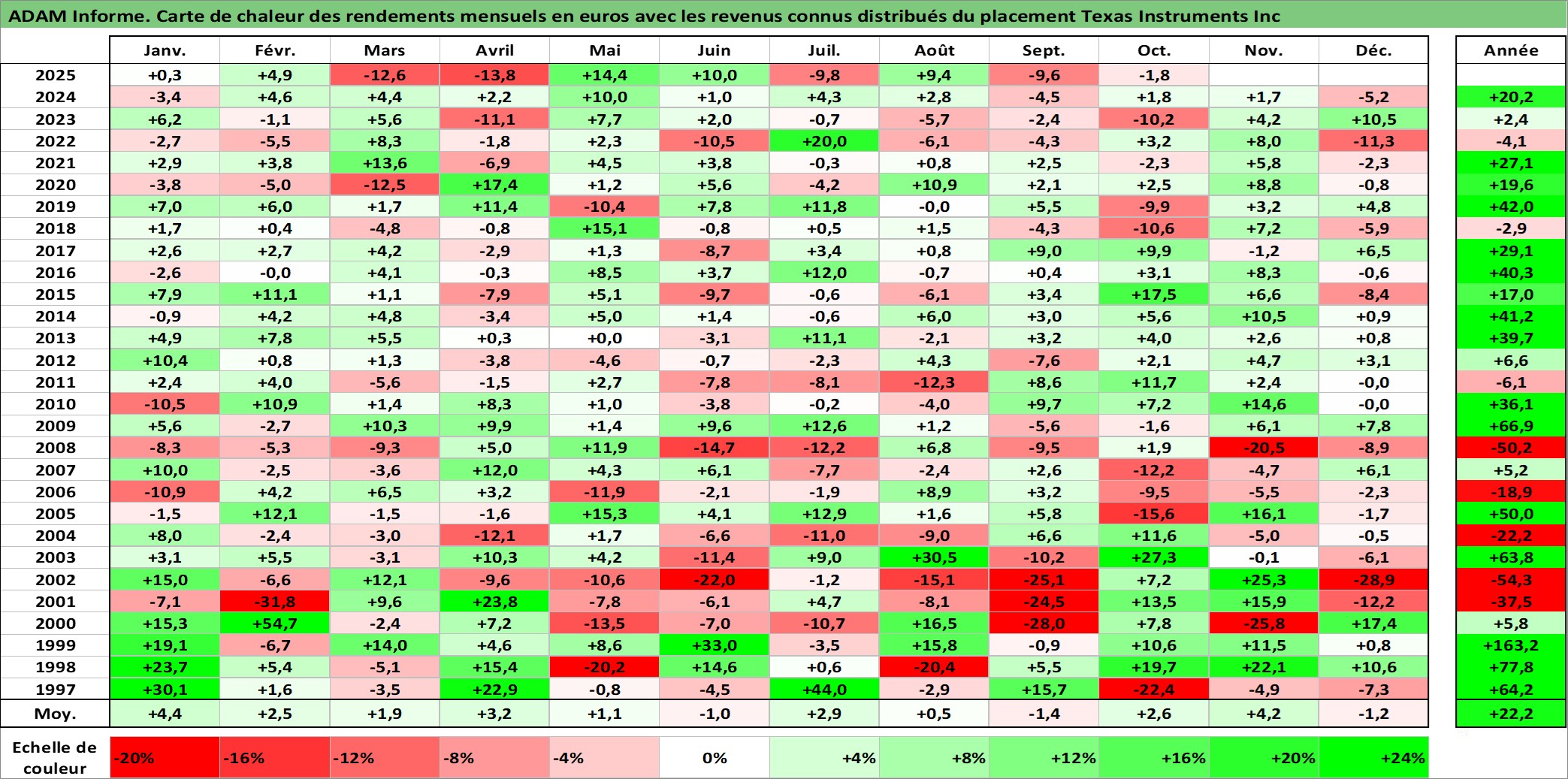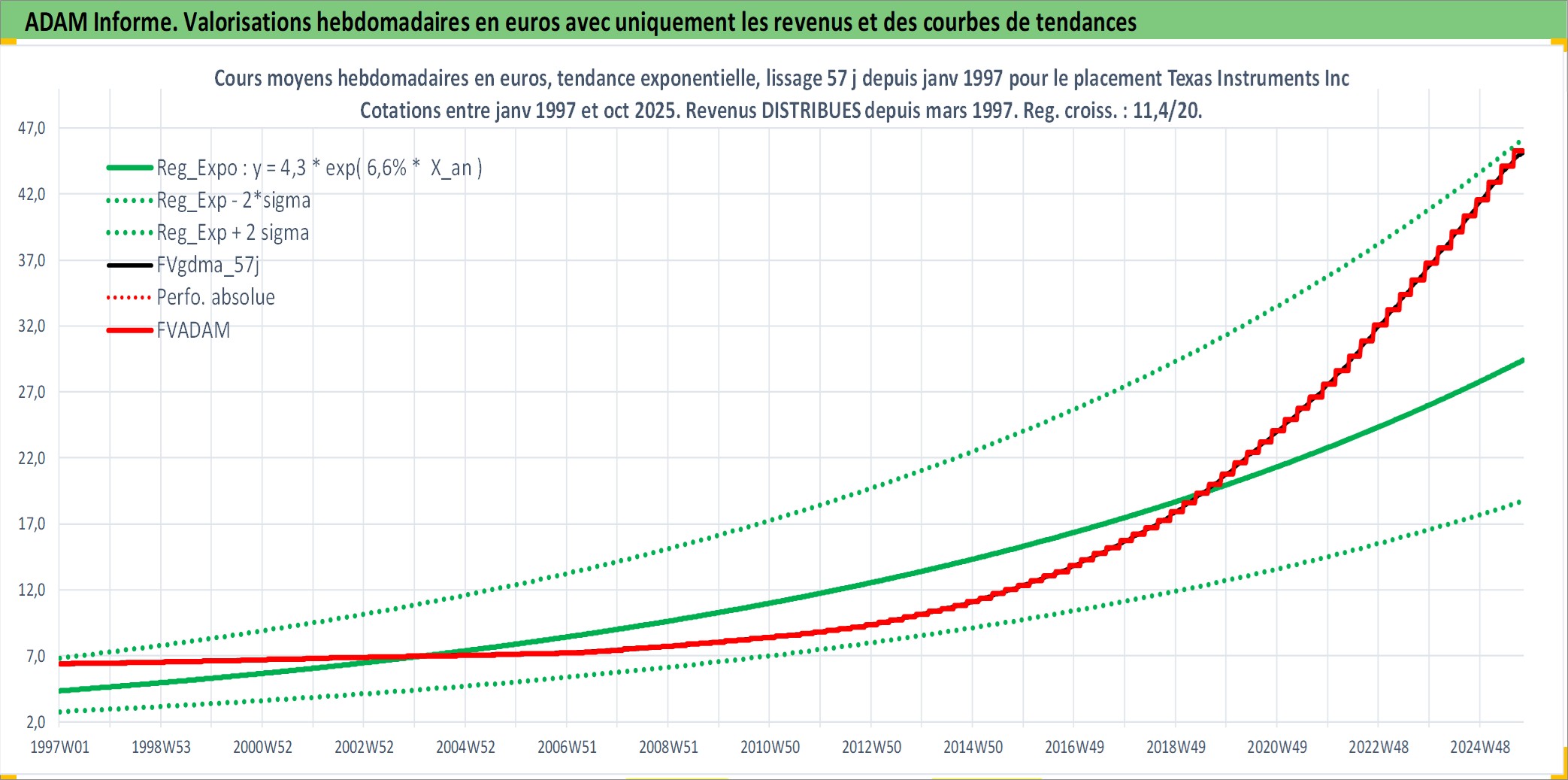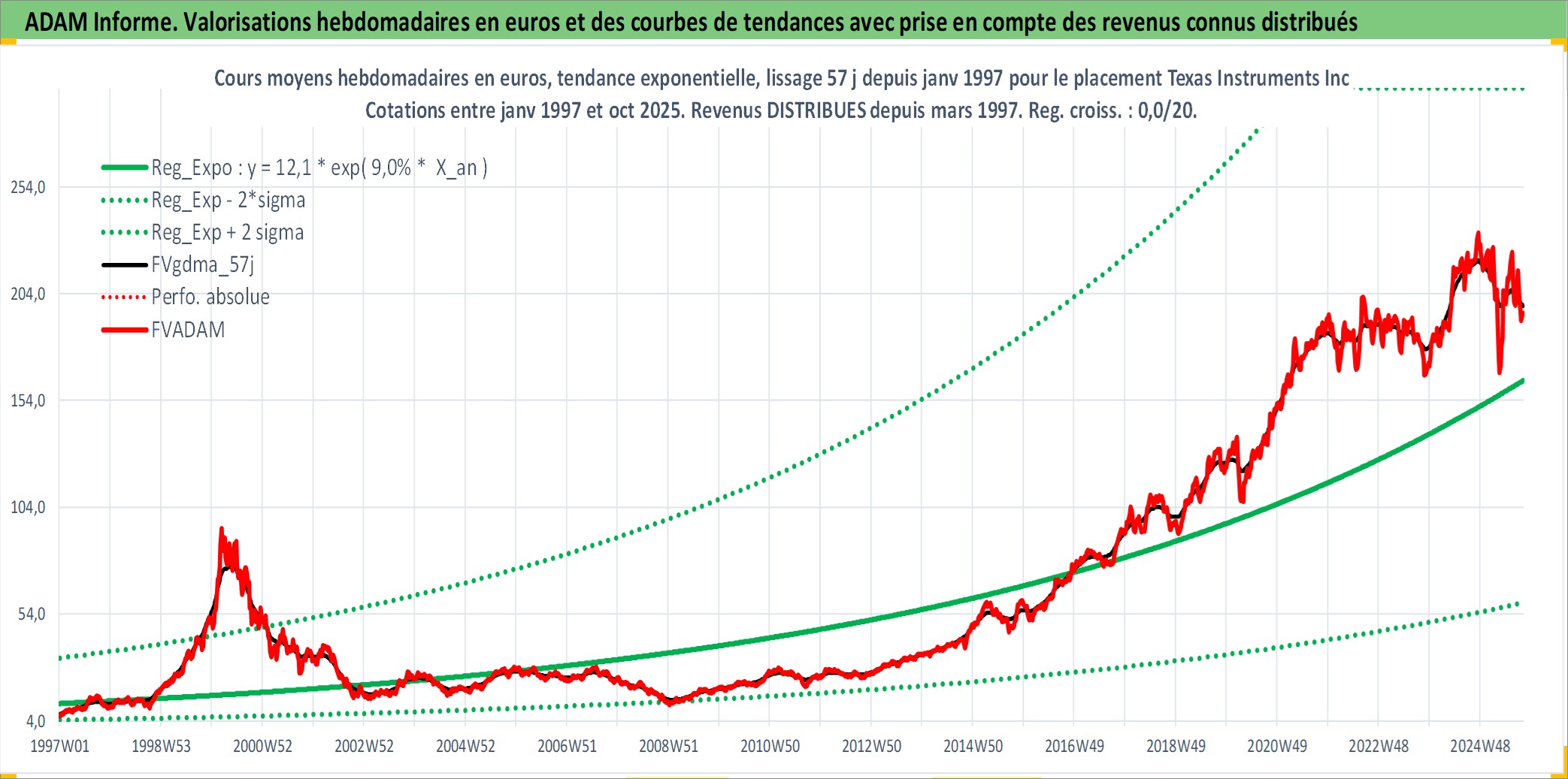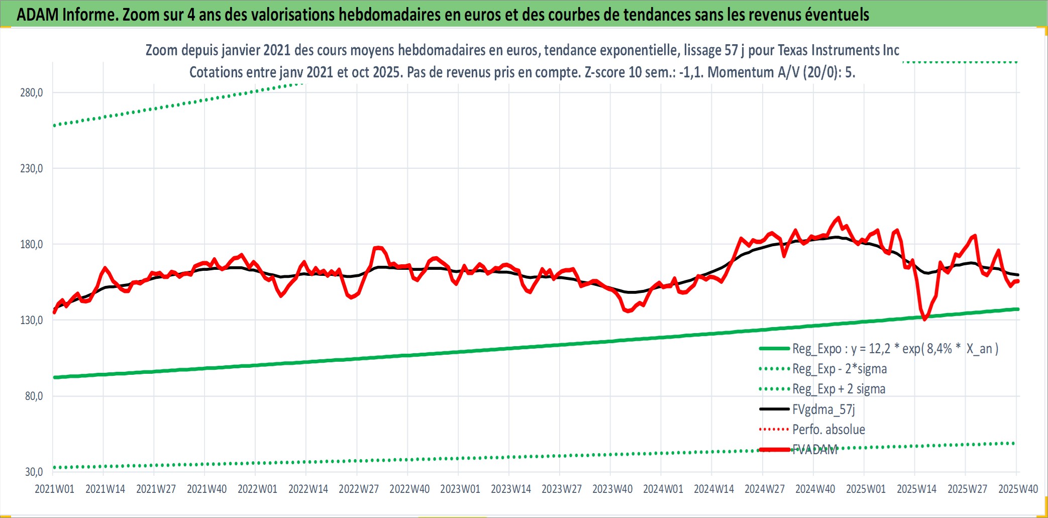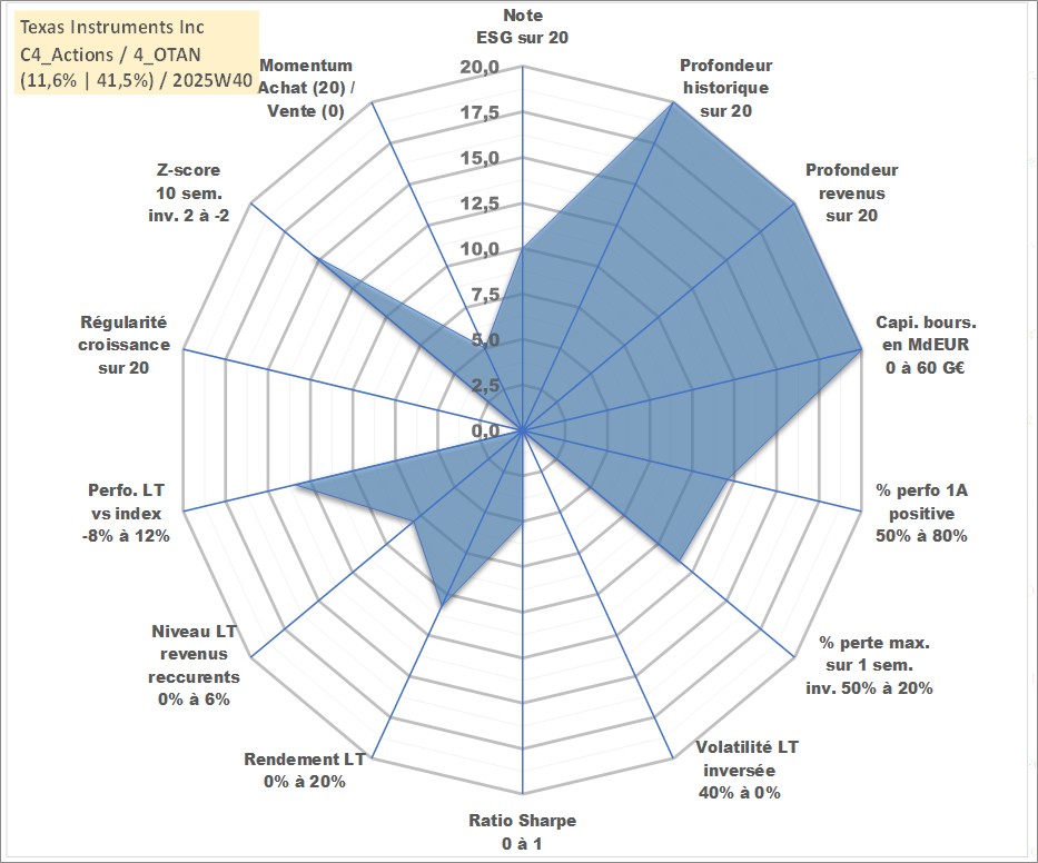 Site dédié aux investisseursPage dédiée sur site financeAnalyse des valorisations hebdomadaires de l'action Texas Instruments Inc. Cet actif est cote en USD. Les valorisations sont en contrevaleur EURO et couvrent les semaines 1997W01 a 2025W40. Les revenus de cet actif financier sont pris en compte depuis la semaine 1997W13. La note globale ESG de cet actif est estimee a 10.0 (apres rebasage entre 0 et 20).