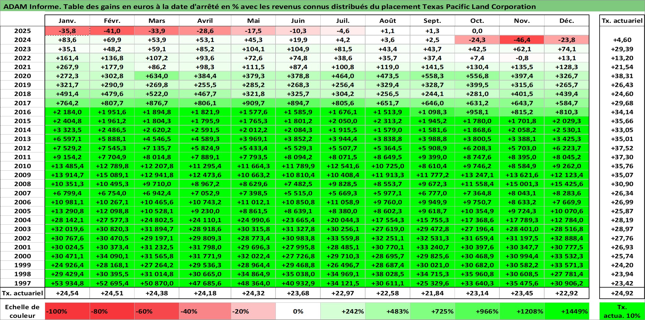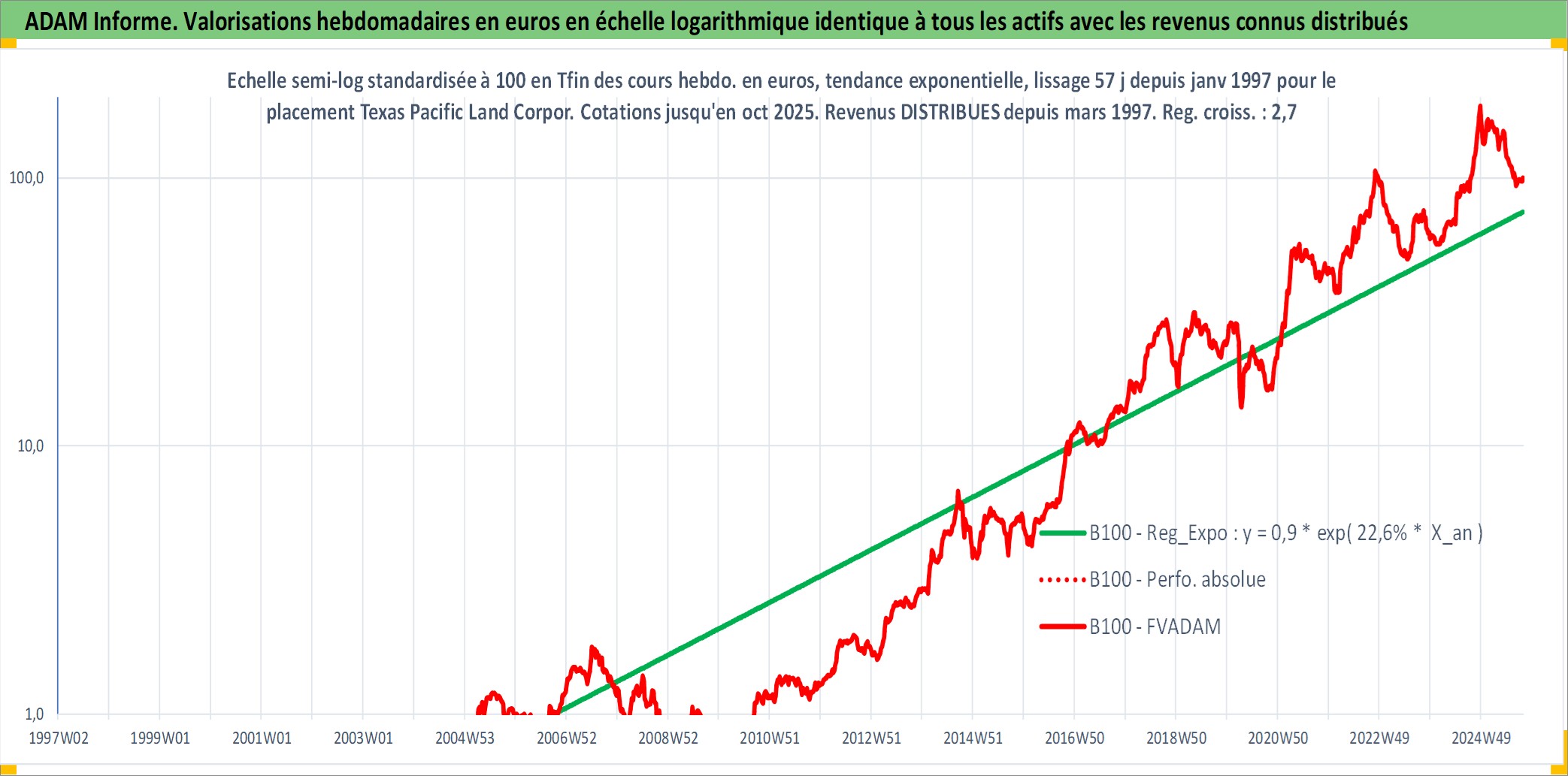 Site dédié aux investisseursPage dédiée sur site financeAnalyse des valorisations hebdomadaires de l'action Texas Pacific Land Corporation. Cet actif est cote en USD. Les valorisations sont en contrevaleur EURO et couvrent les semaines 1997W01 a 2025W40. Les revenus de cet actif financier sont pris en compte depuis la semaine 1997W10. La note ESG de cet actif n'est pas connue.