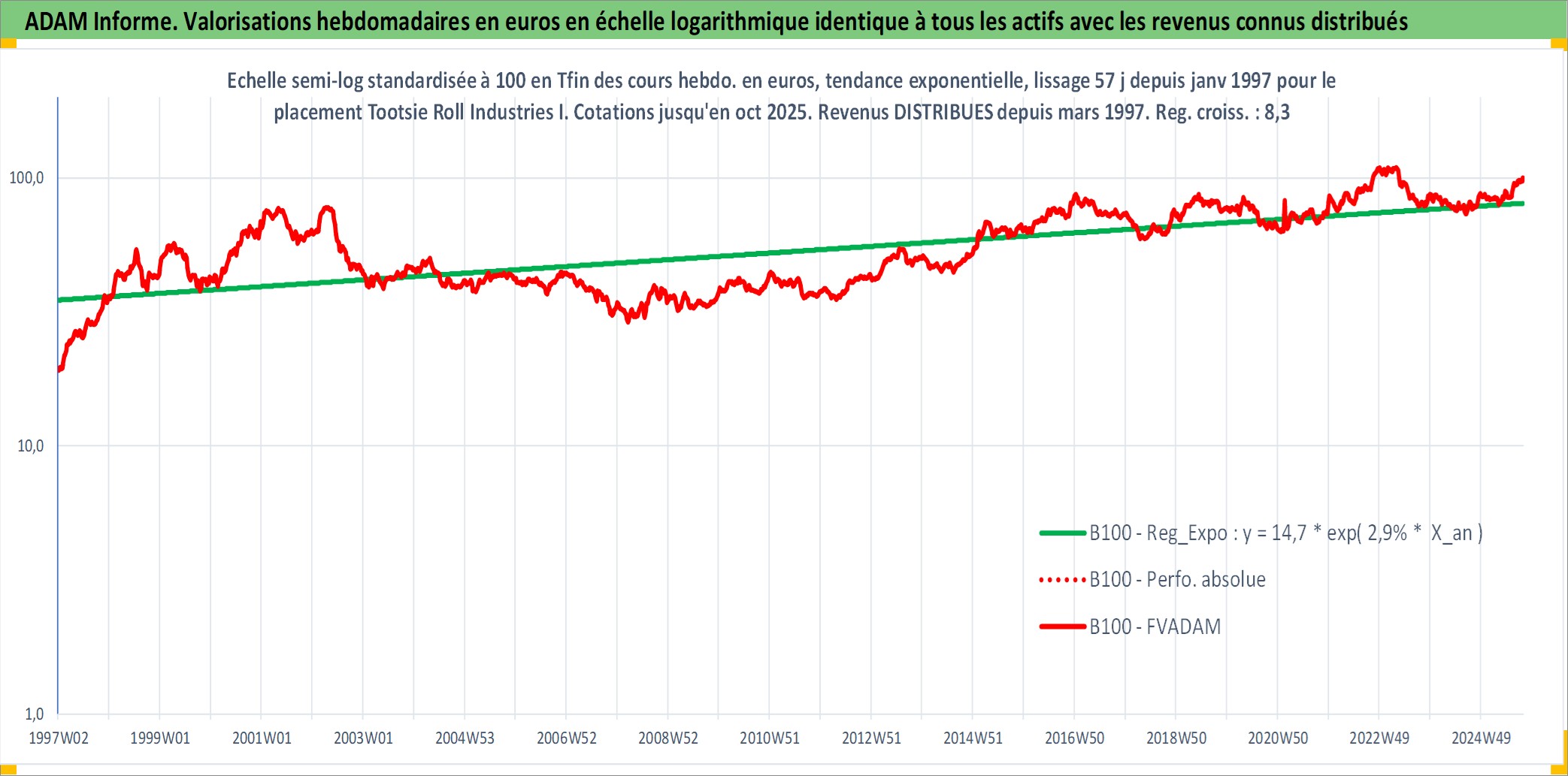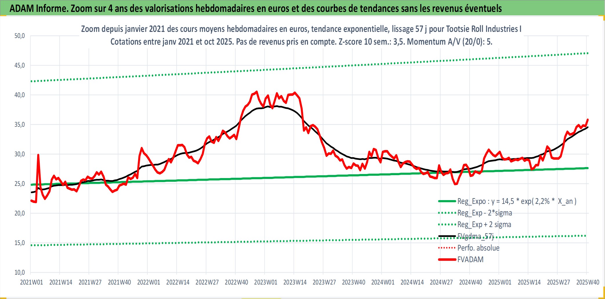 Site dédié aux investisseursPage dédiée sur site financeAnalyse des valorisations hebdomadaires de l'action Tootsie Roll Industries Inc. Cet actif est cote en USD. Les valorisations sont en contrevaleur EURO et couvrent les semaines 1997W01 a 2025W40. Les revenus de cet actif financier sont pris en compte depuis la semaine 1997W10. La note ESG de cet actif n'est pas connue.