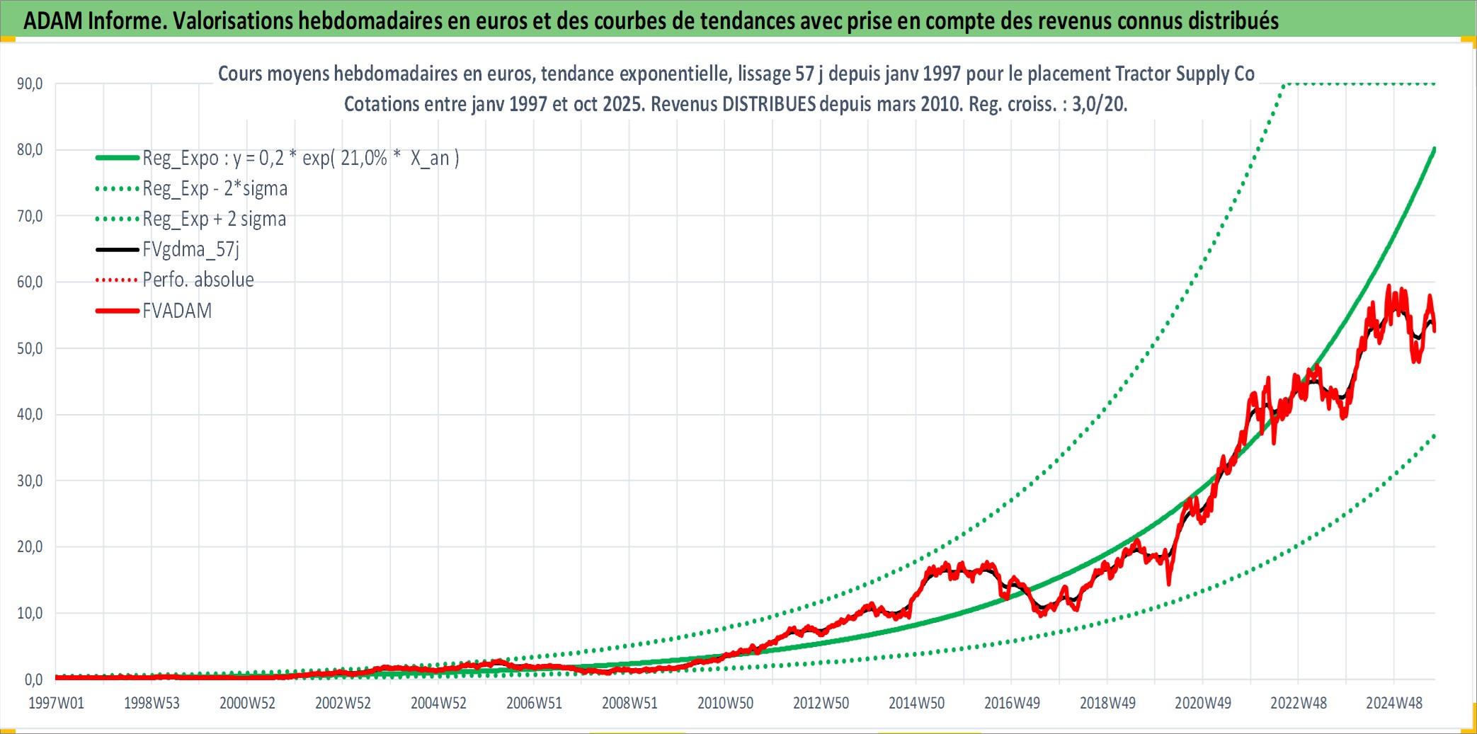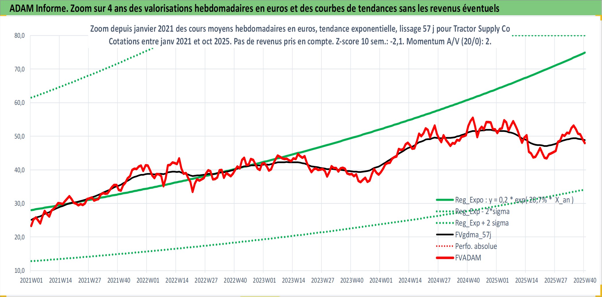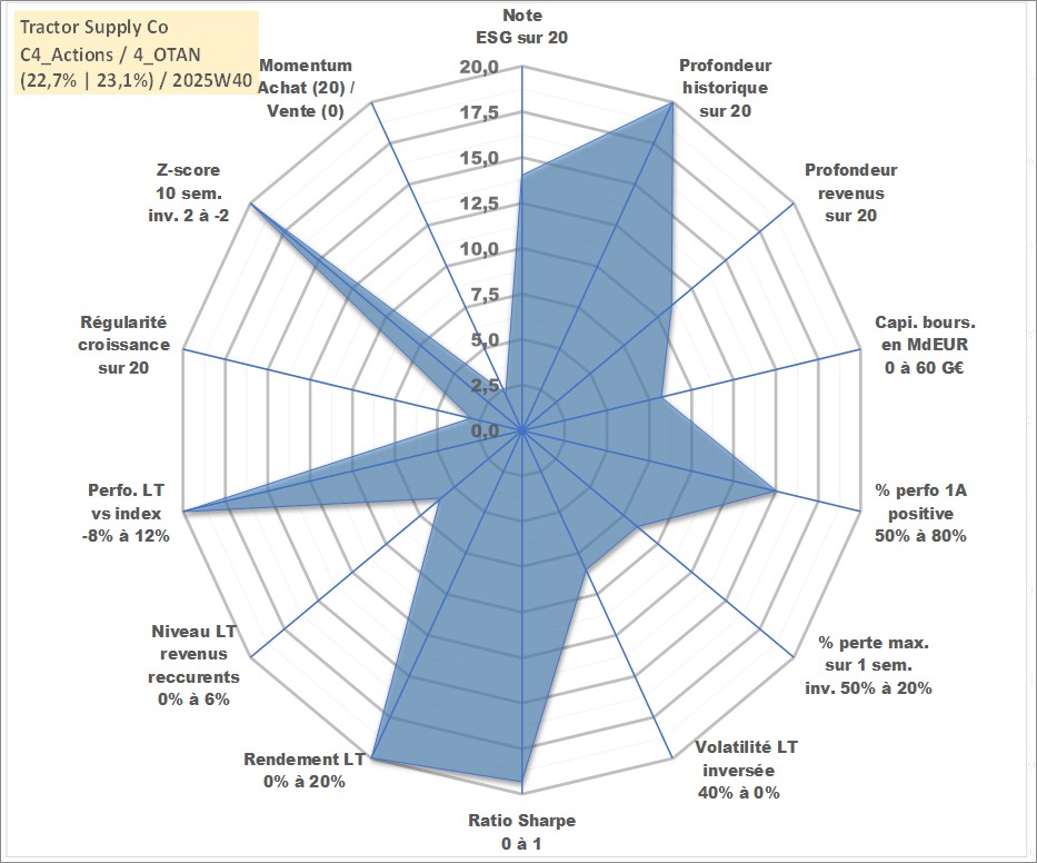 Site dédié aux investisseursPage dédiée sur site financeAnalyse des valorisations hebdomadaires de l'action Tractor Supply Co. Cet actif est cote en USD. Les valorisations sont en contrevaleur EURO et couvrent les semaines 1997W01 a 2025W40. Les revenus de cet actif financier sont pris en compte depuis la semaine 2010W10. La note globale ESG de cet actif est estimee a 14.0 (apres rebasage entre 0 et 20).