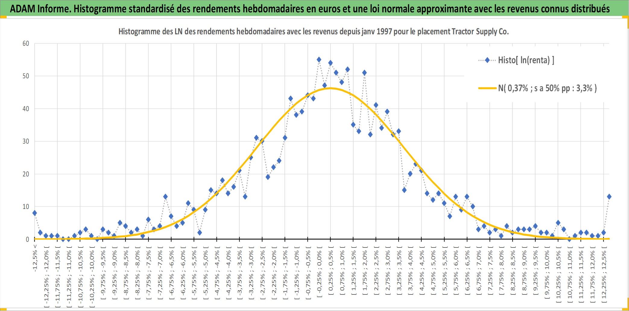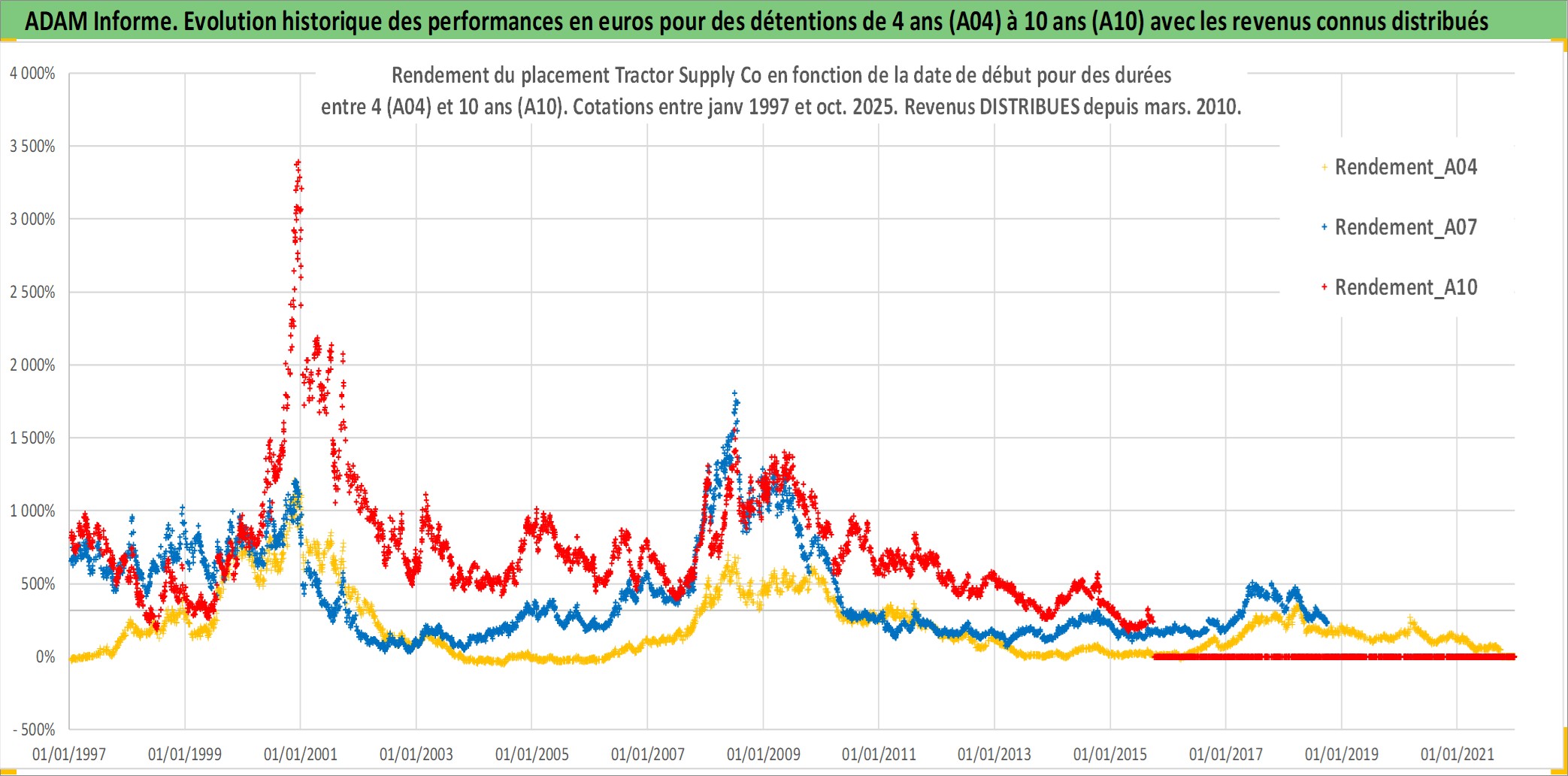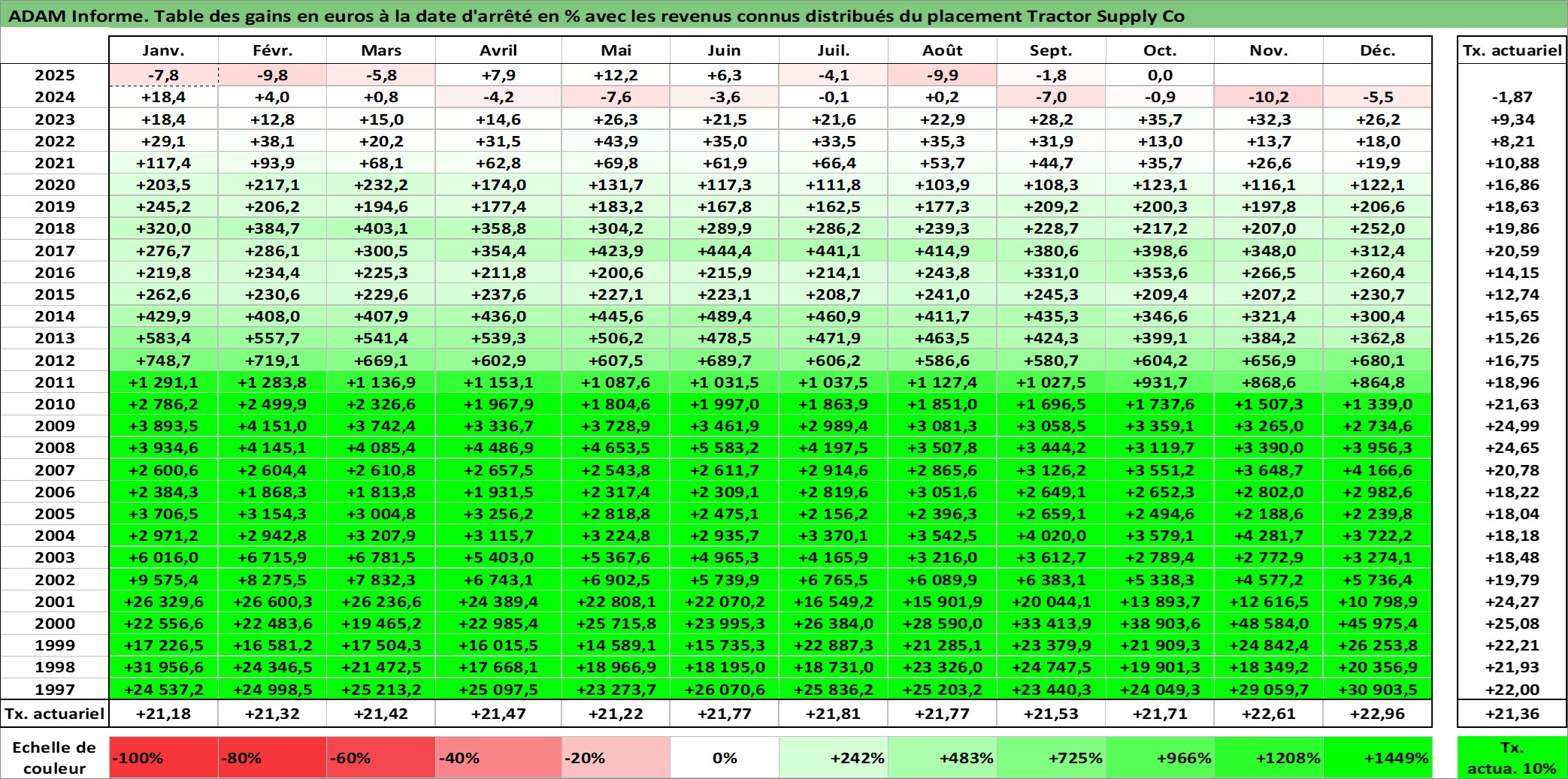 Site dédié aux investisseursPage dédiée sur site financeAnalyse des valorisations hebdomadaires de l'action Tractor Supply Co. Cet actif est cote en USD. Les valorisations sont en contrevaleur EURO et couvrent les semaines 1997W01 a 2025W40. Les revenus de cet actif financier sont pris en compte depuis la semaine 2010W10. La note globale ESG de cet actif est estimee a 14.0 (apres rebasage entre 0 et 20).