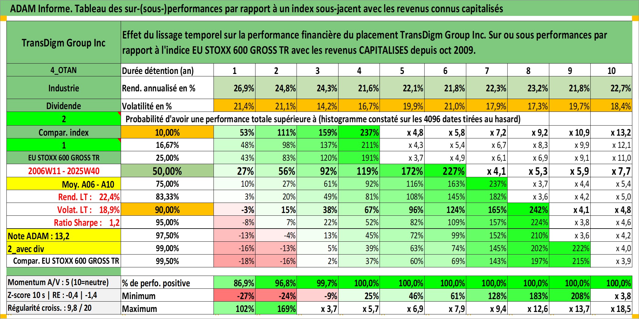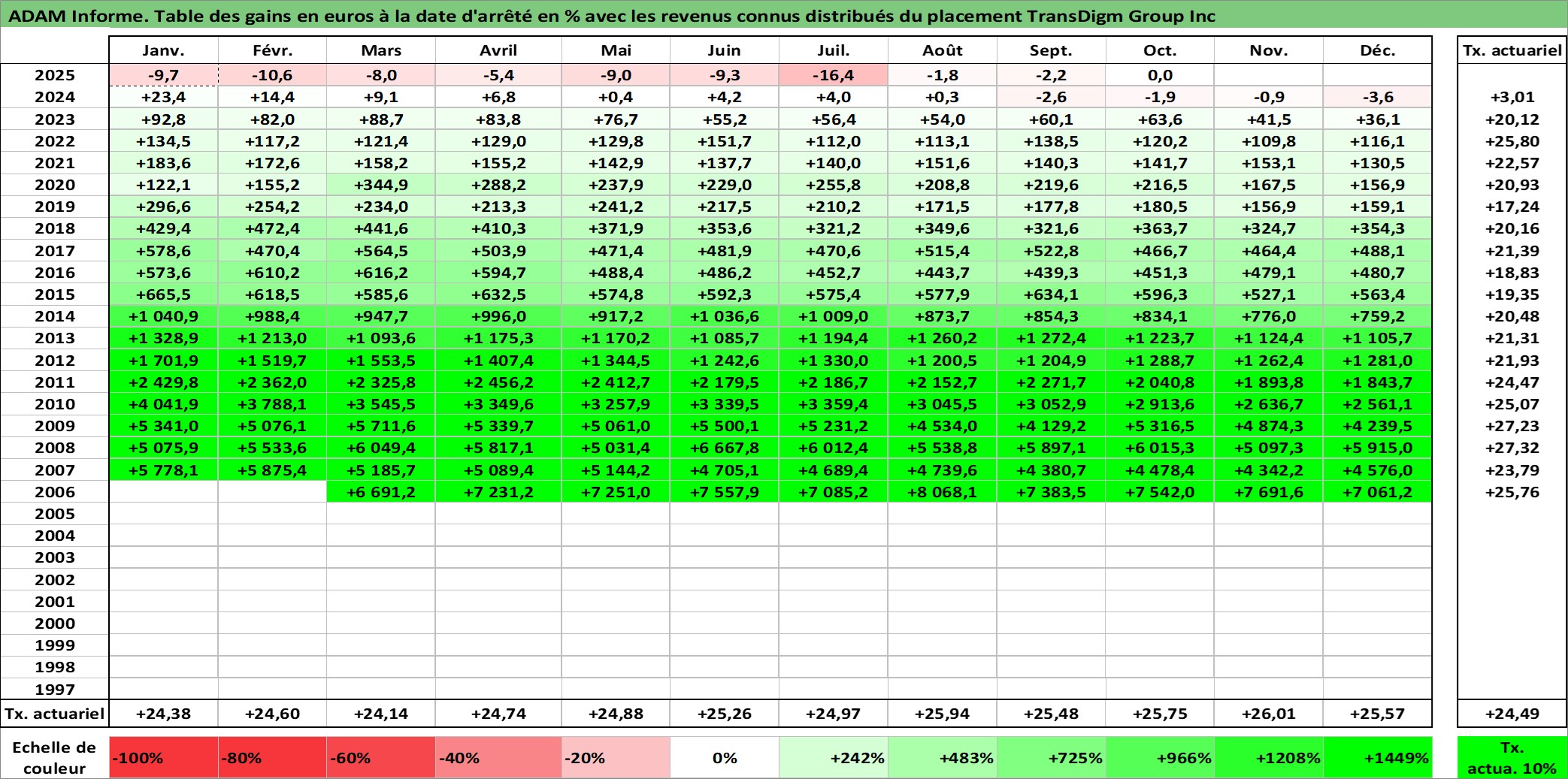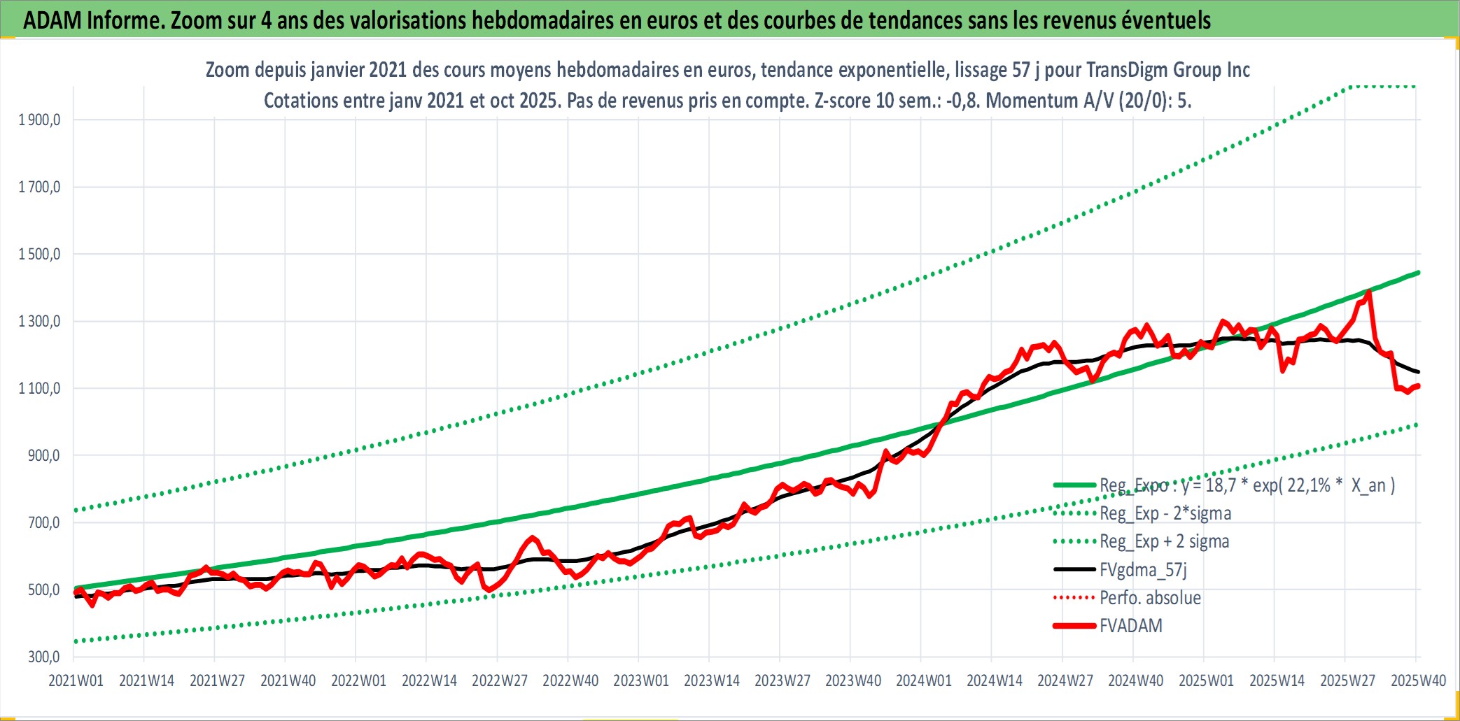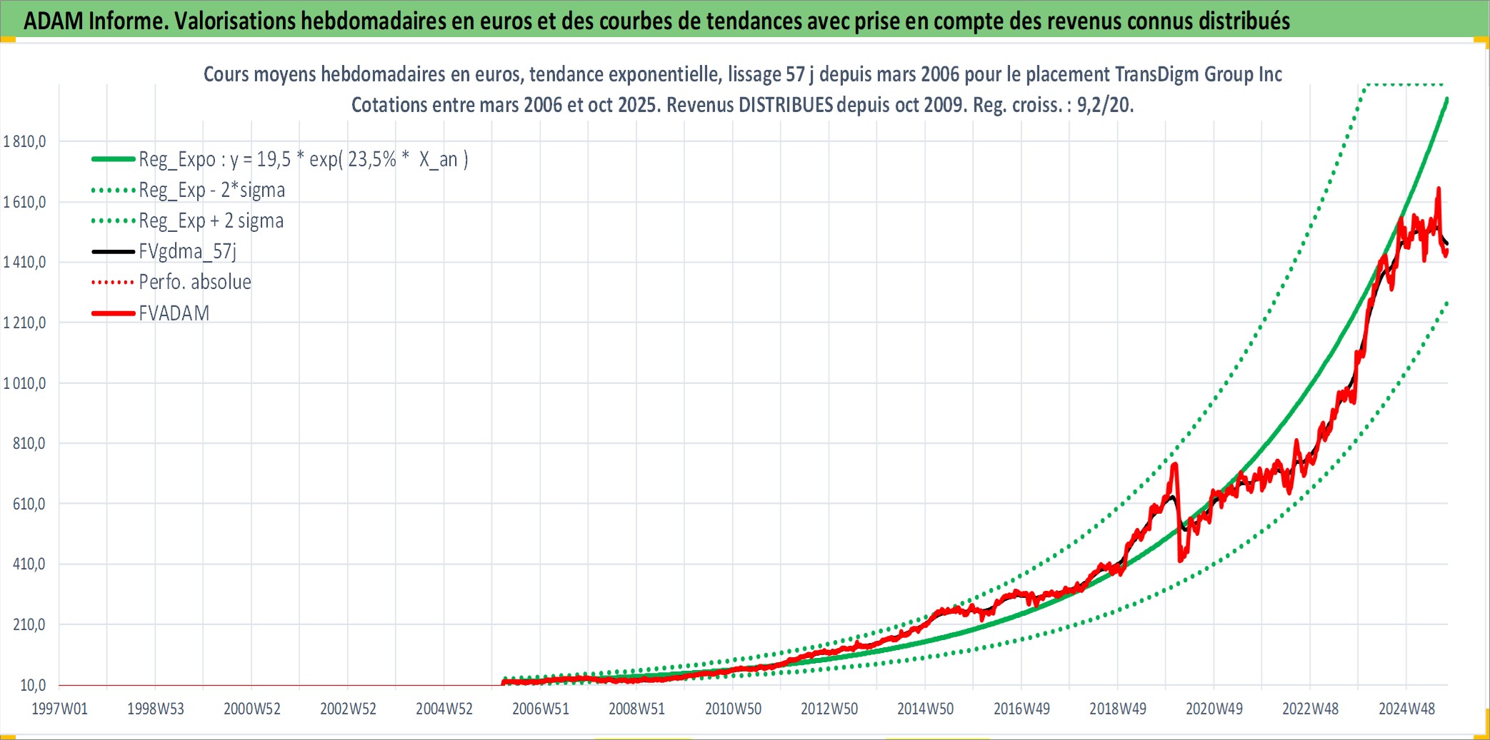 Site dédié aux investisseursPage dédiée sur site financeAnalyse des valorisations hebdomadaires de l'action TransDigm Group Inc. Cet actif est cote en USD. Les valorisations sont en contrevaleur EURO et couvrent les semaines 2006W11 a 2025W40. Les revenus de cet actif financier sont pris en compte depuis la semaine 2009W42. La note globale ESG de cet actif est estimee a 2.0 (apres rebasage entre 0 et 20).
