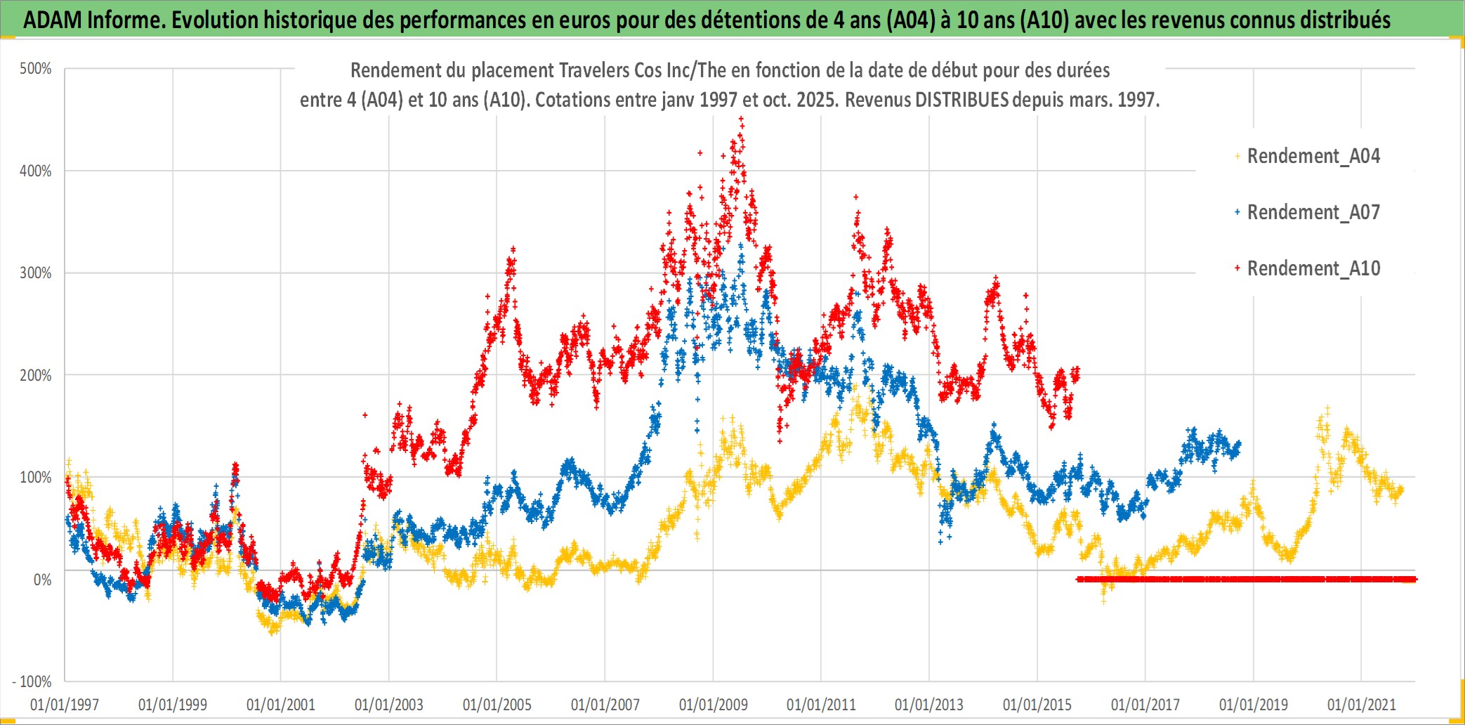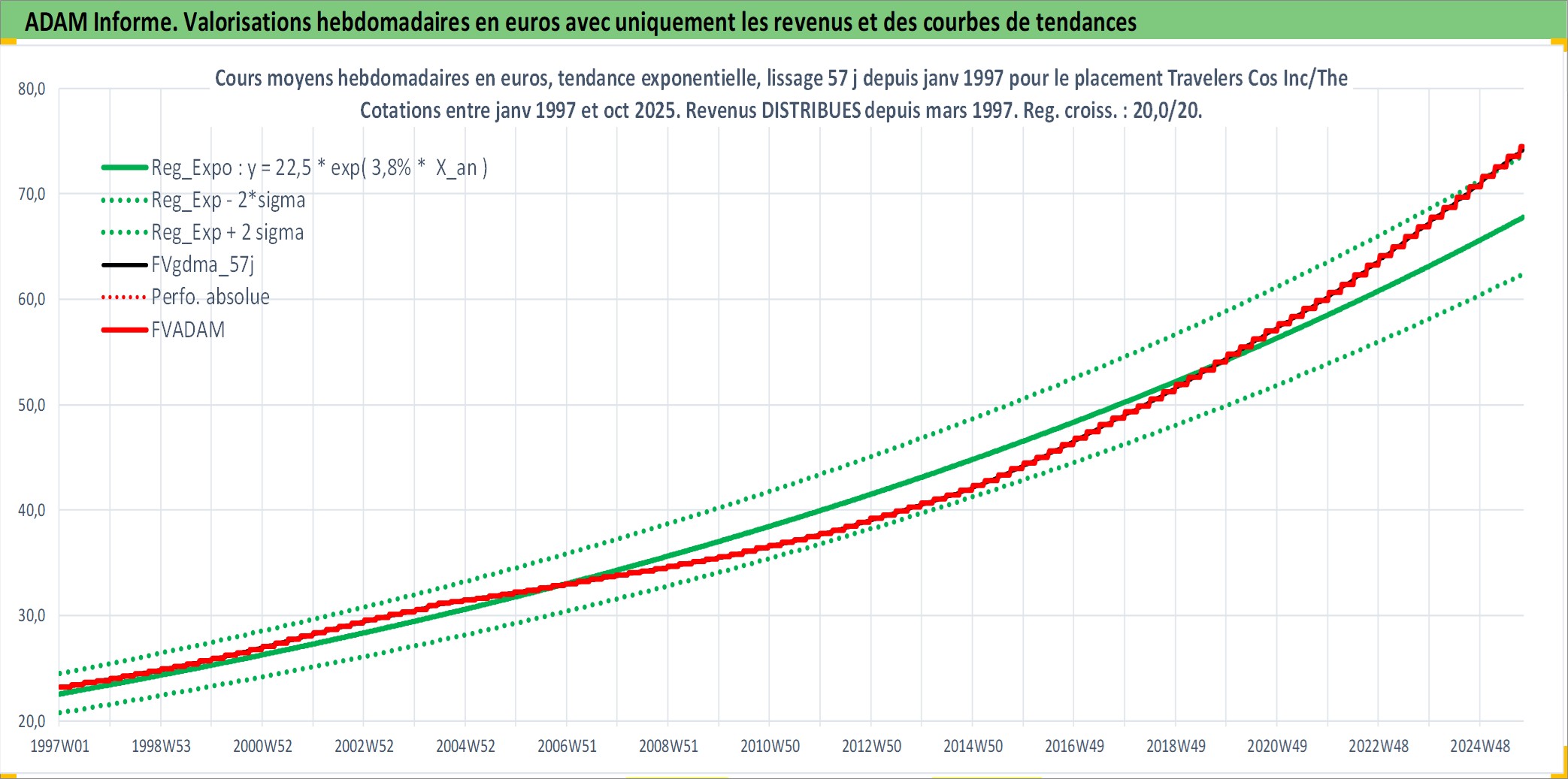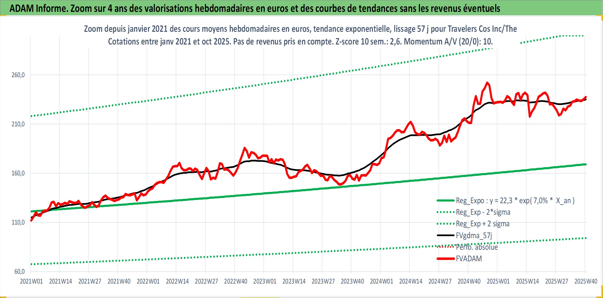 Site dédié aux investisseursPage dédiée sur site financeAnalyse des valorisations hebdomadaires de l'action Travelers Cos Inc/The. Cet actif est cote en USD. Les valorisations sont en contrevaleur EURO et couvrent les semaines 1997W01 a 2025W40. Les revenus de cet actif financier sont pris en compte depuis la semaine 1997W13. La note globale ESG de cet actif est estimee a 10.0 (apres rebasage entre 0 et 20).