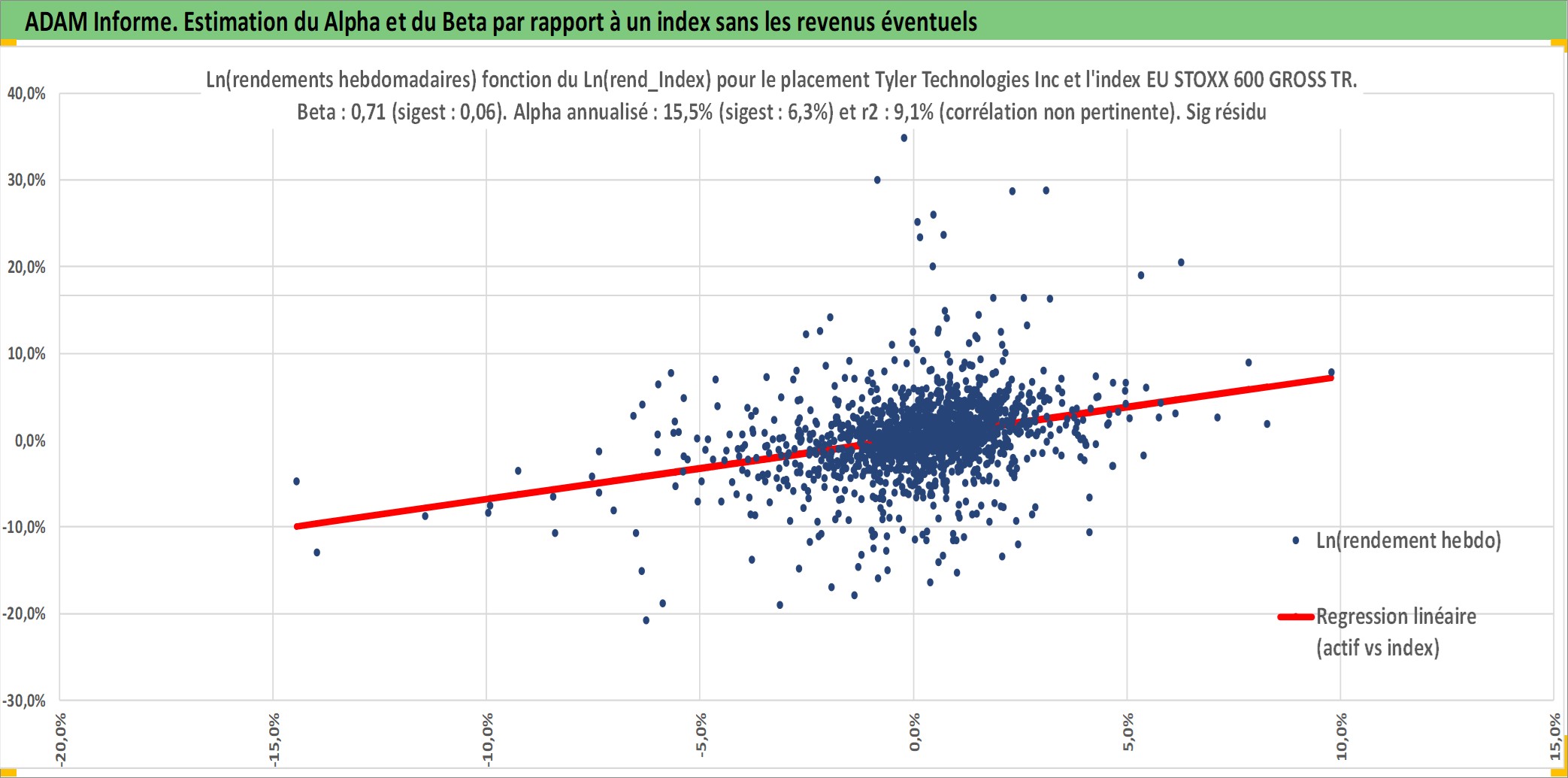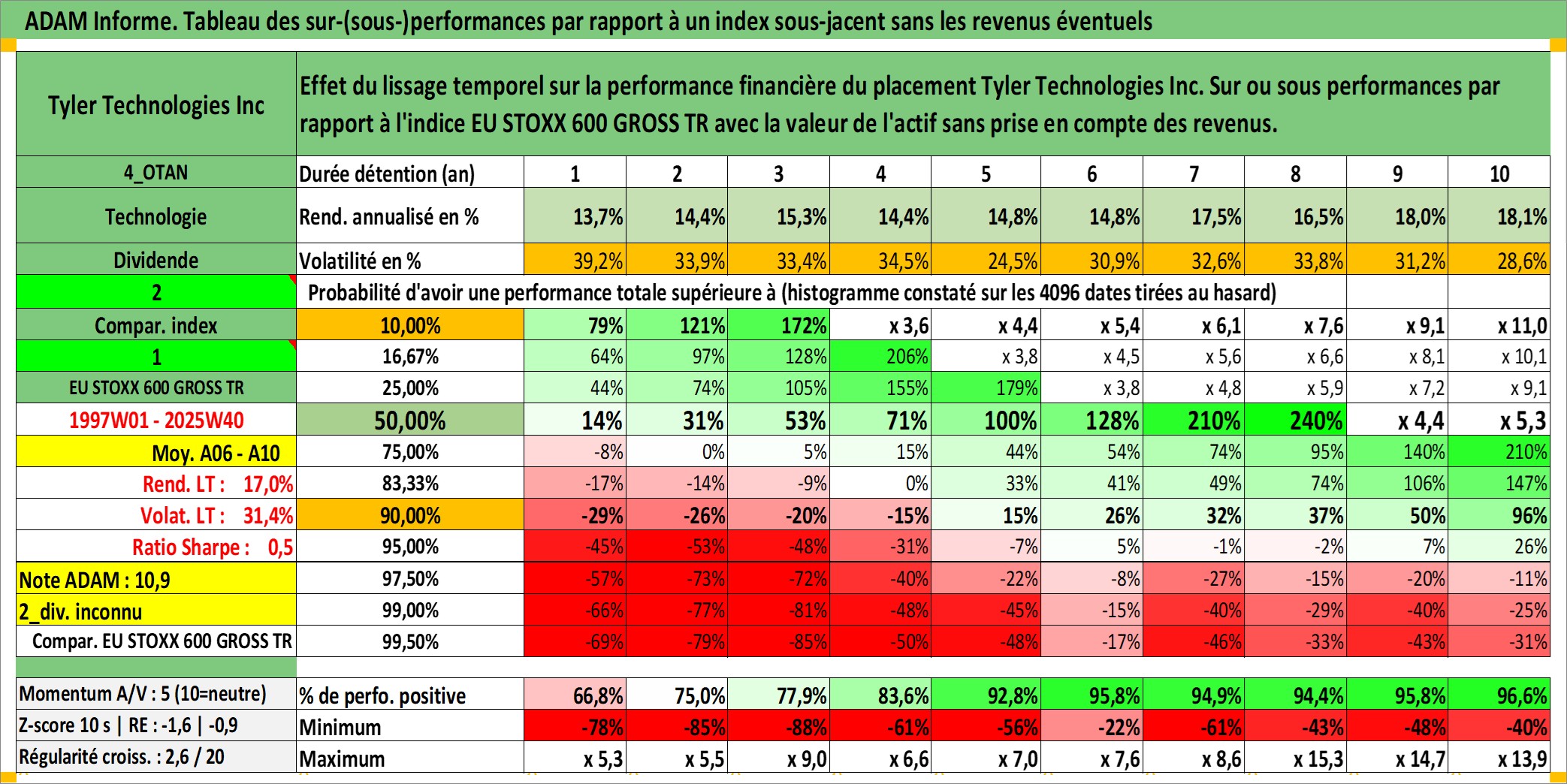 Site dédié aux investisseursPage dédiée sur site financeAnalyse des valorisations hebdomadaires de l'action Tyler Technologies Inc. Cet actif est cote en USD. Les valorisations sont en contrevaleur EURO et couvrent les semaines 1997W01 a 2025W40. Les revenus de cet actif financier ne sont pas connus car non existants ou non disponibles sur le site Yahoo Finance. La note ESG de cet actif n'est pas connue.