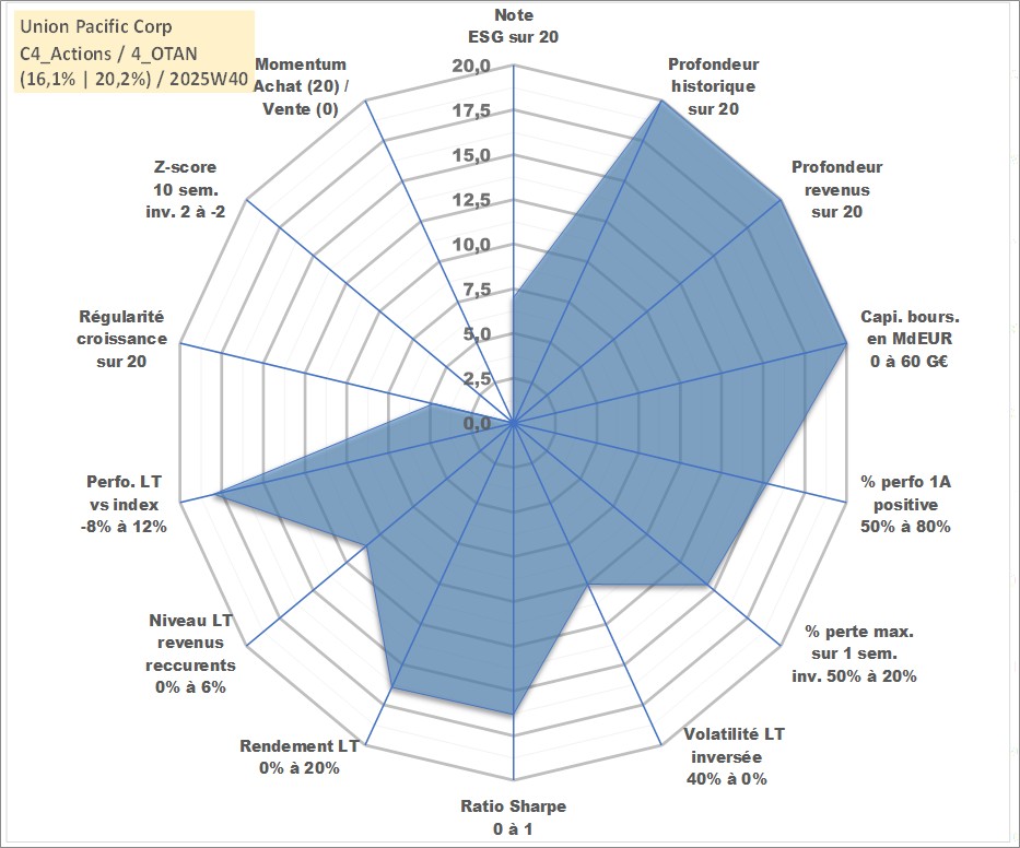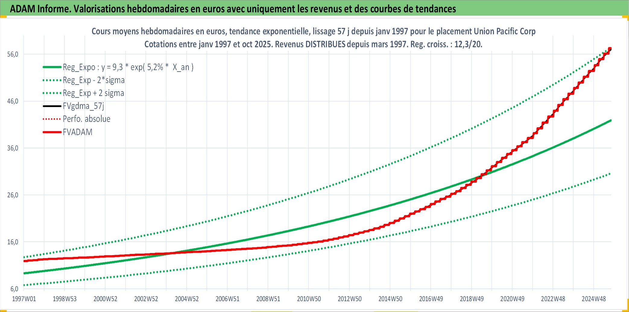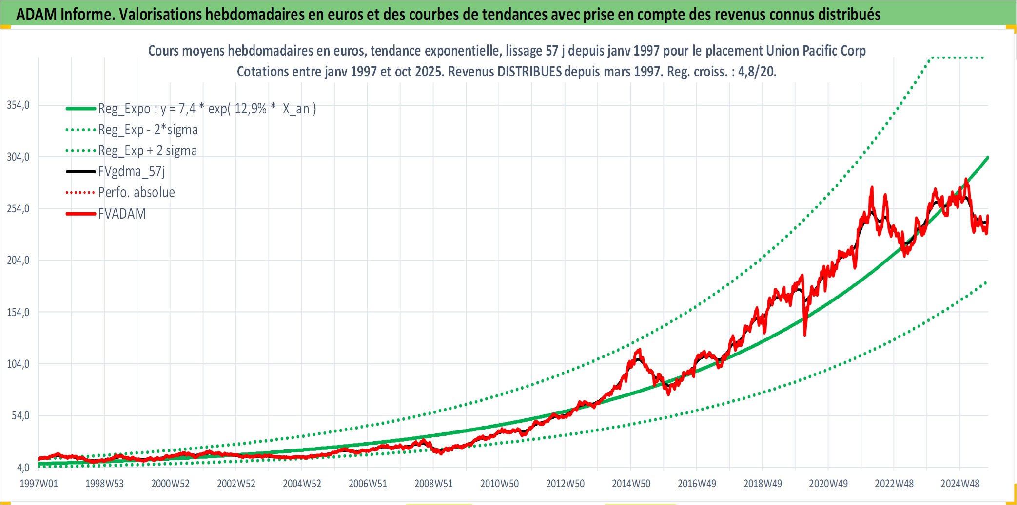 Site dédié aux investisseursPage dédiée sur site financeAnalyse des valorisations hebdomadaires de l'action Union Pacific Corp. Cet actif est cote en USD. Les valorisations sont en contrevaleur EURO et couvrent les semaines 1997W01 a 2025W40. Les revenus de cet actif financier sont pris en compte depuis la semaine 1997W11. La note globale ESG de cet actif est estimee a 7.0 (apres rebasage entre 0 et 20).
