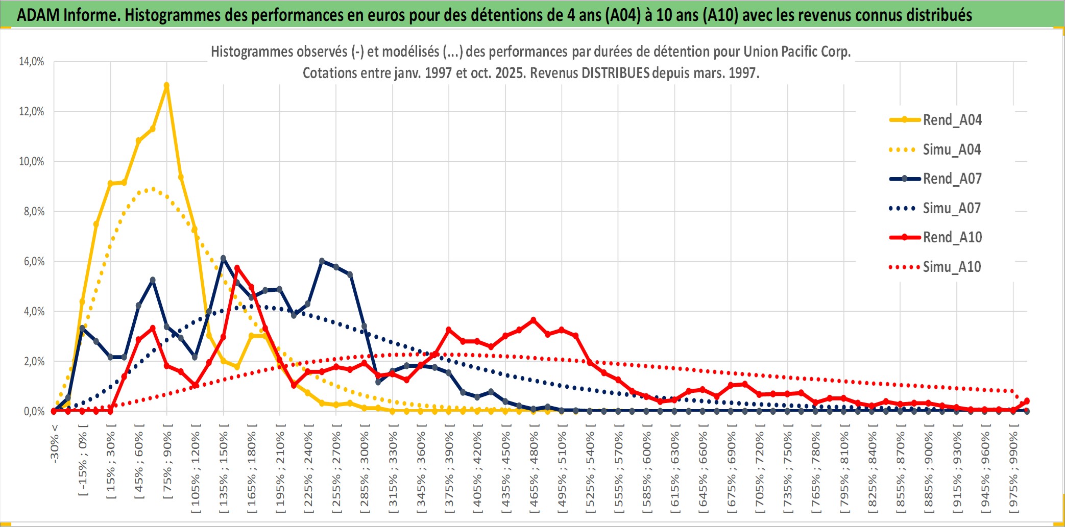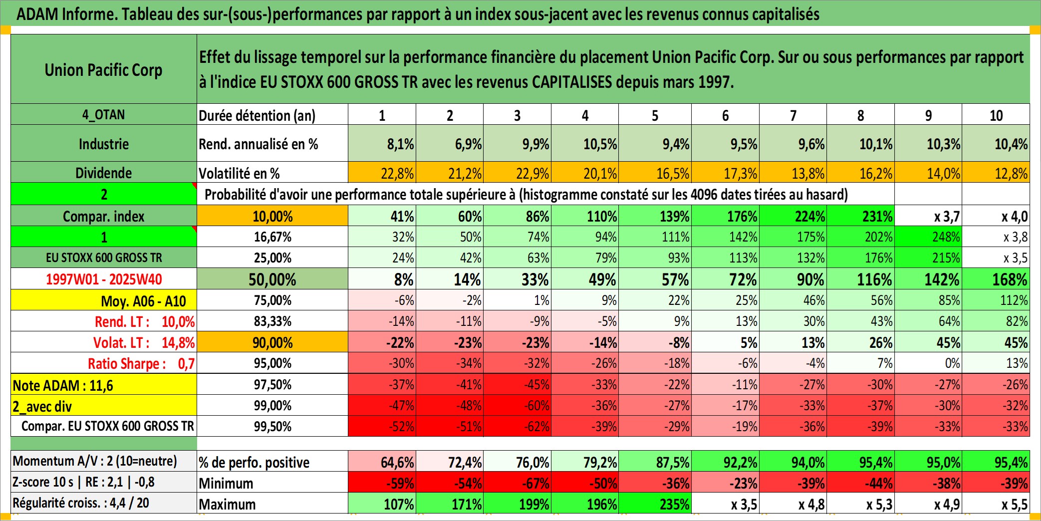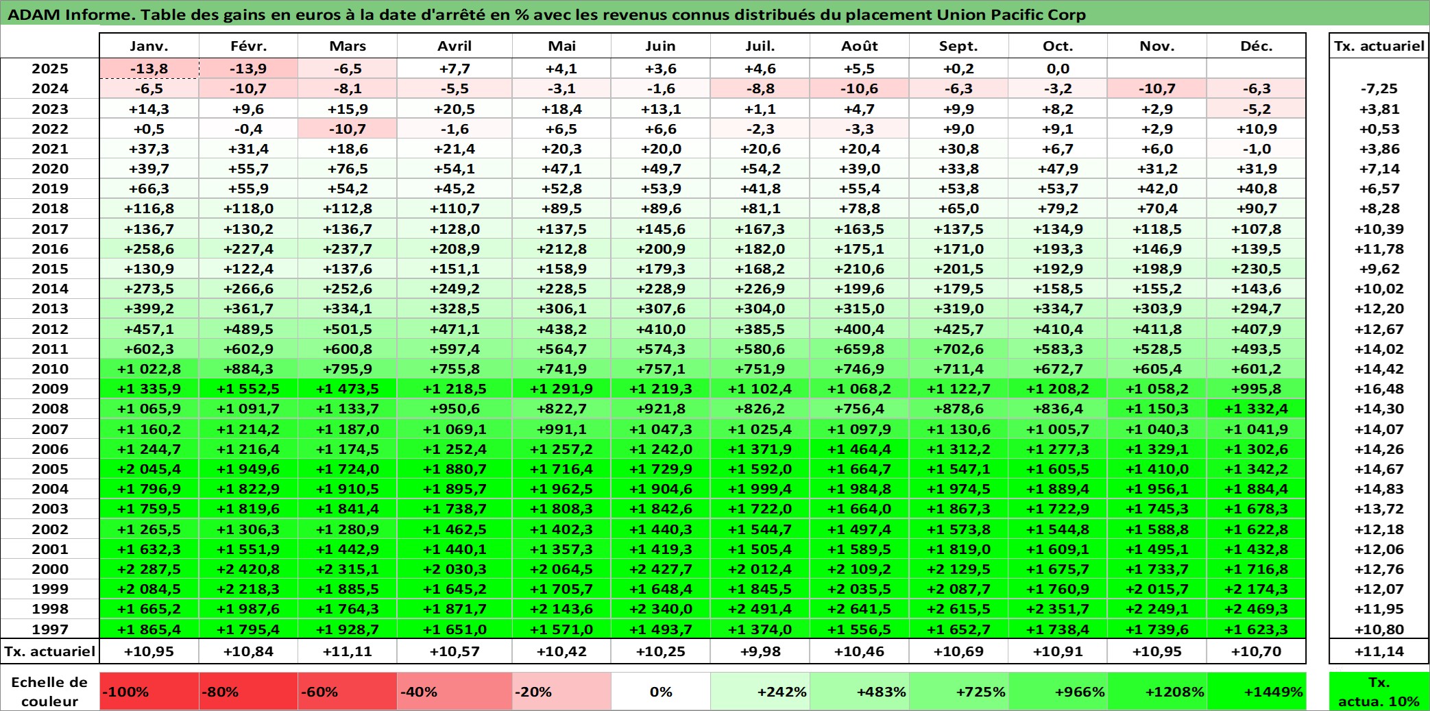 Site dédié aux investisseursPage dédiée sur site financeAnalyse des valorisations hebdomadaires de l'action Union Pacific Corp. Cet actif est cote en USD. Les valorisations sont en contrevaleur EURO et couvrent les semaines 1997W01 a 2025W40. Les revenus de cet actif financier sont pris en compte depuis la semaine 1997W11. La note globale ESG de cet actif est estimee a 7.0 (apres rebasage entre 0 et 20).