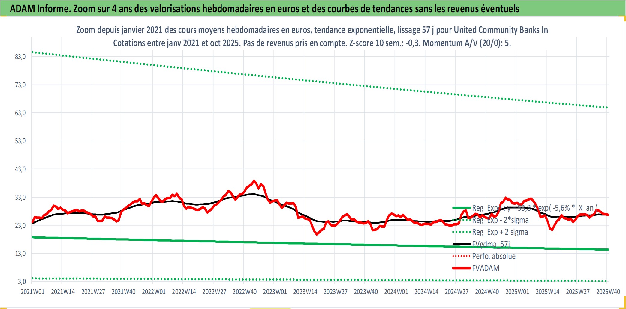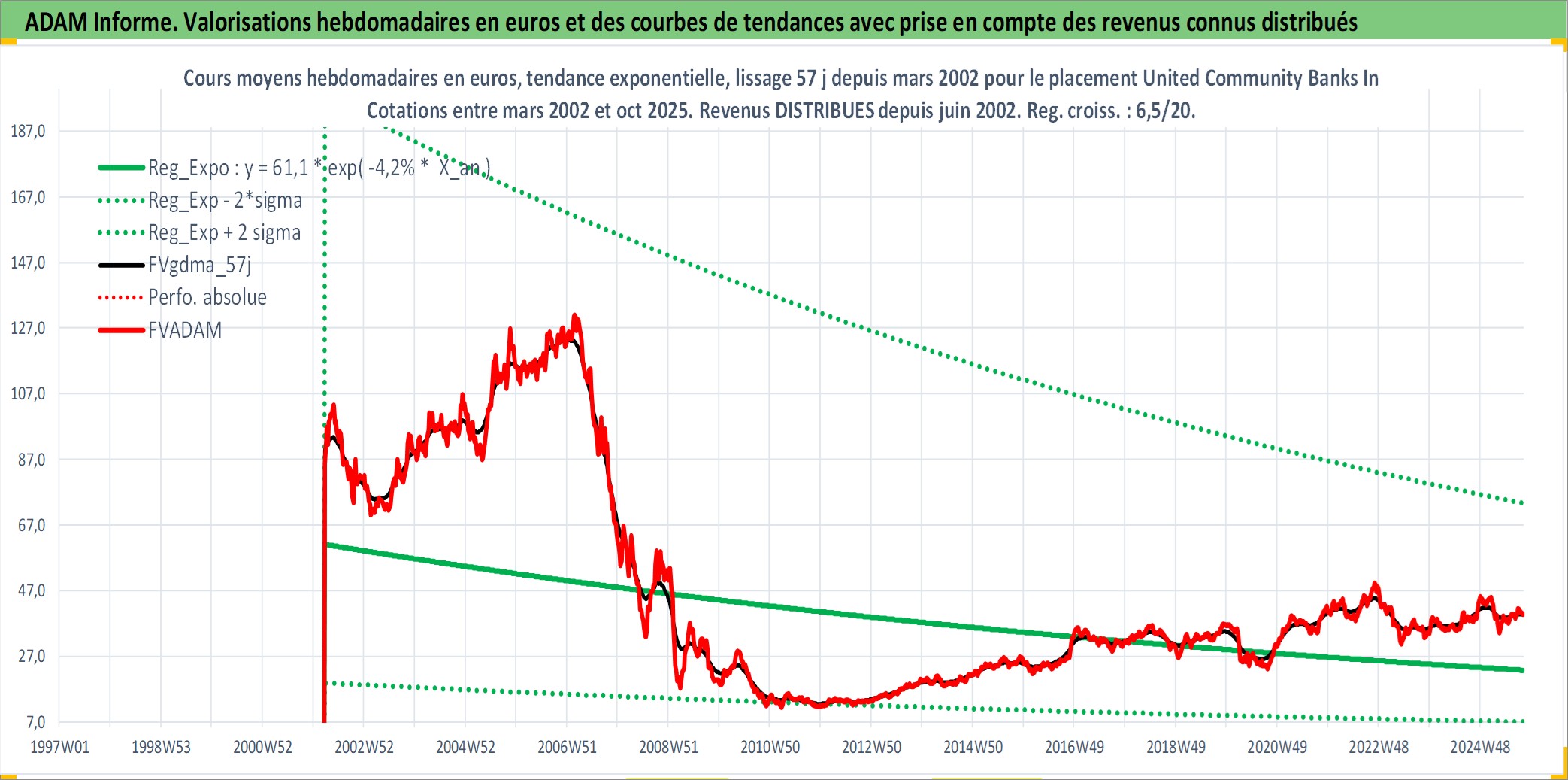 Site dédié aux investisseursPage dédiée sur site financeAnalyse des valorisations hebdomadaires de l'action United Community Banks Inc. Cet actif est cote en USD. Les valorisations sont en contrevaleur EURO et couvrent les semaines 2002W12 a 2025W40. Les revenus de cet actif financier sont pris en compte depuis la semaine 2002W24. La note ESG de cet actif n'est pas connue.