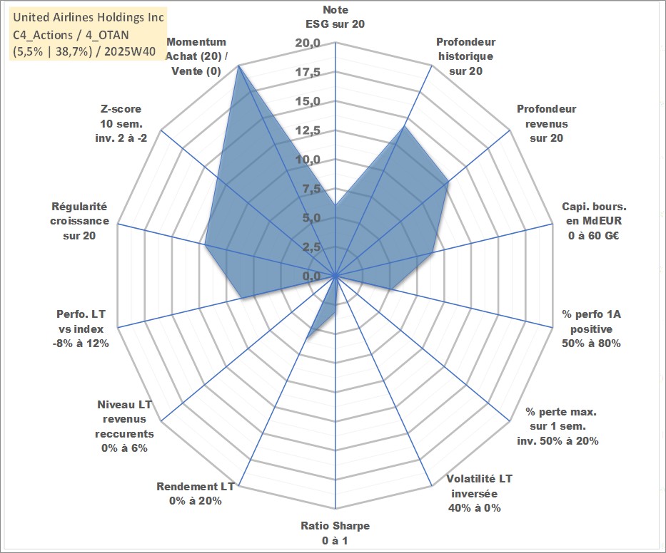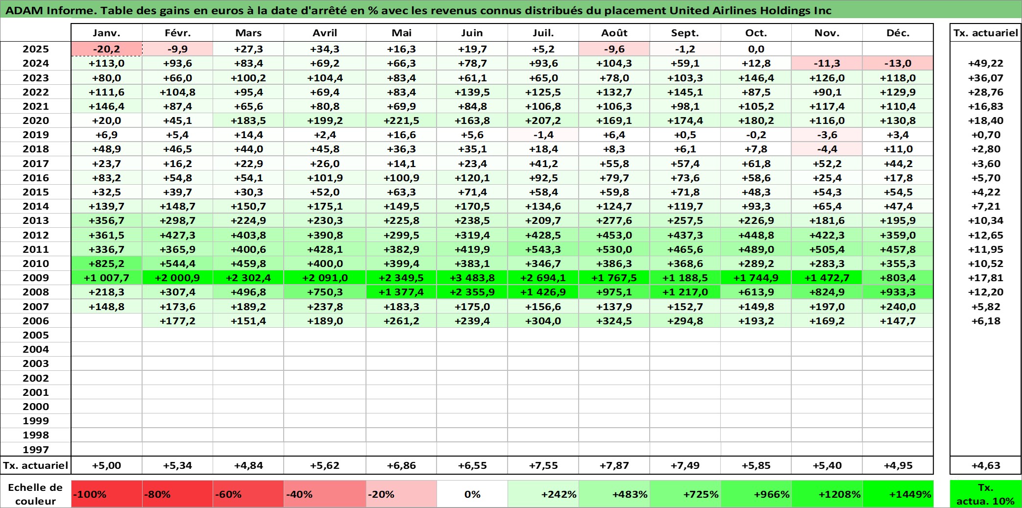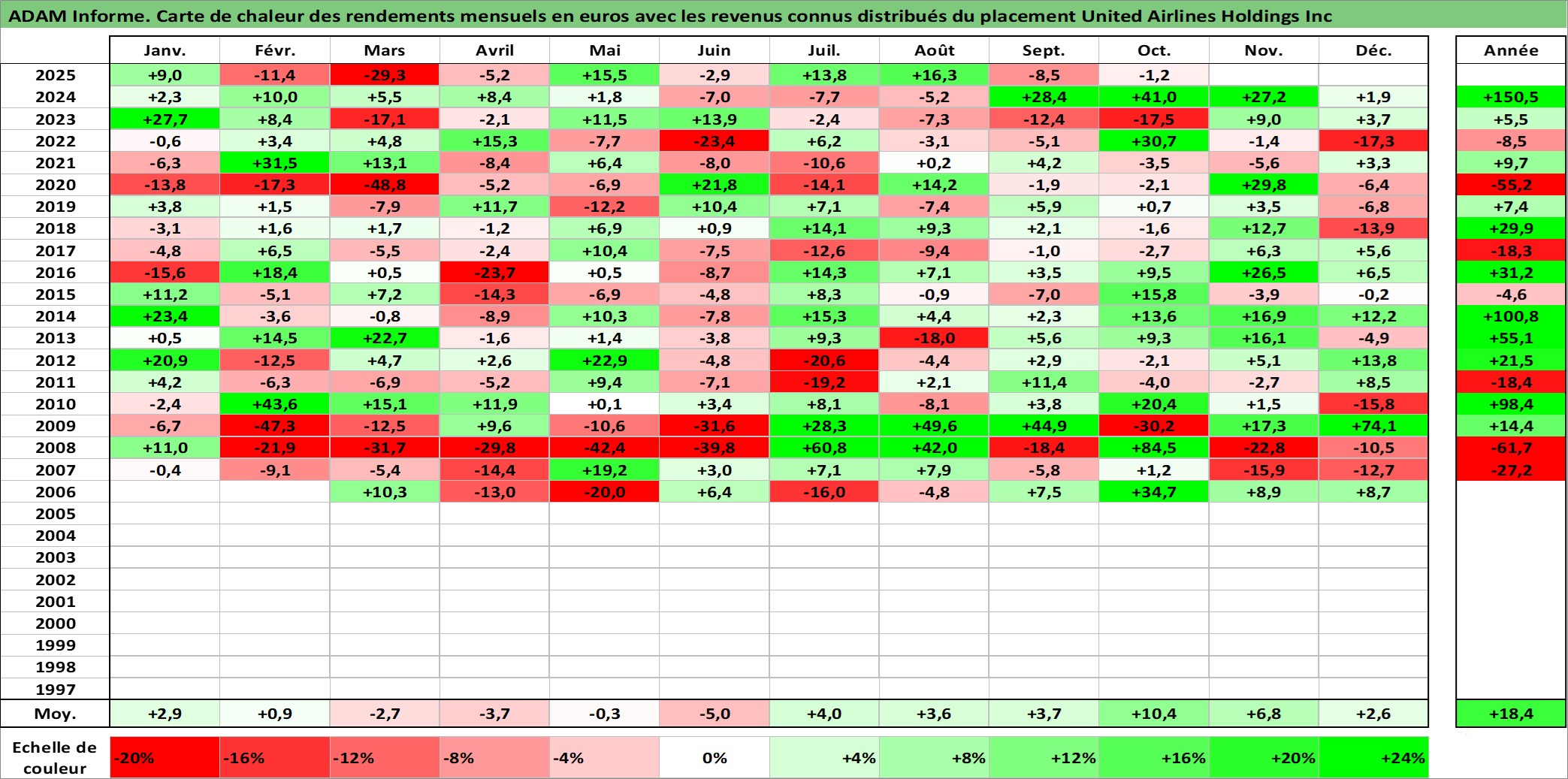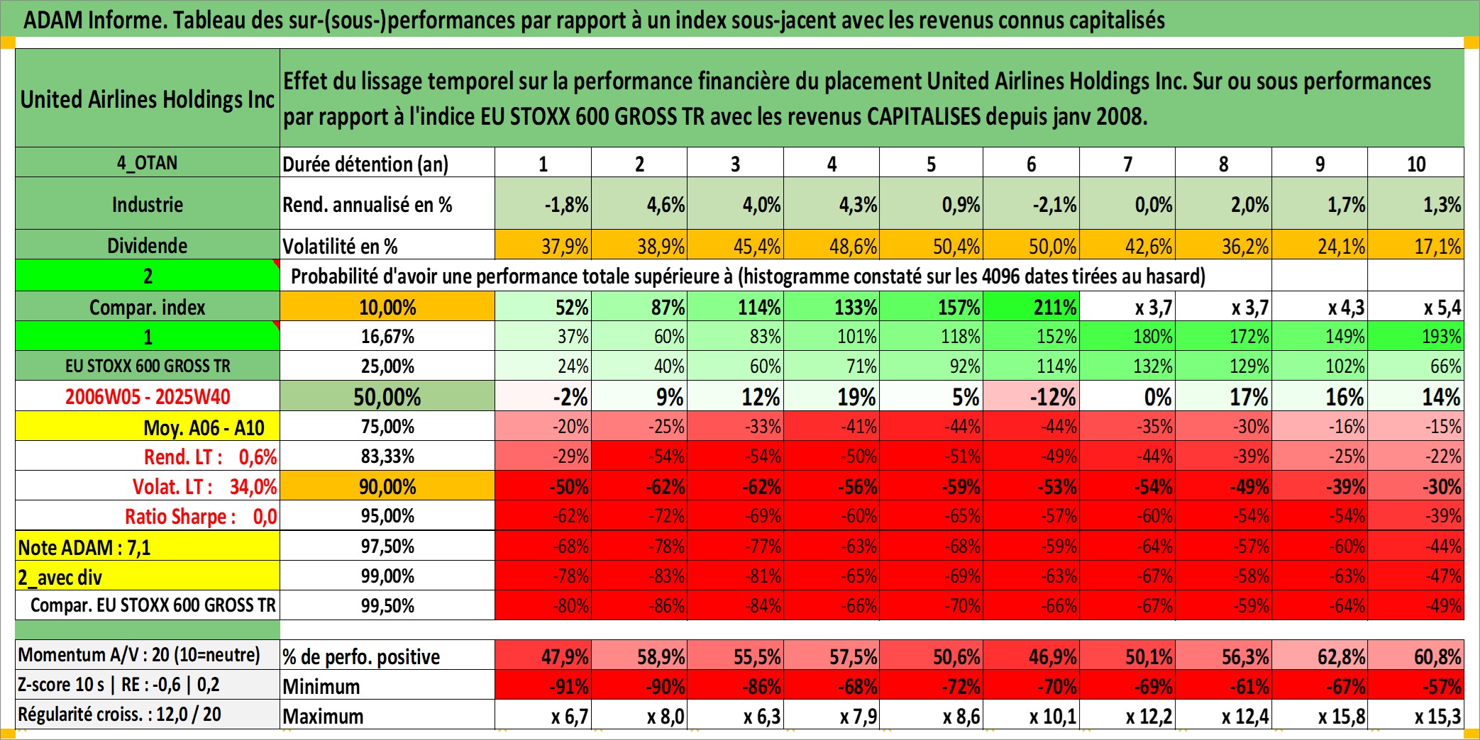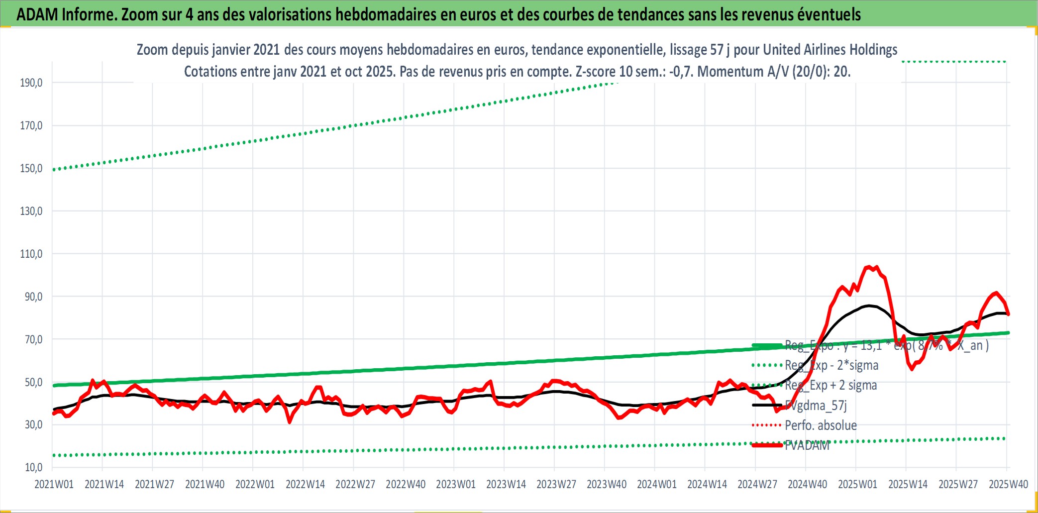 Site dédié aux investisseursPage dédiée sur site financeAnalyse des valorisations hebdomadaires de l'action United Airlines Holdings Inc. Cet actif est cote en USD. Les valorisations sont en contrevaleur EURO et couvrent les semaines 2006W05 a 2025W40. Les revenus de cet actif financier sont pris en compte depuis la semaine 2008W02. La note globale ESG de cet actif est estimee a 6.0 (apres rebasage entre 0 et 20).