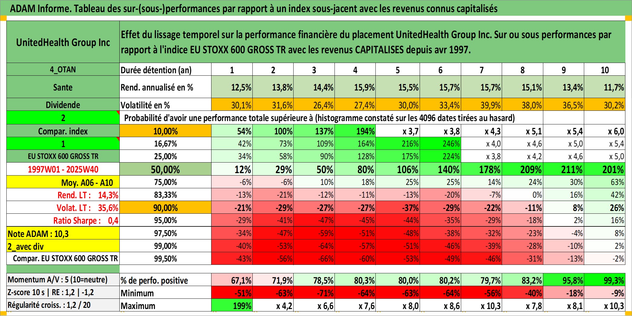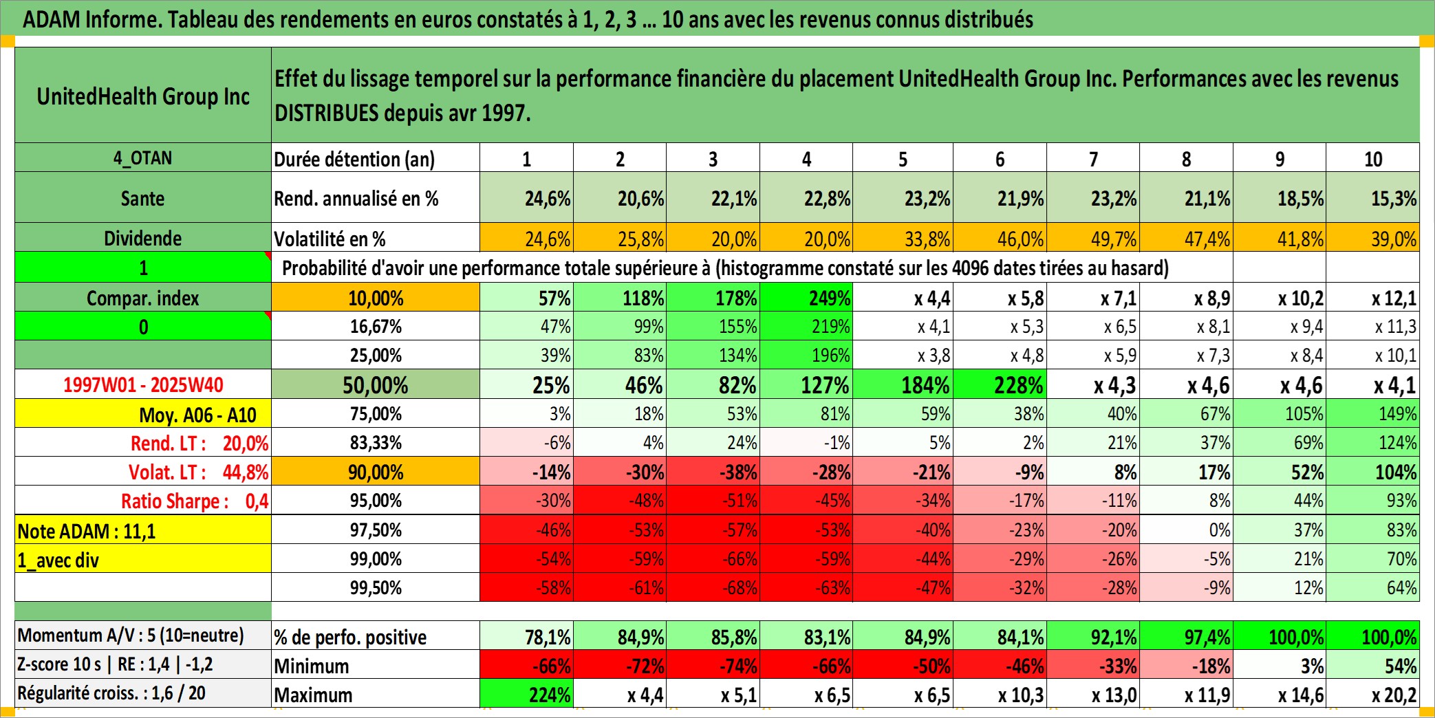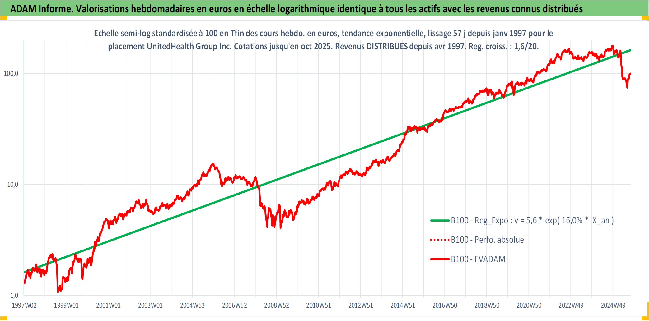 Site dédié aux investisseursPage dédiée sur site financeAnalyse des valorisations hebdomadaires de l'action UnitedHealth Group Inc. Cet actif est cote en USD. Les valorisations sont en contrevaleur EURO et couvrent les semaines 1997W01 a 2025W40. Les revenus de cet actif financier sont pris en compte depuis la semaine 1997W14. La note globale ESG de cet actif est estimee a 11.0 (apres rebasage entre 0 et 20).
