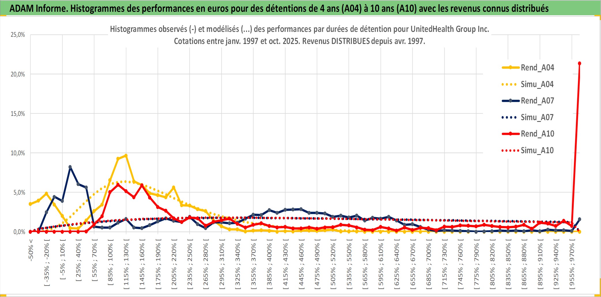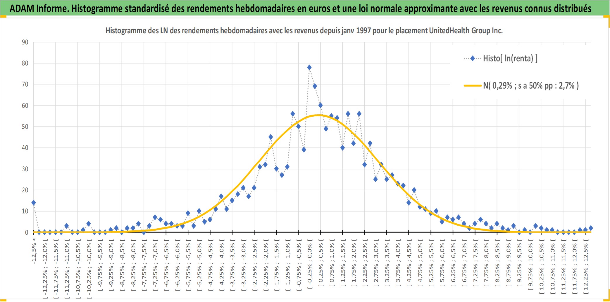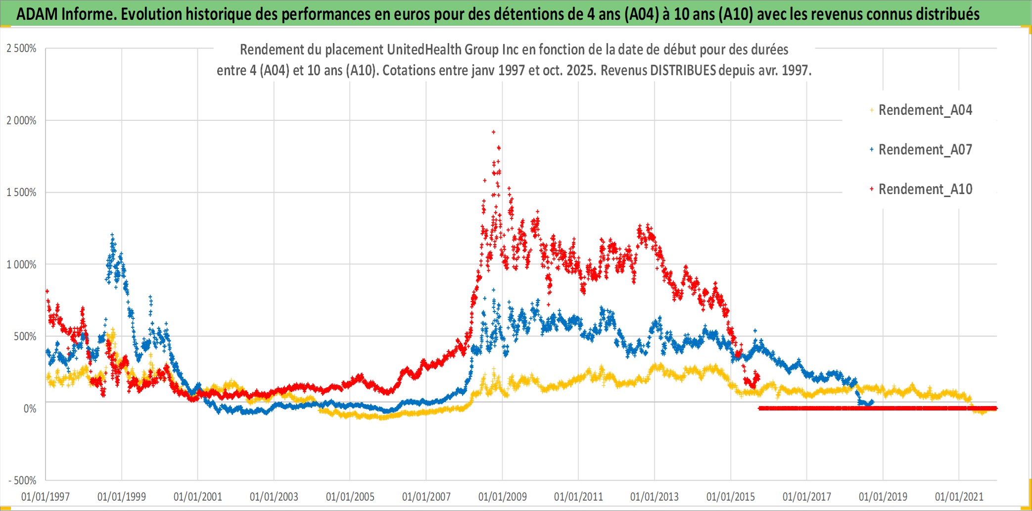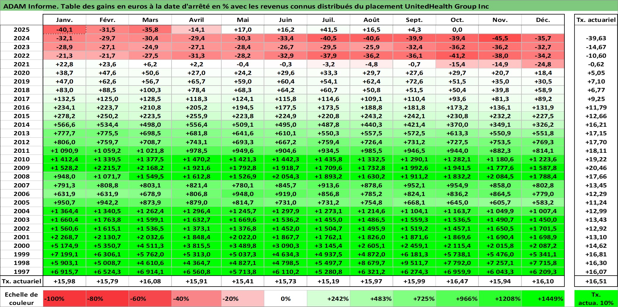 Site dédié aux investisseursPage dédiée sur site financeAnalyse des valorisations hebdomadaires de l'action UnitedHealth Group Inc. Cet actif est cote en USD. Les valorisations sont en contrevaleur EURO et couvrent les semaines 1997W01 a 2025W40. Les revenus de cet actif financier sont pris en compte depuis la semaine 1997W14. La note globale ESG de cet actif est estimee a 11.0 (apres rebasage entre 0 et 20).
