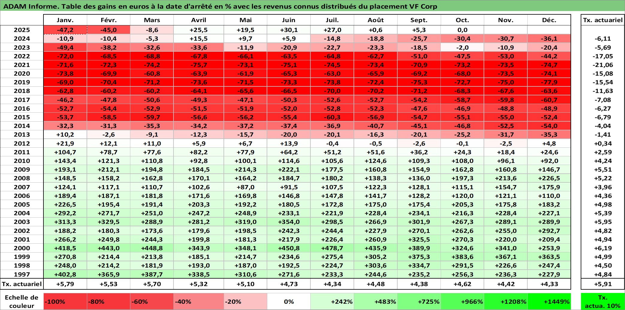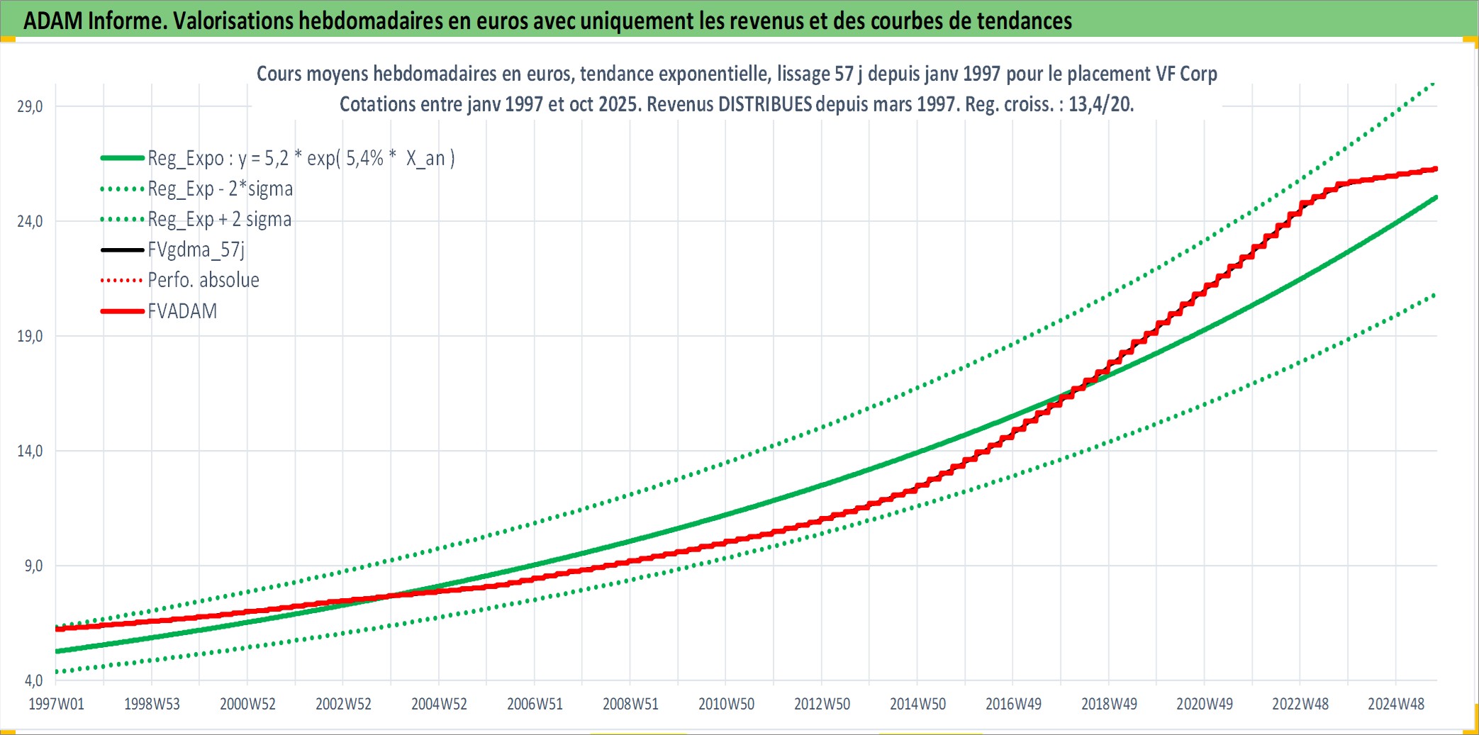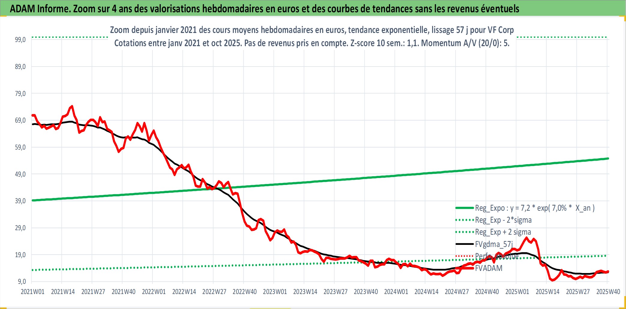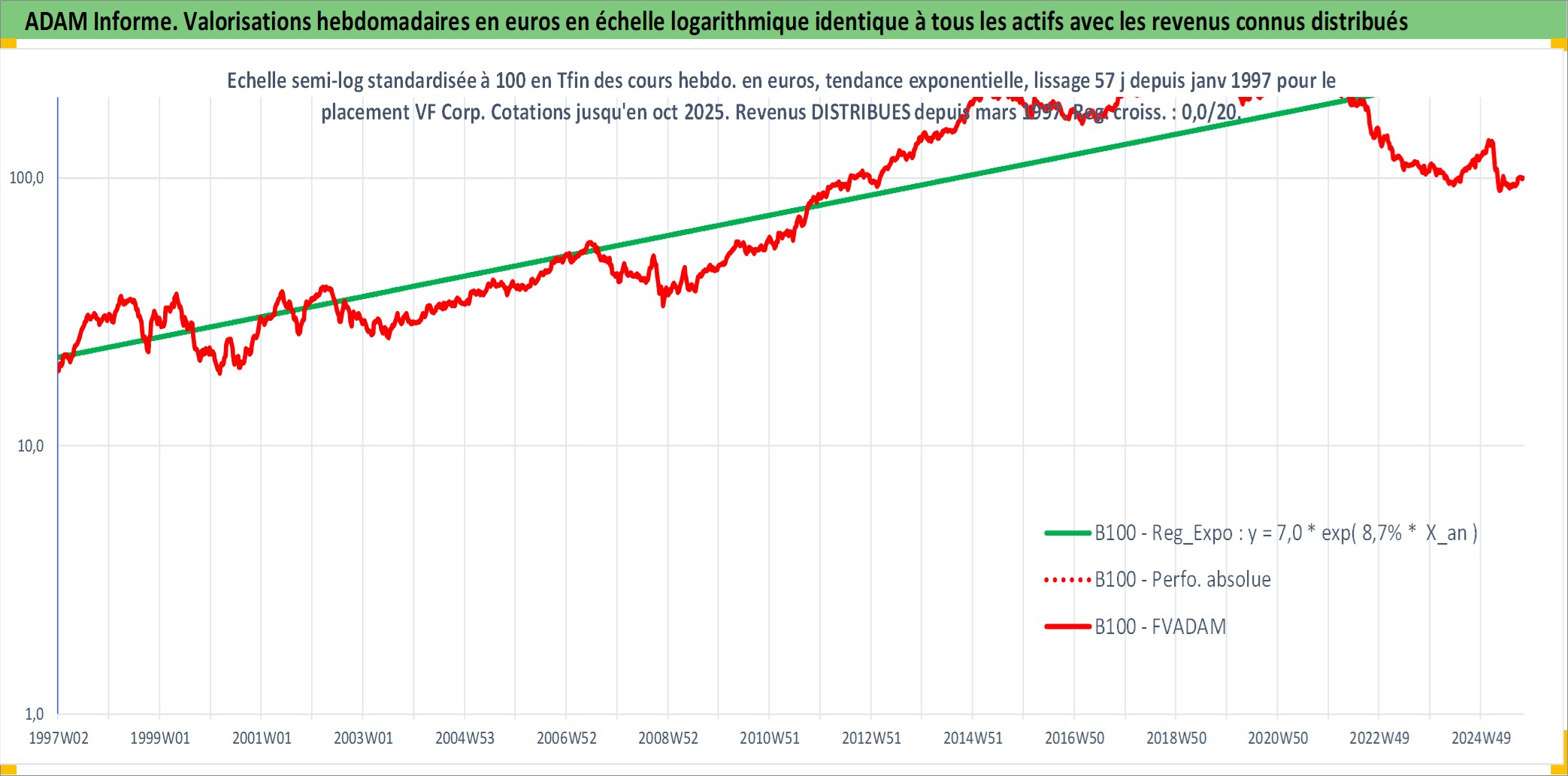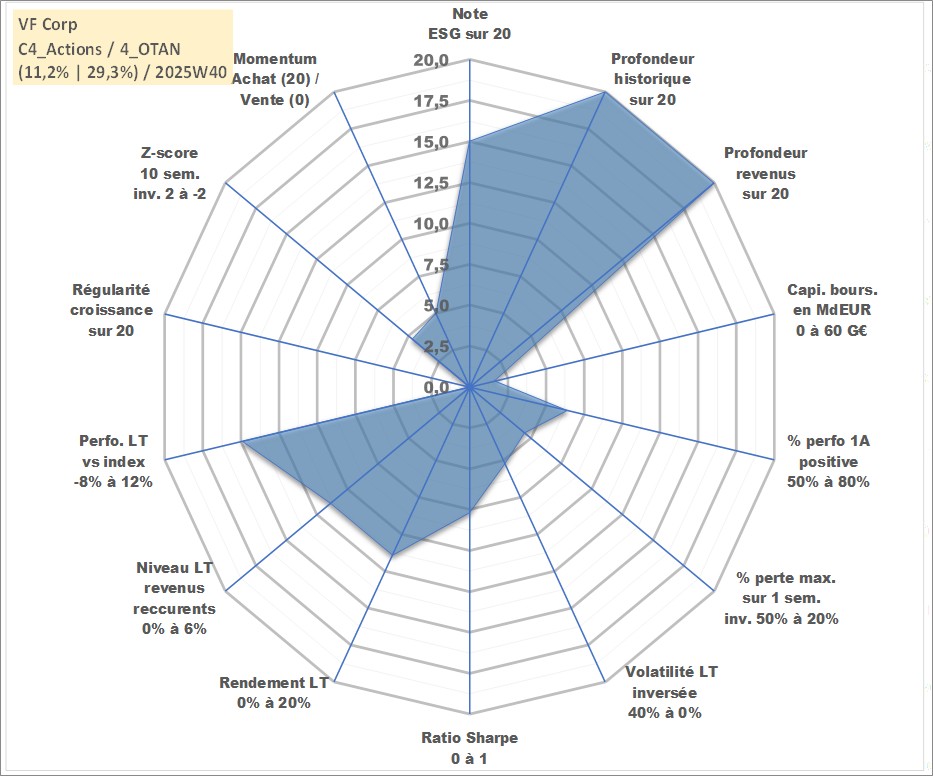 Site dédié aux investisseursPage dédiée sur site financeAnalyse des valorisations hebdomadaires de l'action VF Corp. Cet actif est cote en USD. Les valorisations sont en contrevaleur EURO et couvrent les semaines 1997W01 a 2025W40. Les revenus de cet actif financier sont pris en compte depuis la semaine 1997W10. La note globale ESG de cet actif est estimee a 15.0 (apres rebasage entre 0 et 20).